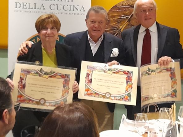 Nella raffinata cornice del ristorante "Massimiliano Poggi Cucina" a Trebbo di Reno (Castel Maggiore-BO), in una bella atmosfera di festa, la Delegazione di Bologna ha consegnato il diploma del Premio Nuvoletti 2022 a Vincenzo Cappelletti e Guido Paulato, due ristoratori che, da soli o in coppia, hanno contribuito a svecchiare il mondo della ristorazione bolognese, senza mai eludere il rapporto con le solide radici della tradizione gastronomica bolognese. La elaborata cucina dello chef Max Poggi, (anch’egli talentuoso ricercatore dell’inedito e al contempo seguace della tradizione), ha accompagnato i vari momenti della serata, con il menù concordato con la Delegata e Simposiarca della serata Cristina Bragaglia, in cui le novità si alternavano ai classici bolognesi della cucina di Natale, immancabili nella cena degli auguri.