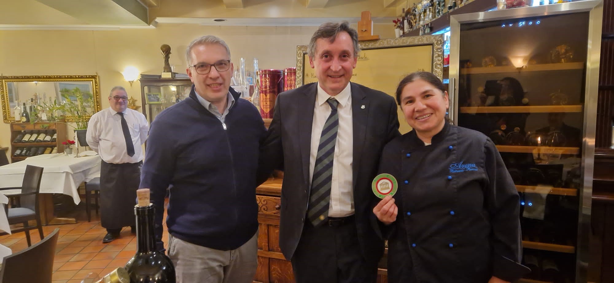 Dopo due anni senza essersi riuniti per la cena degli auguri, la Delegazione di Colonia (foto 1 e 2) si è ritrovata al ristorante Arena con un focus sulla cucina pugliese, ampiamente soddisfatto dalla chef Giuseppina Arena, moglie del titolare Giuseppe (foto 3, cuoca e titolare ricevono dal Delegato Vincenzo Pennetta la vetrofania 2022). L’Accademico Mario Colavita ha intrattenuto gli ospiti con una esaudiente presentazione di tutti i piatti e prodotti tipici pugliesi. Si è iniziato con un assaggio a sorpresa di un risotto al nero di seppia con burattina, seguito da un mix di antipasti con delizie pugliesi e non solo, per poi proseguire con delle orecchiette alle cime di rapa con vongole ed un ottimo pesce spada agli aromi invernali. Lo spumone leccese che ha concluso degnamente la serata (piatti in foto 4). Ottimo l’abbinamento dei vini con Malvasia e primitivo di Manduria. La numerosa partecipazione e l’entusiasmo nel ritrovarsi insieme dopo tanto tempo hanno reso la serata piacevole e si è percepito, concretamente, lo spirito di amicizia che unisce tutta la Delegazione di Colonia.