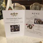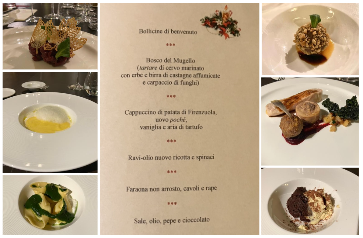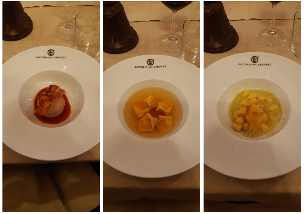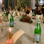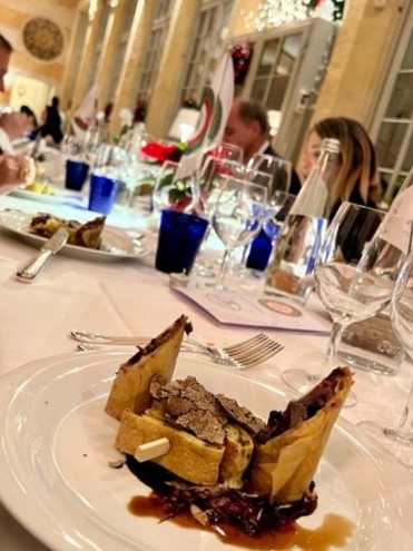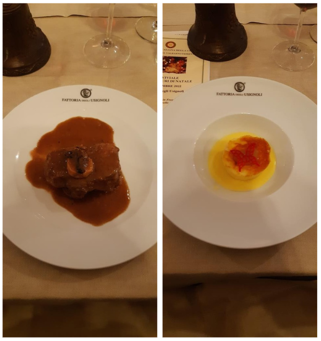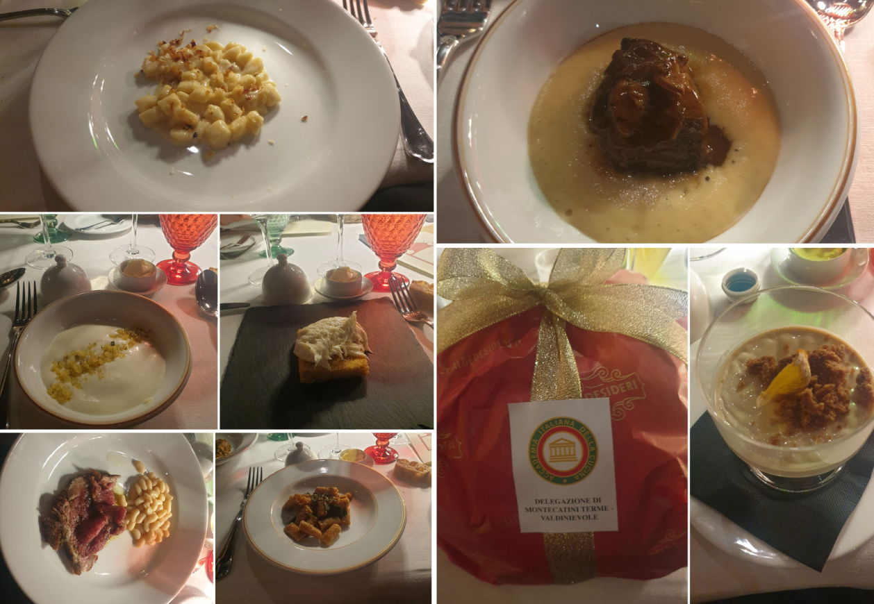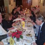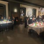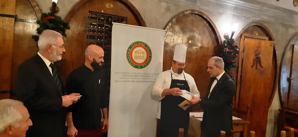 Per la conviviale degli auguri di Natale, la Delegazione si è riunita presso il ristorante della Fattoria degli Usignoli, un bellissimo relais posto ai piedi del Pratomagno, a San Donato in Fronzano, nel comune di Reggello. Grazie all’impegno del Simposiarca Andrea Barocchi, alla cortesia e disponibilità del general manager, Roberto Tozzi, e alla professionalità e fantasia dello chef Simone Gronchi, è stato proposto un menù di indubbio valore, con tipiche ricette delle feste, ma con quel pizzico di inventiva in più per rendere attuali anche i piatti più “storicamente” tradizionali. Dopo un calice di benvenuto, si sono susseguiti: flan alla cipolla di Certaldo con crema di pomodorini confit e tarese del Valdarno croccante, tortellini in brodo di cappone, gnocchetti di patate di Cetica con sedano e Castelmagno (foto 1), Tournedos di manzo in bassa temperatura al fegato grasso e tartufo di stagione, patate di Cetica al forno, cannellini e verdure dell'orto e, per finire, tortino tiepido ai formaggi e pere con crema inglese (foto 2). La cena è trascorsa in una bella atmosfera di convivialità e di chiacchiere tra gli Accademici e i loro ospiti (foto 3). La serata si è conclusa con un brindisi, accompagnato da dolci natalizi e, a seguire, i ringraziamenti al maître Alessio Lepri e allo chef, ai quali sono stati consegnati dal Delegato Sandro Fusari e dal Simposiarca Andrea Barocchi il piatto del decennale della Delegazione e alcuni volumi dell’Accademia (Foto 4).