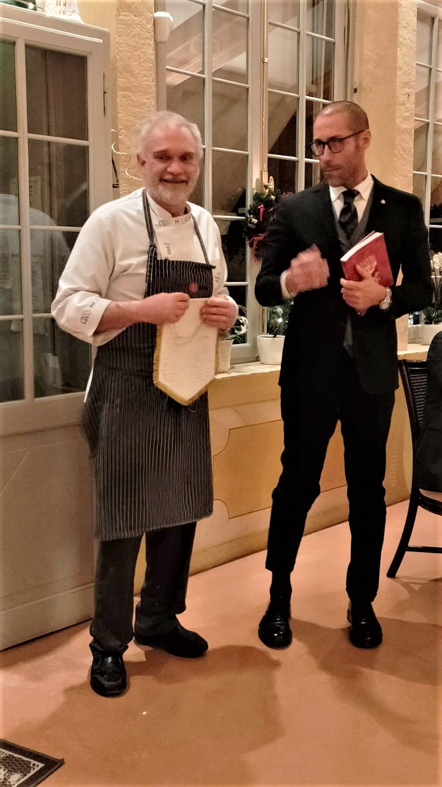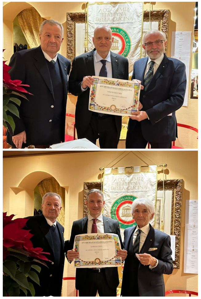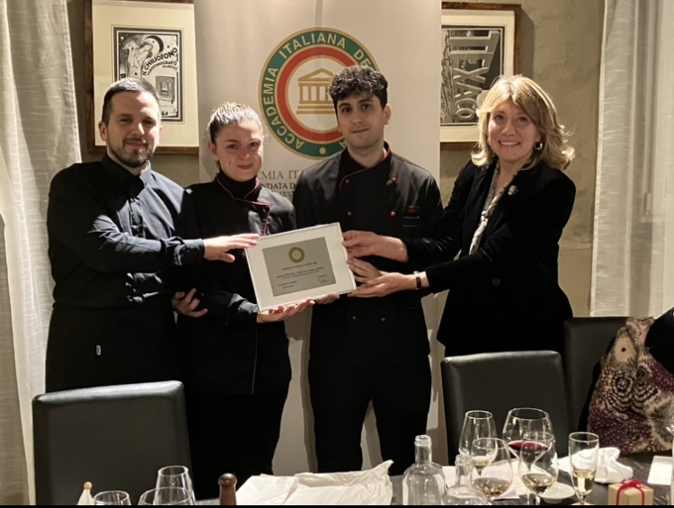 Per la riunione conviviale degli auguri gli Accademici si sono ritrovati al ristorante Gli Artisti a Borgo San Lorenzo (FI) dove, in un’atmosfera di amicizia e di festa, è avvenuta la consegna del Diploma di Buona Cucina ad Assunta Corbo, Gabriele e Nicola Tranchina. Un riconoscimento che premia l’impegno e la passione dei giovani chef di questo storico locale nella preparazione di piatti della tradizione, rivisitati in chiave contemporanea ed espressione di conoscenze e di grande abilità. Molto elevato il gradimento del menu proposto: dalla tartare di cervo marinata in una birra di castagne alla faraona in tre cotture, dal raviolo all’olio nuovo con salsa di ricotta e spinaci all’uovo in camicia affogato in una crema di patate e tartufo, per finire con uno squisito tortino al cioccolato con crema di pistacchio leggermente salato. Alla valorizzazione dei piatti ha contribuito un’accurata selezione di vini in abbinamento diversi per ogni portata. Una cucina di alto livello per una serata molto bella e densa di emozioni.