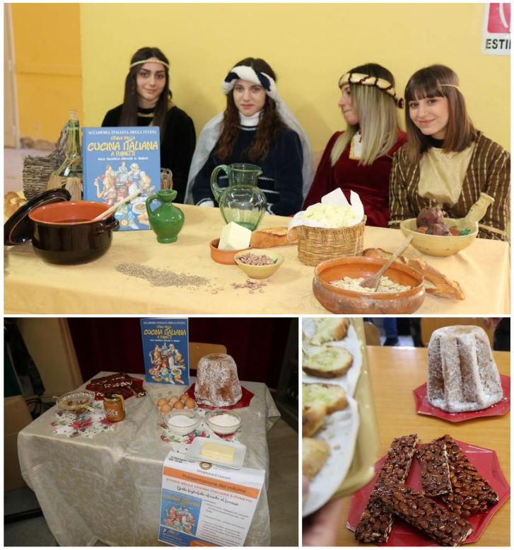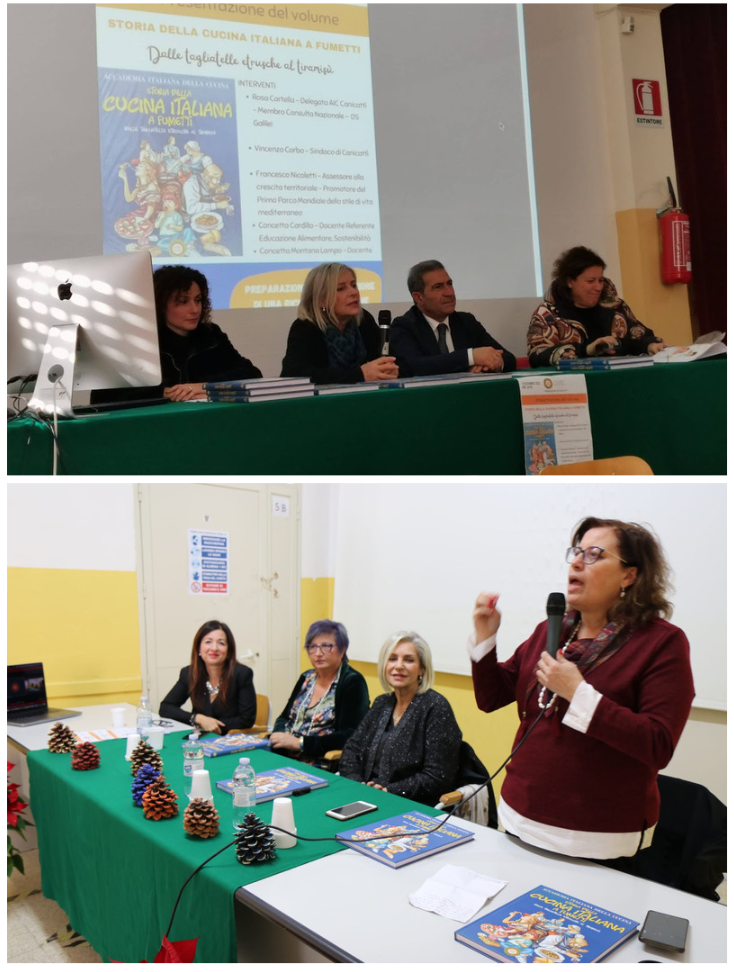 Una tappa importante del progetto didattico-culturale dell’II.SS. “Galilei” di Canicattì è quello relativo all’”Educazione alimentare e alla sostenibilità” le cui docenti referenti sono la prof.ssa Concetta Cardillo, per la sede di Canicattì, e la prof.ssa Romina Terranova, per quella di Naro. In questo contesto sono state organizzate due giornate per la presentazione del libro “Storia della cucina italiana a fumetti - dalle tagliatelle etrusche al tiramisù”, il 22 dicembre nella sede di Canicattì e il 23 in quella di Naro. Alla presenza dei Sindaci, il rag. Vincenzo Corbo (Canicattì) e la dott.ssa Maria Grazia Brandara (Naro), è intervenuta la prof.ssa Rosa Cartella nella duplice veste di Dirigente Scolastico dell’Istituto e di Delegata AIC di Canicattì. Nel suo intervento ha presentato agli alunni delle due sedi scolastiche l’Accademia e i suoi obiettivi. In entrambi gli incontri sono intervenuti il dott. Francesco Nicoletti, Assessore alla crescita territoriale di Caltanissetta, promotore della Dieta Mediterranea in Sicilia e del “Primo Parco Mondiale dello stile di vita mediterraneo”, e la prof.ssa Concetta Montana Lampo, docente collaboratore del Dirigente Scolastico che ha relazionato magistralmente sul libro. Nella sede di Naro è stata allestita una mensa medievale e interpretato dagli alunni un intermezzo musicale di danze medievali con costumi d’epoca. Con riferimento alla seconda parte del libro, nella sede di Canicattì sono stati preparati e degustati due prodotti legati alla festività del Natale: il torrone e il pandoro. A conclusione la distribuzione del volume.