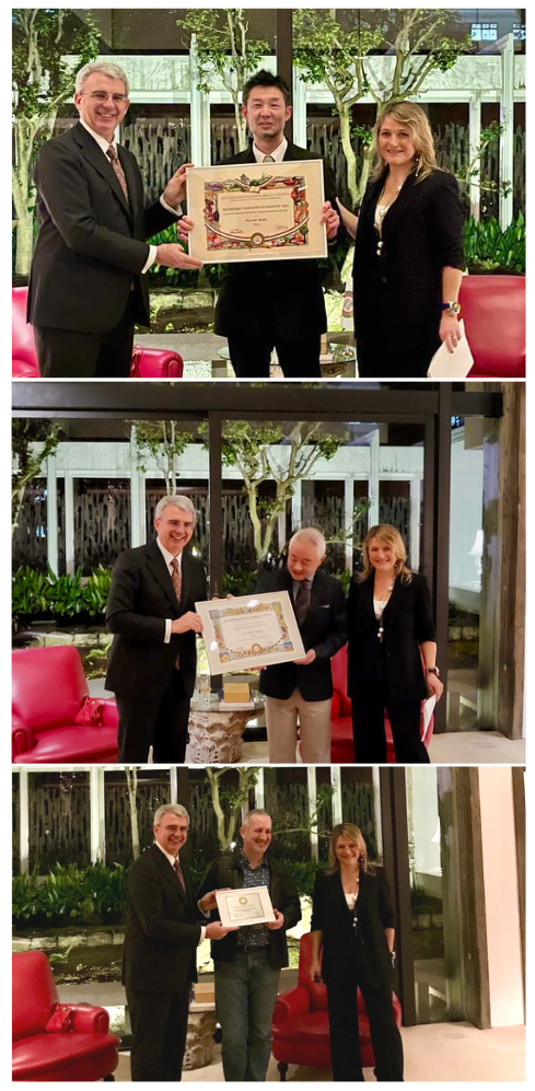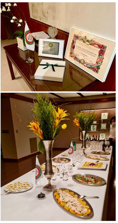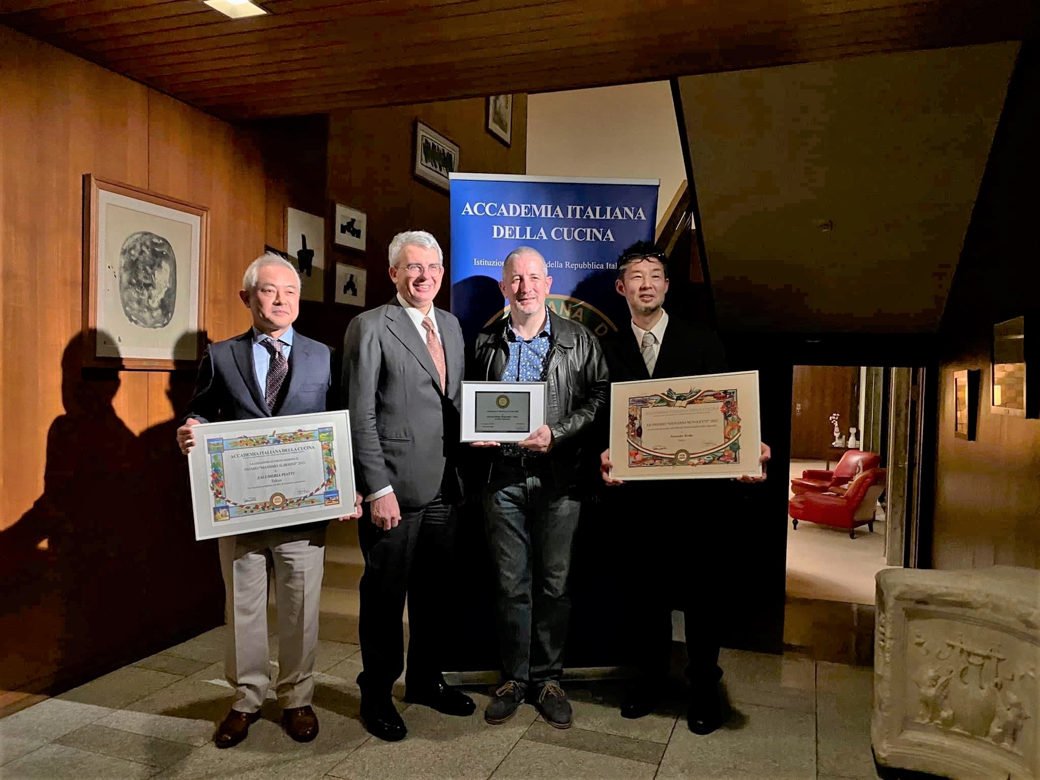 La Legazione di Tokyo ha avuto il privilegio di essere ospitata da S.E. Ambasciatore Gianluigi Benedetti e da sua moglie Sabina D’Antonio in occasione della consegna dei premi annuali. Nel suo discorso introduttivo l’Ambasciatore ha sottolineato la intensa opera divulgatrice dell’Accademia nel trasmettere i valori di quel “Vivere all’Italiana” sempre più apprezzati nel mondo intero, di cui dovremmo essere consapevoli e fieri, così come lo furono negli anni ‘50 Orio Vergani e i fondatori dell’associazione. La Legata Emanuela Orighi ha ricordato l’attenzione che l’Accademia dedica ai professionisti che con competenza contribuiscono a valorizzare la cucina italiana e i suoi prodotti tipici. A questi professionisti sono rivolti i premi conferiti durante la serata. Il premio Nuvoletti è stato attribuito a Noriyuke Koike del ristorante Osteria dello Scudo, il premio Alberini alla salumeria Piatti di Koji Okada, il Diploma di Buona Cucina al ristorante Da Stefano Kagurazaka di Stefano Fastro. A seguire, uno squisito buffet sul tema della Cucina Italiana anni 80 pensato e organizzato dall’ Accademica Onoraria Sabina D’Antonio in collaborazione con lo chef dell’Ambasciata Lionel Ciambellini. I piatti hanno sorpreso e stupito gli ospiti per la grande modernità con i quali sono stati ripensati pur nel rispetto della loro originalità. La Legazione ha consegnato a Sabina il piatto dell’anno in segno di stima per l’instancabile sostegno che riserva alla nostra Associazione.
