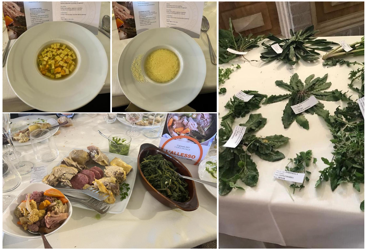 Riunione conviviale molto partecipata presso l’Agriturismo delle Rose di Monte Urano per esplorare un piatto tradizionale dei pranzi fermani delle feste: l’allesso. Lontani dai bolliti del Nord, nel fermano venivano in genere lessati (non bolliti) galline o i più nobili capponi per ottenere sapidi e delicatissimi brodi cui si attribuivano anche particolari proprietà nutrizionali e ricostituenti. Tutto questo e molto altro ha raccontato il Simposiarca Giuseppe Corvari imbastendo un convivio sul filo della tradizione e della memoria. La Conviviale ha avuto un prologo mattutino quando il dott. Roberto Ferretti, autore del libro “Herbae et Orbi”, ha deliziato i convenuti con una disertazione su “L’erbe troate. Storia di un’antica frequentazione gastronomica” preceduta da una raccolta guidata delle erbe, poi catalogate ed esposte in visione e poi a tavola nel piatto. È seguito l’intervento del dott. Giuseppe Iacchia sulle problematiche dell’avicoltura e delle ripercussioni sulle nostre tavole. A tavola gli Accademici hanno ritrovato con piacere il gusto dell’allesso e dei piatti ad esso affini e hanno apprezzato le sottili differenze fra il brodo di gallina e il più dolce e grasso brodo di cappone. Grande apprezzamento dei convenuti per la qualità della carne ma anche per l’amarognolo dei rugni e le più ambili erbe raccolte in mattinata. Alla zuppa inglese e vino cotto il Simposiarca ha voluto aggiungere a sorpresa le sfrappe, anticipatrici del prossimi incontro sul tema del Carnevale.