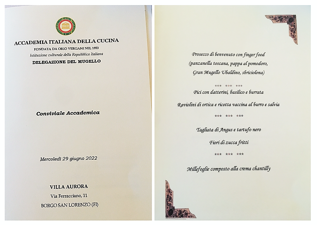 Per la riunione conviviale di luglio, la Delegazione del Valdarno Fiorentino si è ritrovata al ristorante Podere San Giusto, all’interno di un agriturismo immerso nella splendida campagna di Figline e Incisa Valdarno. Lo chef del ristorante, Federico Nencini, insieme ai Simposiarchi Roberta Ceppatelli e Giovanni Gerini, ha preparato un menu della tradizione toscana molto apprezzato sia nella qualità sia nella presentazione. Dopo l’aperitivo, servito con un assortimento di bruschette, focacce, salumi e verdure in pastella, si sono susseguiti: spaghetti alla chitarra con zucchini, pancetta croccante, timo e mandorle tostate, rosticciana disossata ripiena con il suo filetto alle erbe aromatiche al forno, verdure dell’orto, pesca all’alchermes con gelato alla vaniglia (foto 3 e 4). L’utilizzo di vassoi e terrine preparati per due persone ha favorito la spettacolarità degli impiattamenti e la convivialità tra i commensali. Tutto il menu ha ottenuto una valutazione ottima (foto 1, il momento della compilazione delle schede) . Al termine della serata il Delegato Sandro Fusari, insieme ai Simposiarchi, ha voluto ringraziare la famiglia Nencini con alcuni volumi personalizzati dell’Accademia (foto 2). Dopo il suono della campana sono seguiti i tradizionali saluti e auguri per le imminenti vacanze estive.