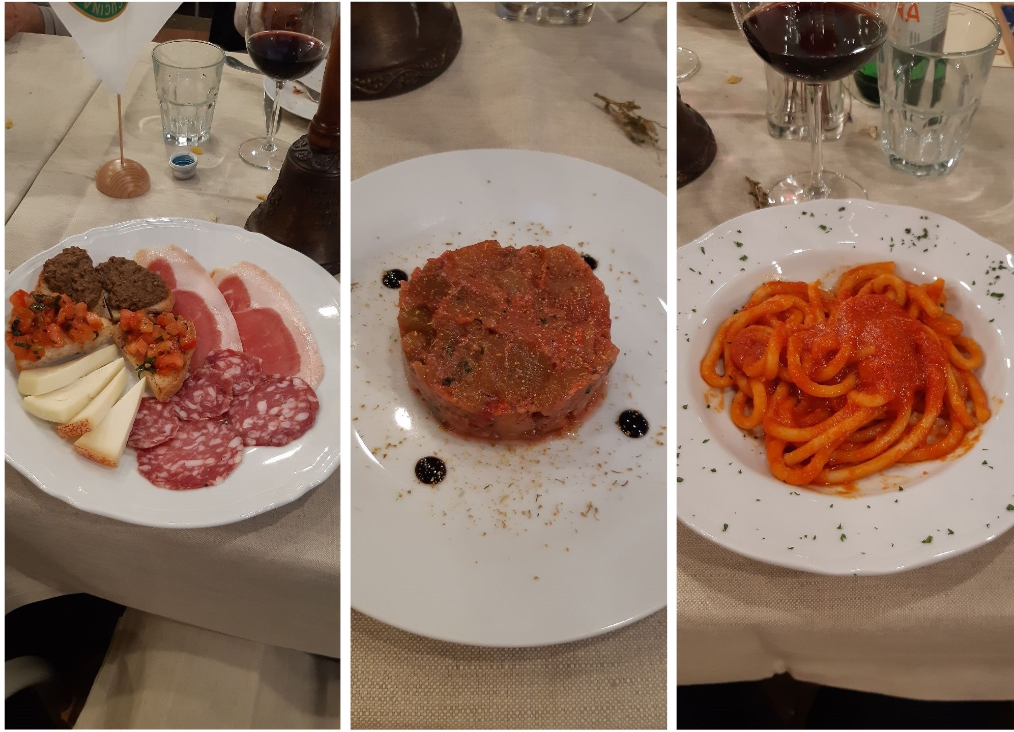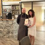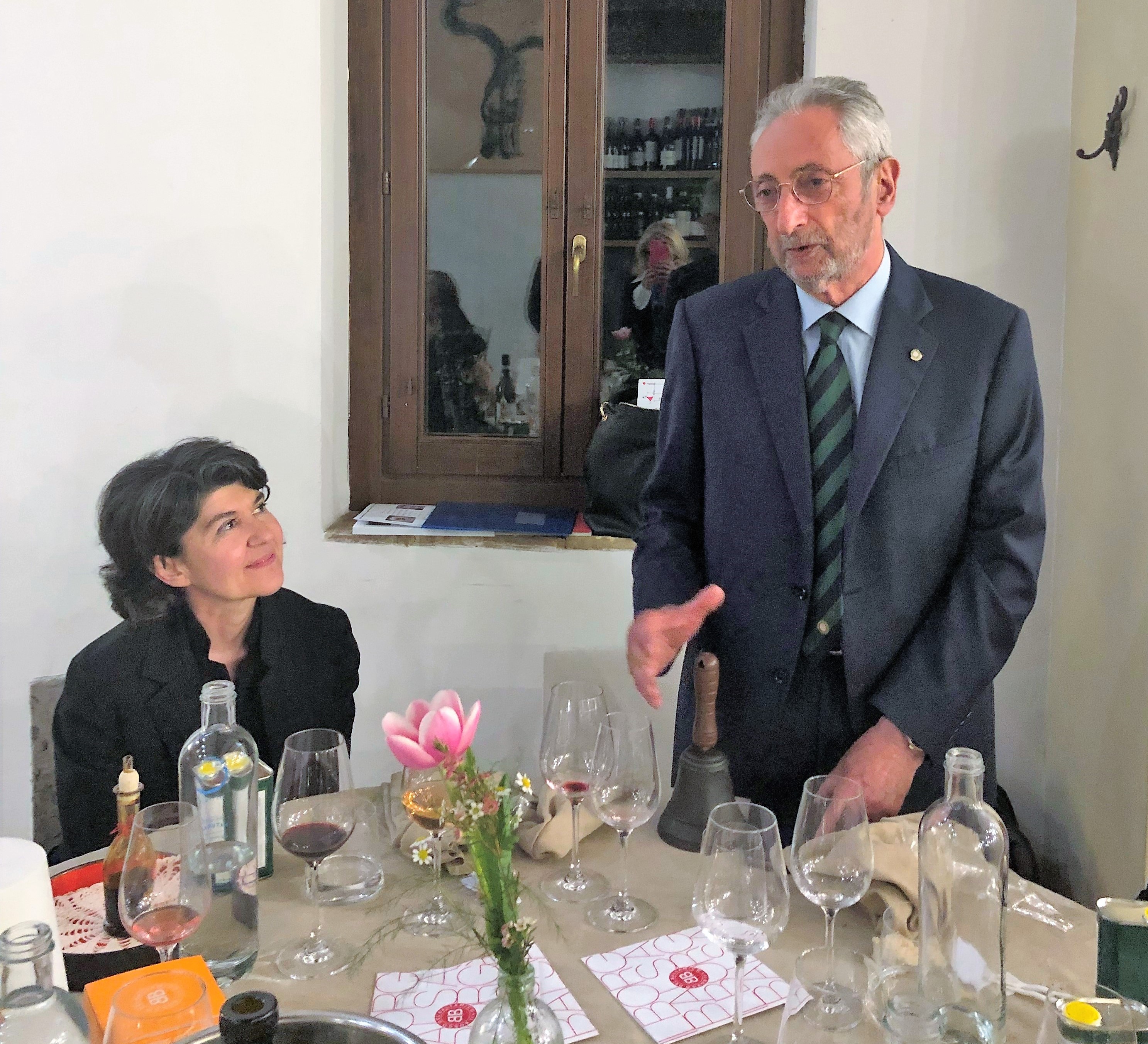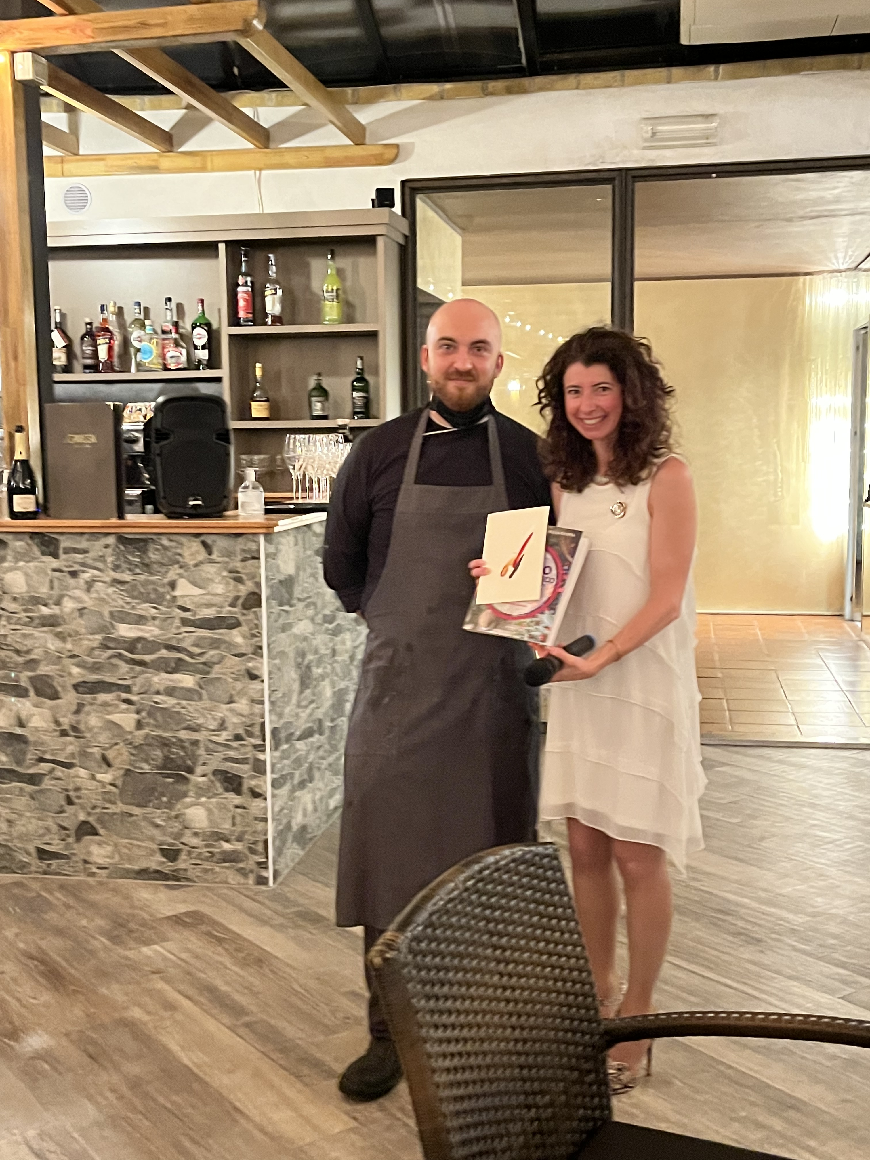 La Delegazione del Valdarno Fiorentino si è riunita presso il ristorante Il Vescovino a Panzano in Chianti. Il clima mite ha favorito la conviviale all'aperto, su una terrazza panoramica e in un contesto incantevole. I Simposiarchi Assia Olivieri e Paola Mainardi, con lo chef Sergio Roncaratti, hanno preparato un menu veramente gustoso, a partire da una delicata tartare di melanzane, condita con miele, lamponi, finocchietto e menta, proseguendo con deliziosi pici all'aglione, pollo del Valdarno o bavetta di manzo allo spiedo e finendo con un ottimo tiramisù (foto 2-3-4). Durante la serata il Delegato Sandro Fusari ha illustrato agli Accademici le principali novità in merito alla recente approvazione del nuovo Statuto e i Simposiarchi, coadiuvati dai proprietari e gestori del ristorante, Renata e Sergio Roncaratti, hanno raccontato, con dovizia di particolari e contagioso entusiasmo, i prodotti utilizzati, le ricette seguite, i piatti serviti e la storia del locale. I prodotti utilizzati sono tutti del territorio, l'abbinamento dei vini equilibrato, la cortesia e la disponibilità dei gestori a raccontare la loro esperienza è stata molto apprezzata. Al termine della serata sono stati consegnati a Renata e Sergio Roncaratti alcuni volumi dell'Accademia (foto 1).