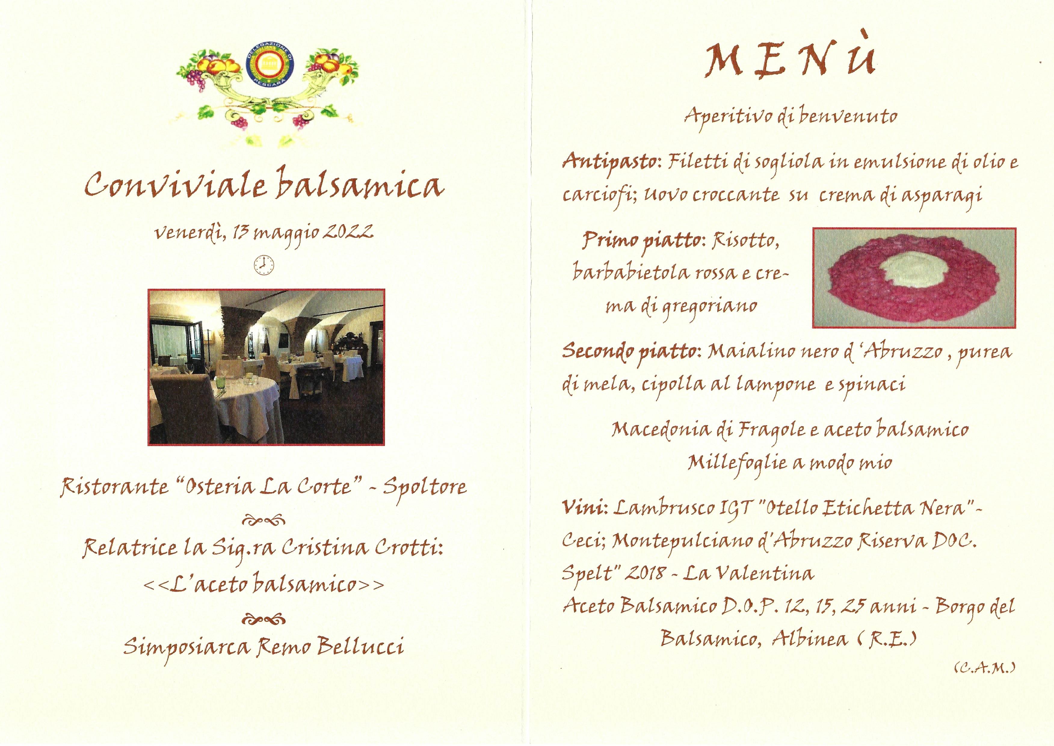 Riunione conviviale dedicata all’aceto balsamico presso l’Osteria La Corte di Spoltore per gli Accademici di Pescara. Condimento agrodolce dalle caratteristiche uniche, straordinario prodotto identitario del territorio di Reggio Emilia e di Modena, nell’immaginario collettivo è spesso associato alla decorazione del piatto, ma in realtà è prodotto di alto valore per una gastronomia raffinata, tutto italiano e rigorosamente disciplinato a livello europeo per garantire ai consumatori di potersi orientare nella scelta di aceti della massima qualità. A livello normativo, si distinguono tre tipologie di Balsamico: di Modena IGP, Tradizionale di Modena DOP e Tradizionale di Reggio Emilia DOP. Le differenze qualitative dipendono essenzialmente da varietà e provenienza dell’uva utilizzata per il mosto, tempi di invecchiamento ed eventuale addizione di aceto di vino classico e/o addensanti come il caramello. Ospiti e relatrici nella conviviale accademica sono state le imprenditrici reggiane Cristina e Silvia Crotti (l’una in presenza, l’altra in collegamento da remoto), fondatrici del Borgo del Balsamico di Albinea. La riunione, alla quale hanno preso parte numerosi Accademici, postulanti e ospiti, è stata particolarmente apprezzata per la peculiarità del tema proposto dal delegato Giuseppe Fioritoni, nonché per la prelibatezza dei piatti (tutti impreziositi da Balsamico Tradizionale di Reggio Emilia DOP), scelti dal Simposiarca Remo Bellucci e preparati in maniera impeccabile dalla brigata di cucina guidata da Maurizio Della Valle. Foto 1. Cristina Crotti e il Delegato Giuseppe Fioritoni. 2. La sala della conviviale. Foto 3 e 4. Il menu e il maialino nero d’Abruzzo.