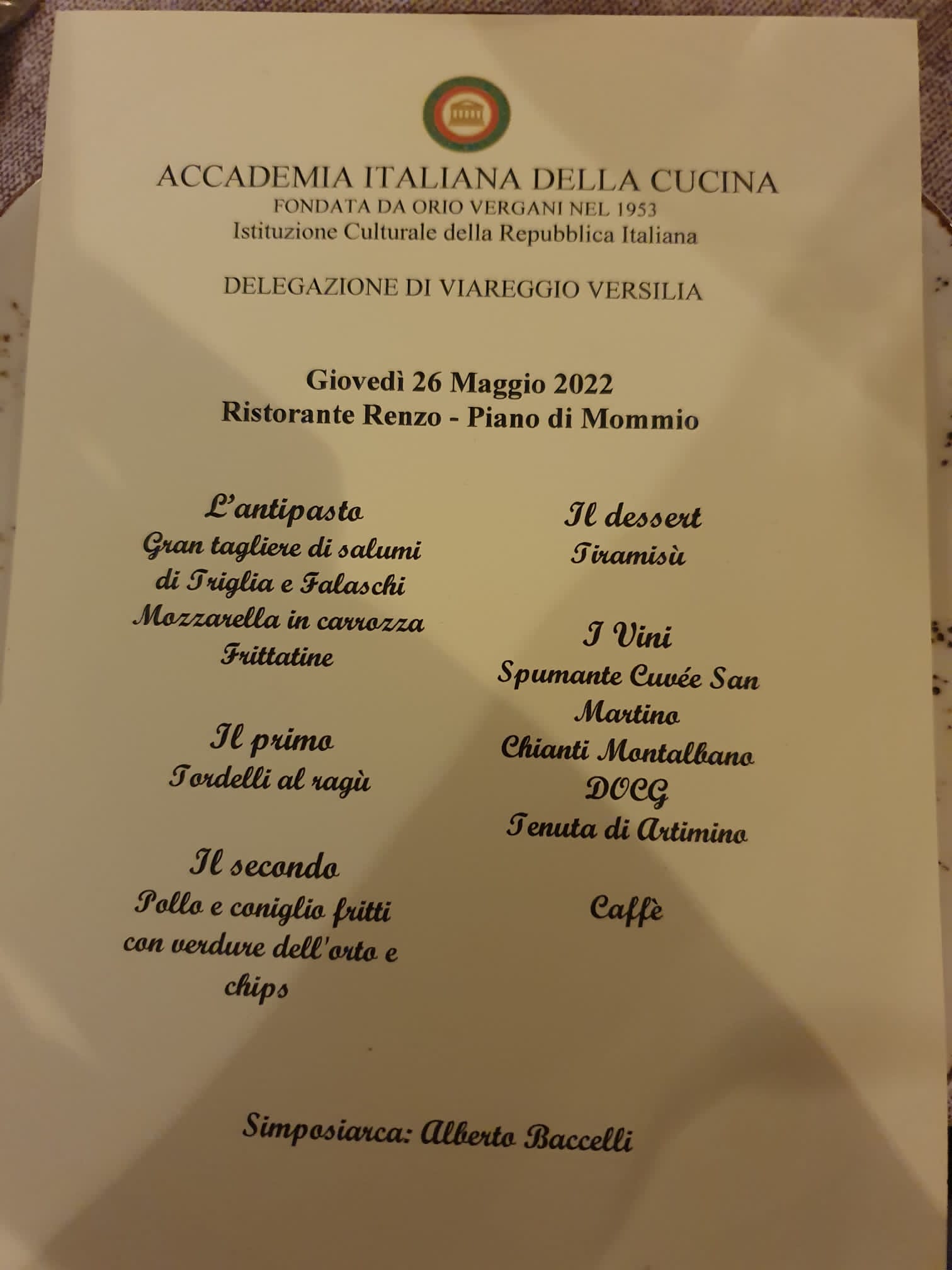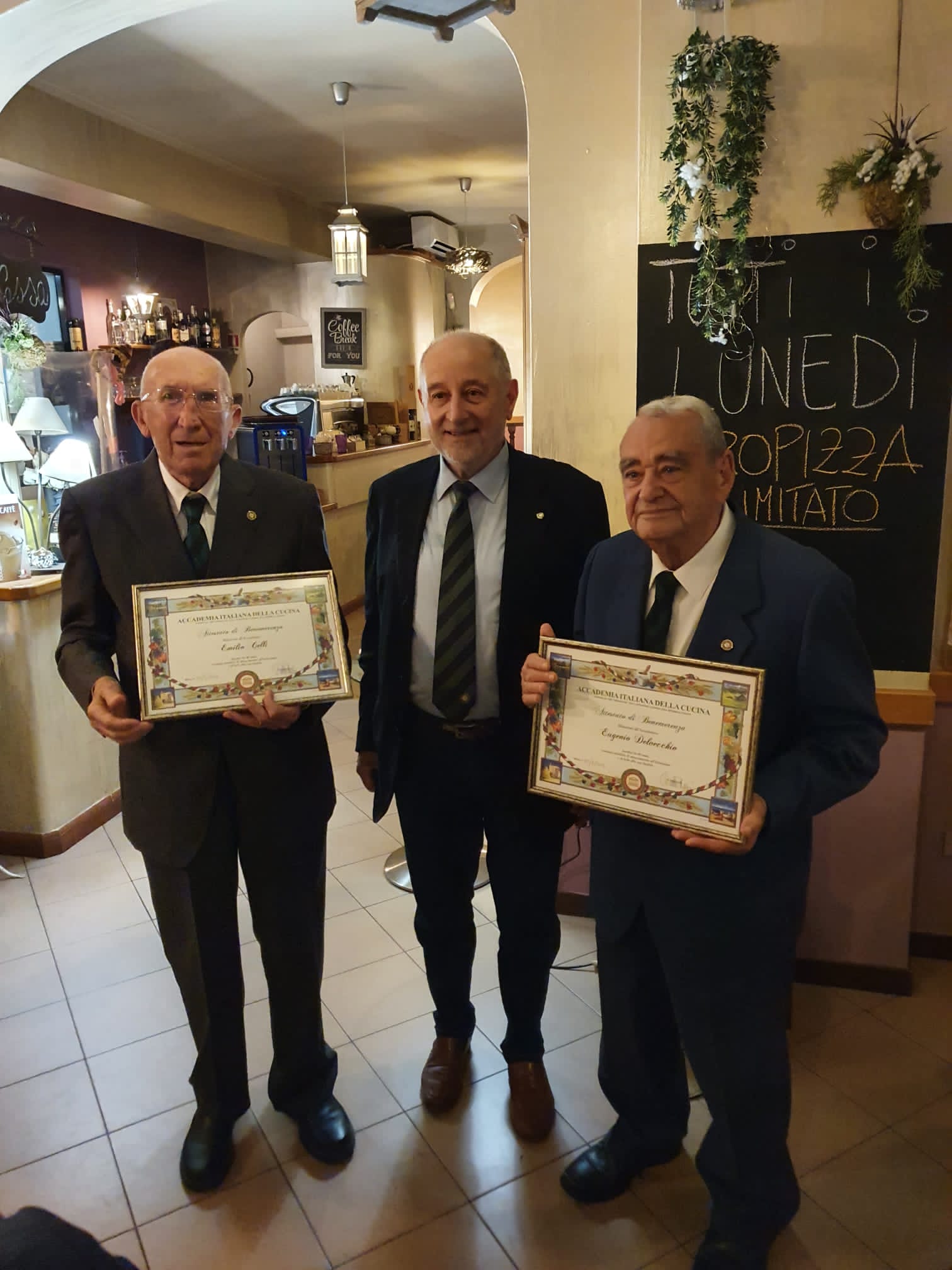 La Delegazione di Viareggio Versilia si è ritrovata al ristorante "Renzo" a Massarosa (LU) per celebrare i 40 anni di appartenenza degli Accademici Emilio Celli ed Eugenio Del Vecchio con la consegna degli Attestati di Benemerenza e i distintivi coniati per queste importanti ricorrenze. Il convivio è stato la cornice per festeggiare Emilio Celli, Delegato dal 2001 al 2007 ed Eugenio Del Vecchio, Delegato dal 2011 al 2013. L'intera Delegazione si è stretta a Emilio ed Eugenio e ha applaudito la passione da loro dimostrata per ben 40 anni. Foto 1. Emilio Celli, il Delegato Alberto Petracca ed Eugenio Del Vecchio. Foto 2. La titolare del ristorante "Renzo" e il Delegato Alberto Petracca. Foto 3. Il menu della Conviviale.