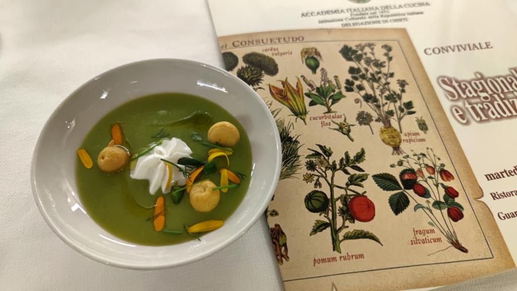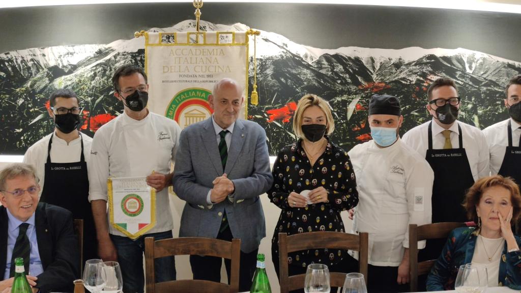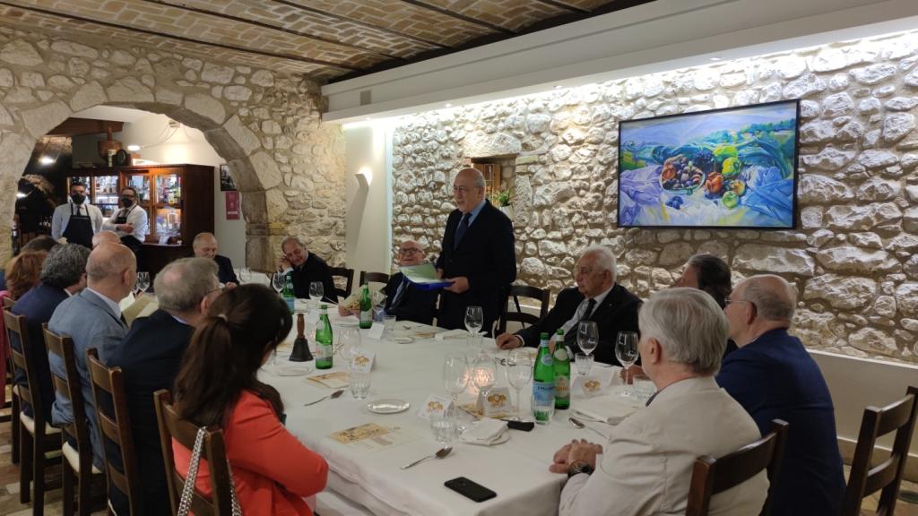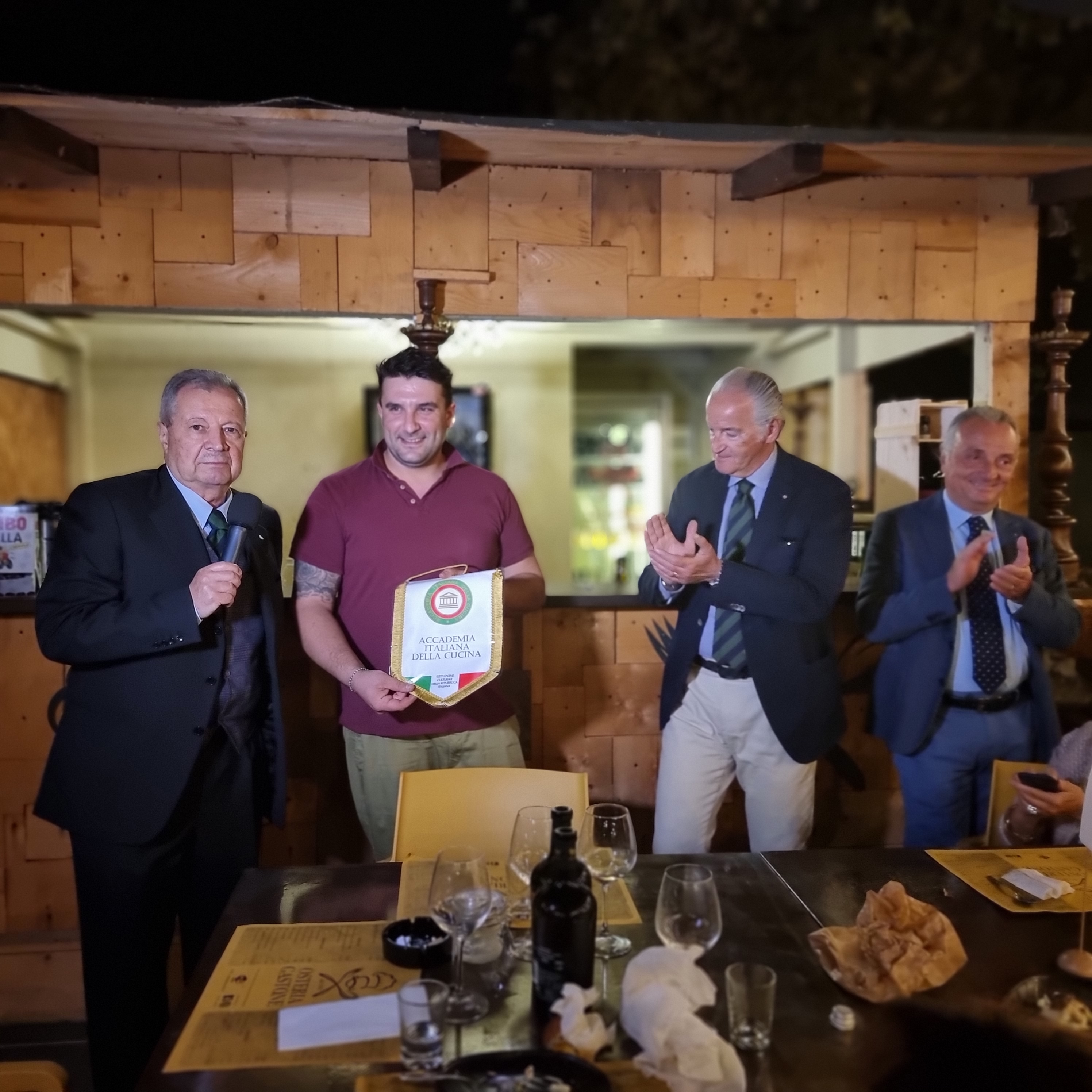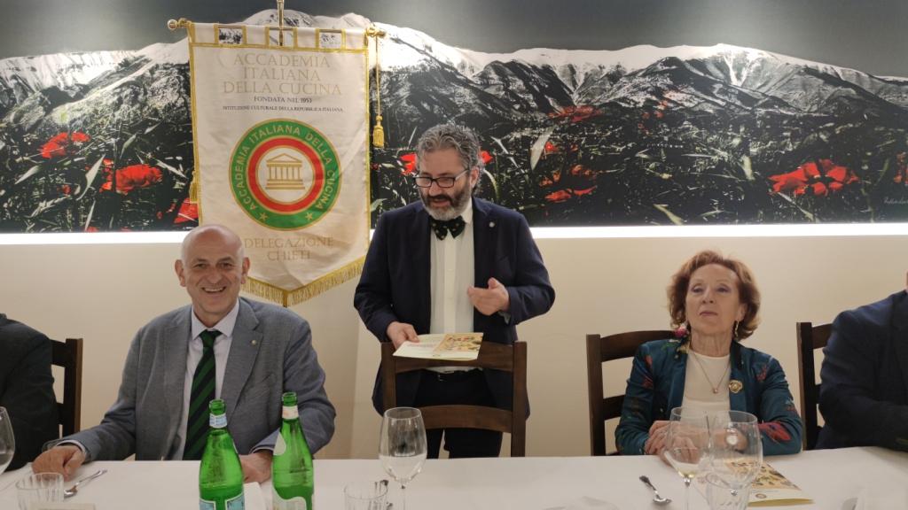 Alla ricerca di stagionalità e tradizione - i due poli della riunione conviviale primaverile della Delegazione teatina - il postulante Ariberto Di Felice regala agli Accademici una serata in uno dei locali storici della zona pedemontana, "La grotta dei Raselli" a Guardiagrele, che ha interpretato al meglio le tante ricchezze di questo periodo nell'orto e nelle dispense. Preceduta da una dotta dissertazione del Consultore Gerardo Di Cola, infaticabile creatore dei menu della Delegazione, proprio sull'arte di scrivere la "lista cenatoria" (come si chiamava in epoca fascista), la riunione conviviale curata dallo chef Franco Spadaccini ha esaltato i tanti ingredienti di stagione inseriti nei piatti, riuscendo ad ottenere un ensemble equilibrato e squisito. Foto 1. Il relatore Gerardo Di Cola. Foto 2. Il Simposiarca Ariberto Di Felice. Foto 3. La brigata di cucina. Foto 4. Uno dei piatti serviti.
