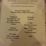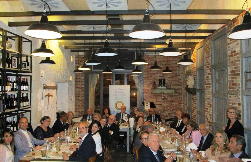 La Delegazione di Siracusa ha visitato il Ristorante “Mammaiabica” dove gli Accademici hanno condiviso il convivio ad un unico tavolo (foto 1). Simposiarca il Delegato Tamburini (foto 2) che, dopo il brindisi di benvenuto, ha poi relazionato sul tema molto apprezzato “Viaggiare cucinando e gustando anche con i cibi che ci rendono felici”. È stata poi servita in tavola la cena, una sequenza di pietanze gustose e gradevoli realizzate dallo staff di cucina del maestro Gianni Cavallaro utilizzando le materie prime del territorio. Il menu (foto 4): arancinetta con nero di seppia e ricotta di buccheri su patata novella di Siracusa; frittura di alici con cipolla rossa caramellata; lolli con ragù bianco di cernia; cavati con farina di carrube con zucchine, menta, buccia di limone e bottarga; trancio di ombrina con zafferano e limone con contorno di patate; scurzunera; bignè con crema di nocciola dei Nebrodi. In buon abbinamento i vini della cantina Colosi delle Isole Eolie-Me: “Salina” Igt bianco e rosso; e Malvasia delle Lipari DOC “Najh”, proposti in tavola dalla maestra di sala Laura Foti. Gli Accademici hanno potuto assistere alla preparazione delle pietanze, data la cucina completamente a vista. Infine la consegna del guidoncino e della vetrofania dell’Accademia allo staff di cucina e di sala (foto 3) con un lungo applauso di gradimento degli Accademici.