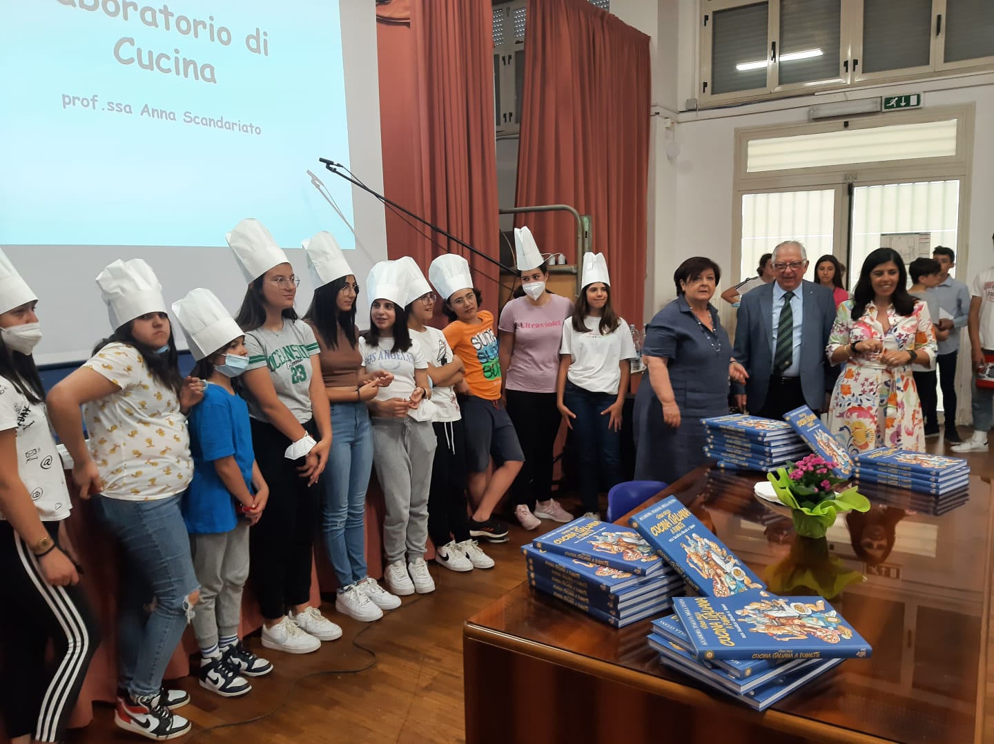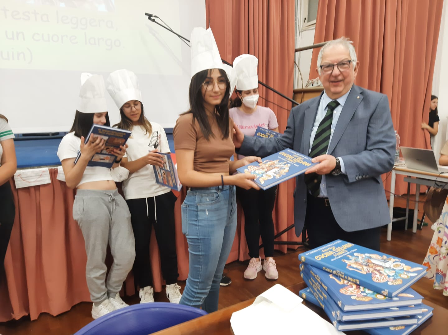 Premiati tutti gli alunni di una classe di 2’ media dell’Istituto Bagolino di Alcamo con le copie del libro “Storia della Cucina Italiana a fumetti” donate dalla Delegazione di Alcamo-Castellammare del Golfo. Gli alunni hanno partecipato con profitto e interesse all’attività didattica di laboratorio di cucina coordinata dalla prof.ssa Anna Scandariato e dalla prof.ssa Fiorenza Provenzano. Durante il percorso dell’attività, di durata semestrale e svoltasi nell’orario continuato della scuola, gli alunni si sono distinti nella preparazione di dolci tipici della tradizione del territorio e nelle varie preparazioni di pasta fresca, acquisendo manualità ed esperienza. Foto 1. Da sinistra la prof.ssa Anna Scandariato, il Delegato Liborio Cruciata, la prof.ssa Fiorenza Provenzano. Foto 2 e 3 momenti della premiazione.