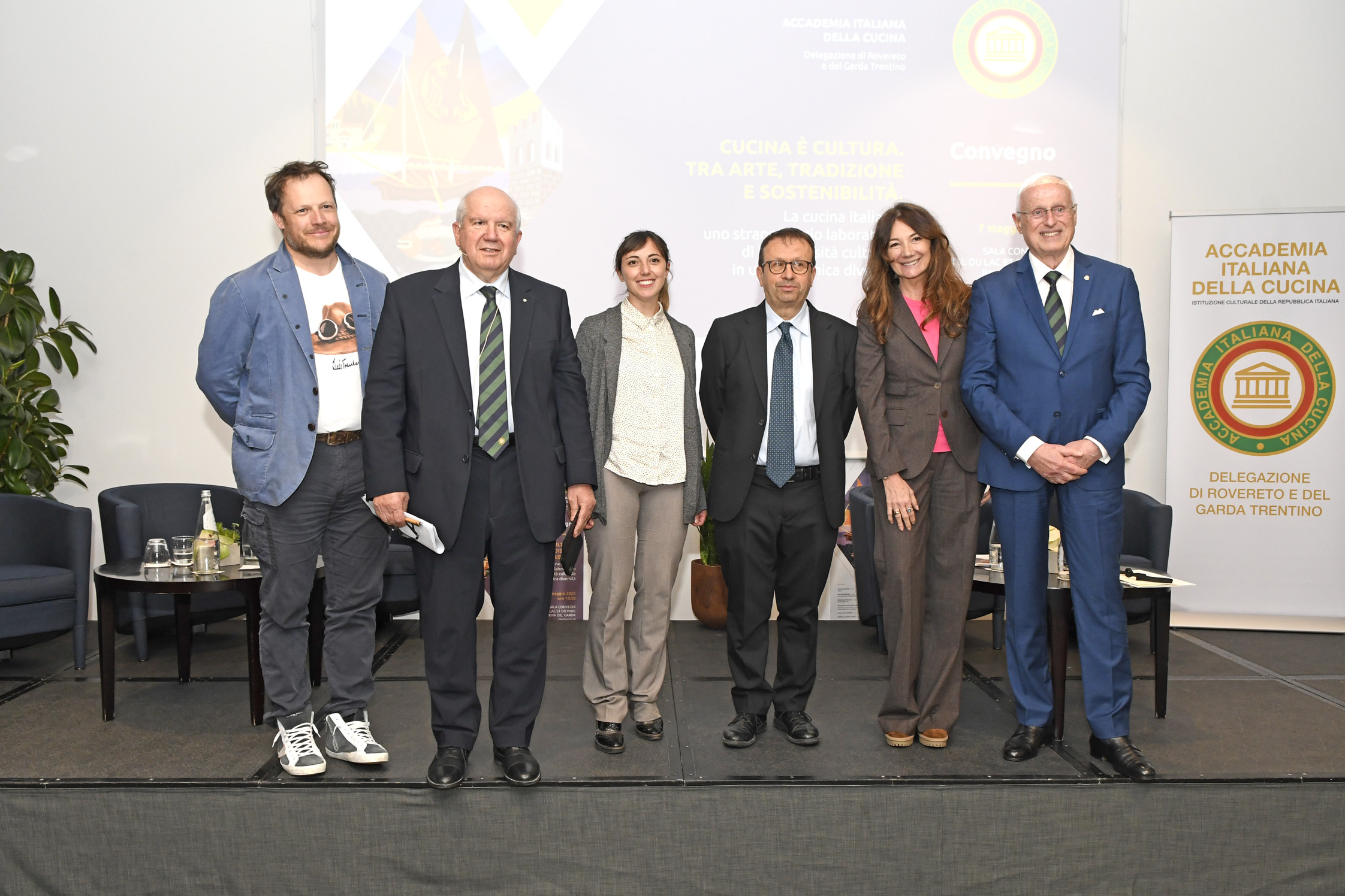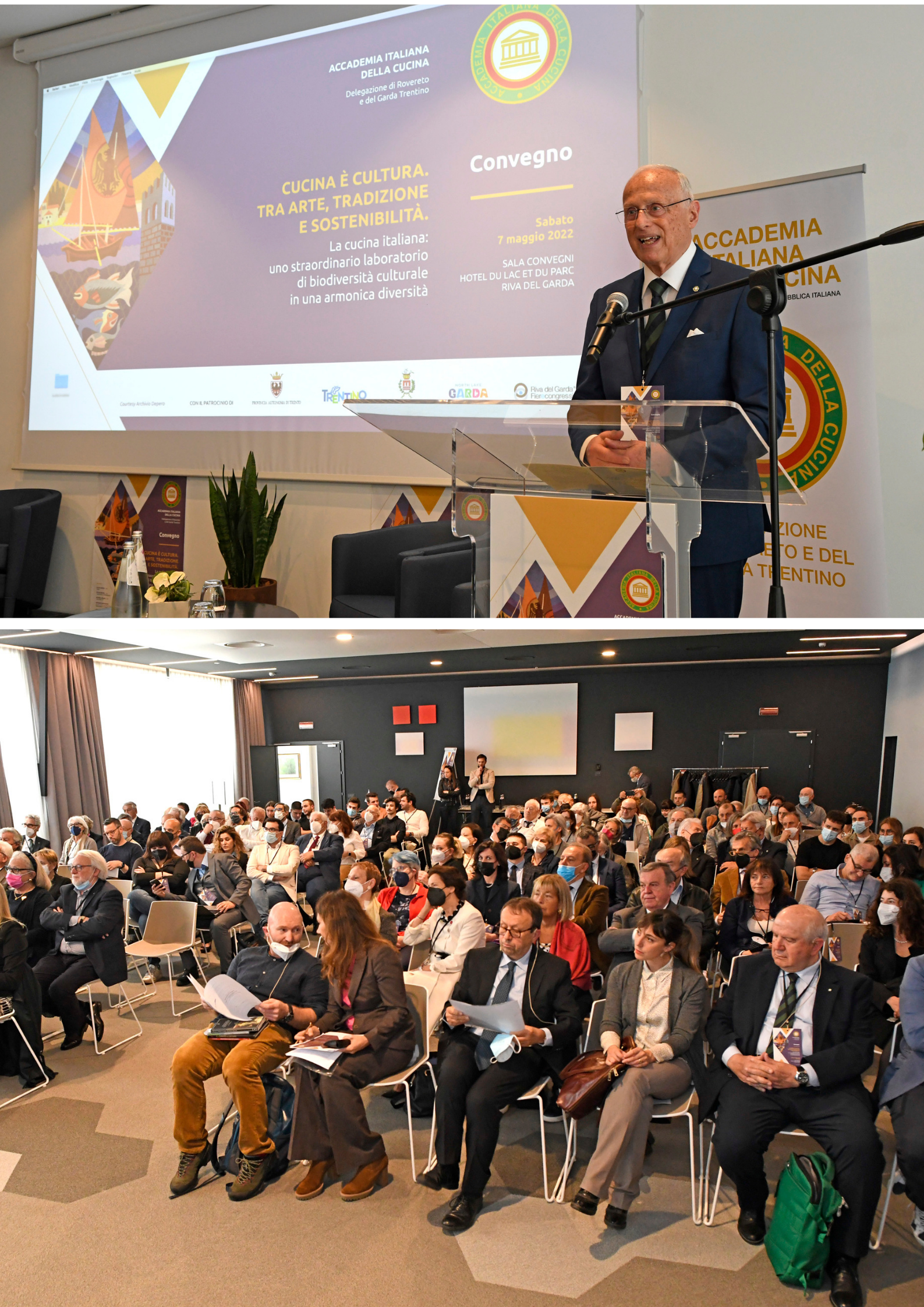 Notevole successo per il convegno promosso e organizzato a Riva del Garda (TN) dalla Delegazione di Rovereto e del Garda Trentino per festeggiare il quinto anniversario di fondazione della Delegazione. I temi trattati durante il convegno, moderato dalla Direttrice della rivista “La Cucina Italiana” Maddalena Fossati, hanno attraversato la cucina nazionale dal punto di vista dell’arte, della tradizione, della sostenibilità e della biodiversità culturale, grazie agli importanti contributi di chef ed esperti del settore gastronomico. Numerosa ed importante la partecipazione degli insegnanti e degli studenti del corso di alta formazione degli Istituti alberghieri della Provincia di Trento, nonché di Soave (VR). È seguita la riunione conviviale presso il ristorante dell’Hotel Du Lac et Du Parc; i relatori hanno anche preso parte agli eventi collaterali organizzati per l’occasione, con particolare apprezzamento per la crociera sul Lago di Garda, svoltasi domenica 8 maggio. Foto 1. il Segretario Generale Roberto Ariani; la sala del convegno con i partecipanti. Foto 2. Il Relatore Alfio Ghezzi con la Moderatrice Maddalena Fossati; il relatore Massimo Montanari con M. Fossati. Foto 3. Il Segretario Generale con il Delegato Germano Berteotti; il Sindaco di Riva del Garda, Cristina Santi, con il Delegato Berteotti. Foto 4. Relatori Andrea Irsara, Morello Pecchioli, Leila Salimbeni, Massimo Montanari, la moderatrice Maddalena Fossati e il SG Roberto Ariani.
