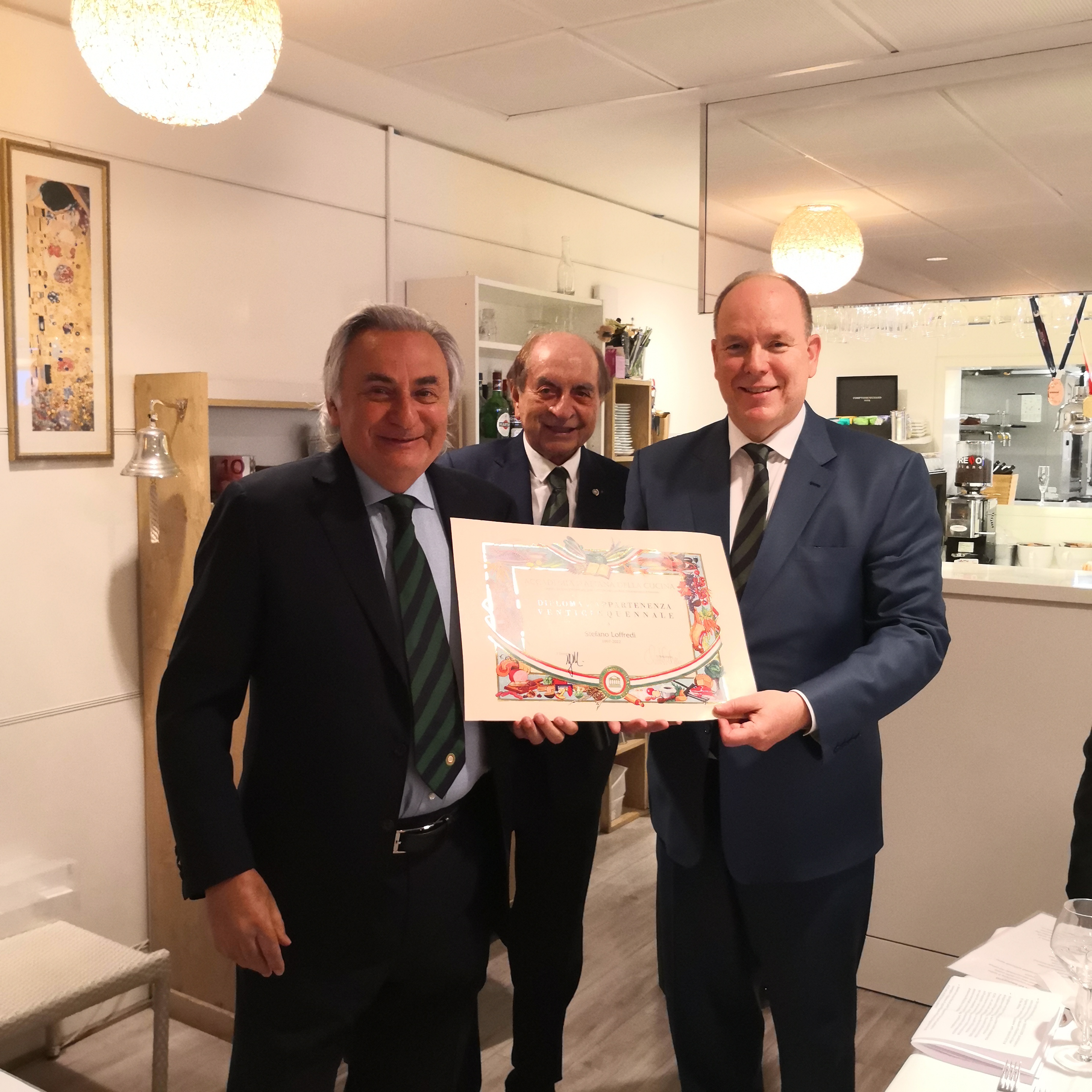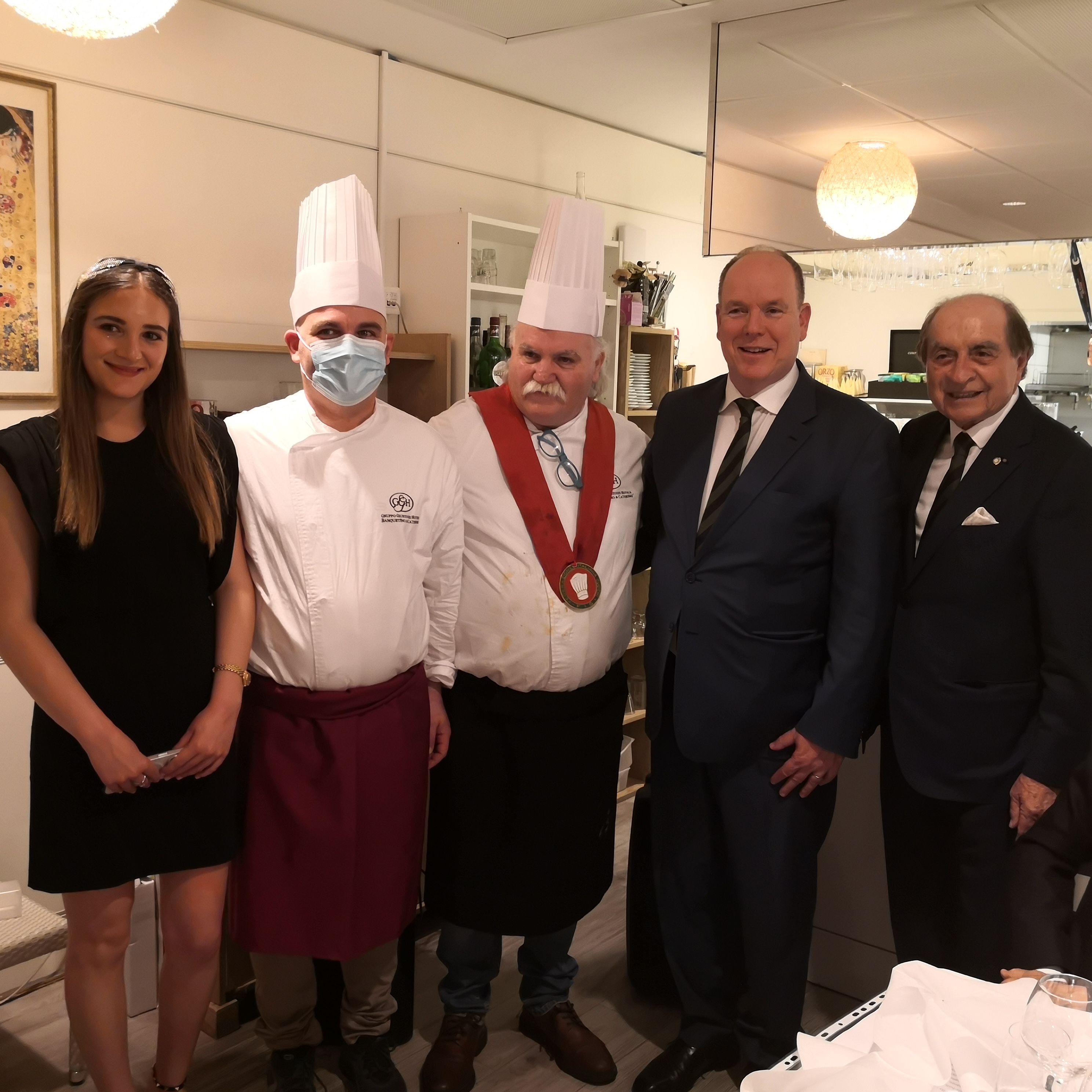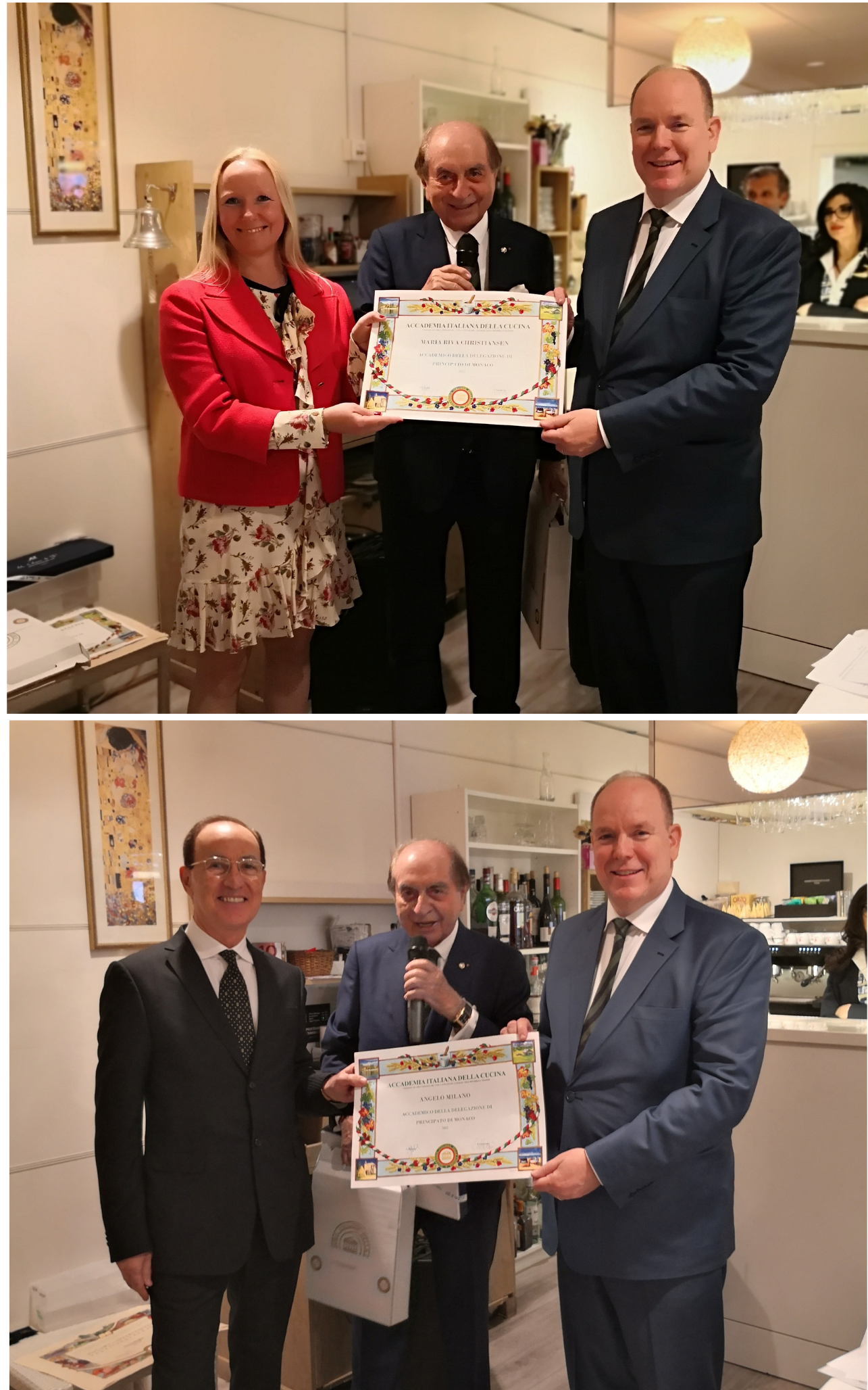 Evento conviviale della Delegazione ospitata a Palazzo, alla presenza dell'Accademico onorario Principe Alberto II per l'investitura di due nuovi Accademici, Maria Riva Christiansen e Angelo Milano (entrambi in foto 1 con S.A.S Principe Alberto II e il Delegato Luciano Garzelli). Occasione speciale anche per la consegna degli attestati di appartenenza venticinquennale agli Accademici Flavia Boglio (foto 2) e Stefano Loffredi (foto 3). Lo chef Giuseppe Giustozzi (foto 4) ha preparato un menu di cucina marchigiana con il piatto tipico "Brodetto dell'Adriatico".