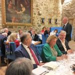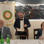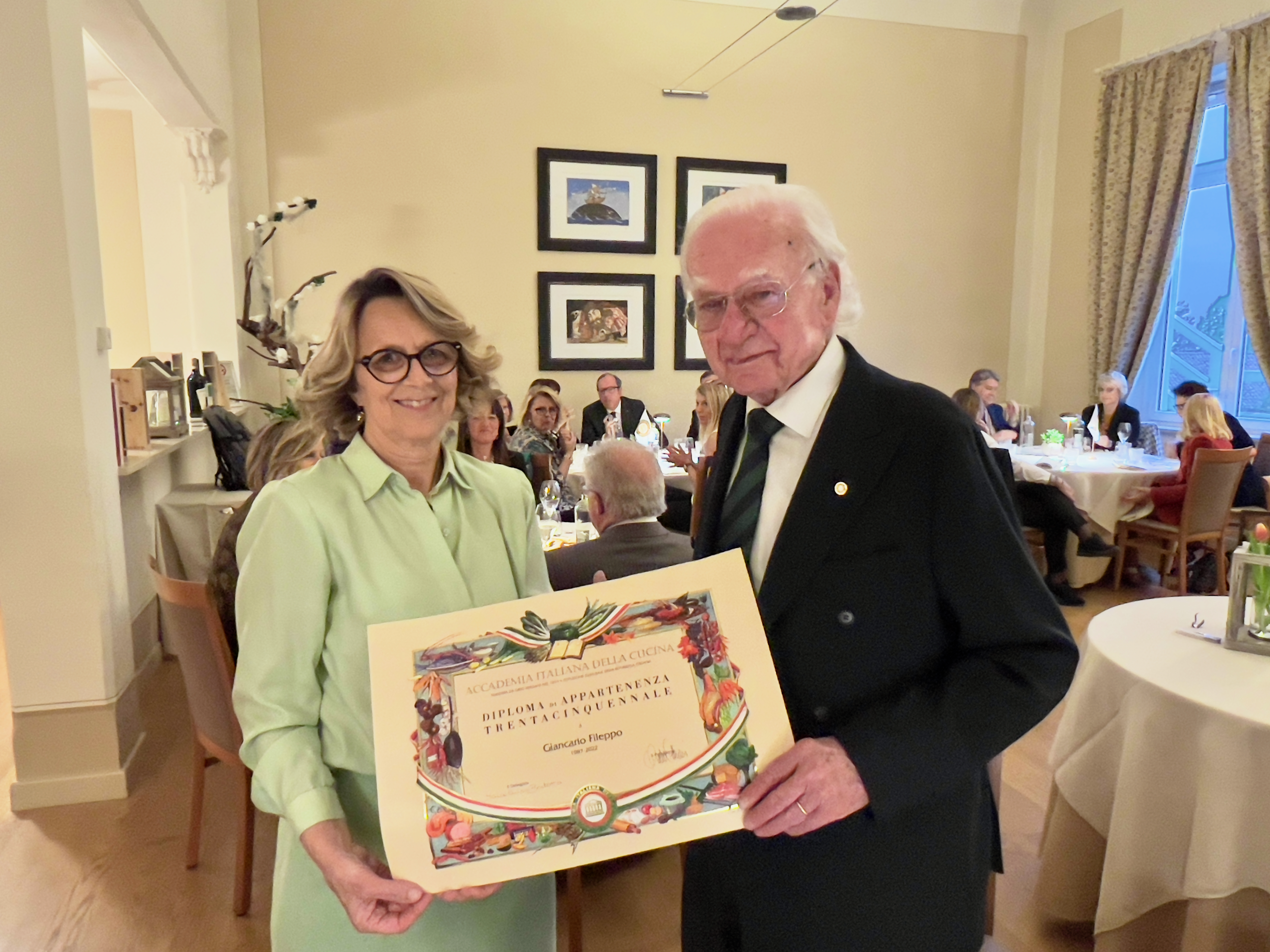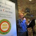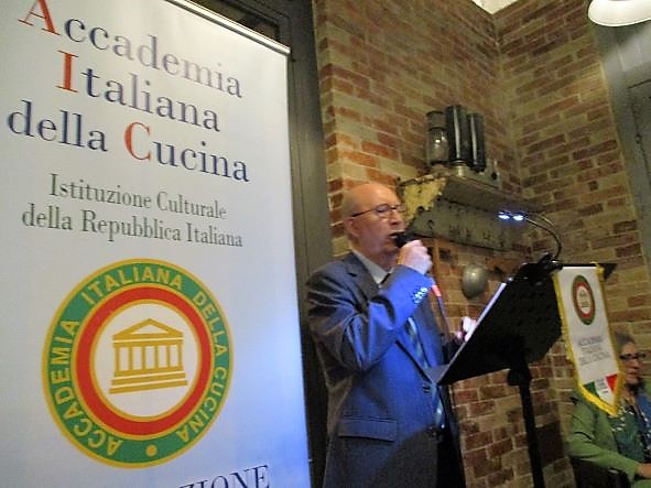 Gradita visita della Delegazione di Fermo ospitata dalla Delegazione messinese presso l’associazione “Il Circolo”. Il Delegato (Foto 1), dopo il caloroso benvenuto al Delegato Fabio Torresi e agli amici Accademici fermani (fra i quali era presente Cristofaro La Corte, già Questore di Messina), ha illustrato il menu, filologicamente basato sulla carta di un ristorante messinese del 1902. È stato il Simposiarca Attilio Borda Bossana, Consultore e Direttore del Centro Studi della Sicilia Orientale, a rappresentare ai numerosissimi commensali nel sontuoso salone d’epoca (Foto 2), l’ultra secolare storia delle pietanze servite, facendo anche riferimento al suo libro “Il Cibo Italiano negli Stati Uniti”, edito dalla Delegazione. Il Delegato ha quindi consegnato il materiale associativo ad alcuni dei nuovi Accademici (Foto 3, da sinistra Emilia Ciriaco, Marisa Renda, Natale Naccari e Luigi Hyerace). Unanime l’apprezzamento manifestato allo chef Massimiliano Usbergo e alla sua squadra di cucina e di sala da parte di tutti gli Accademici e dagli Accademici marchigiani, festosamente ritratti nella foto 4.