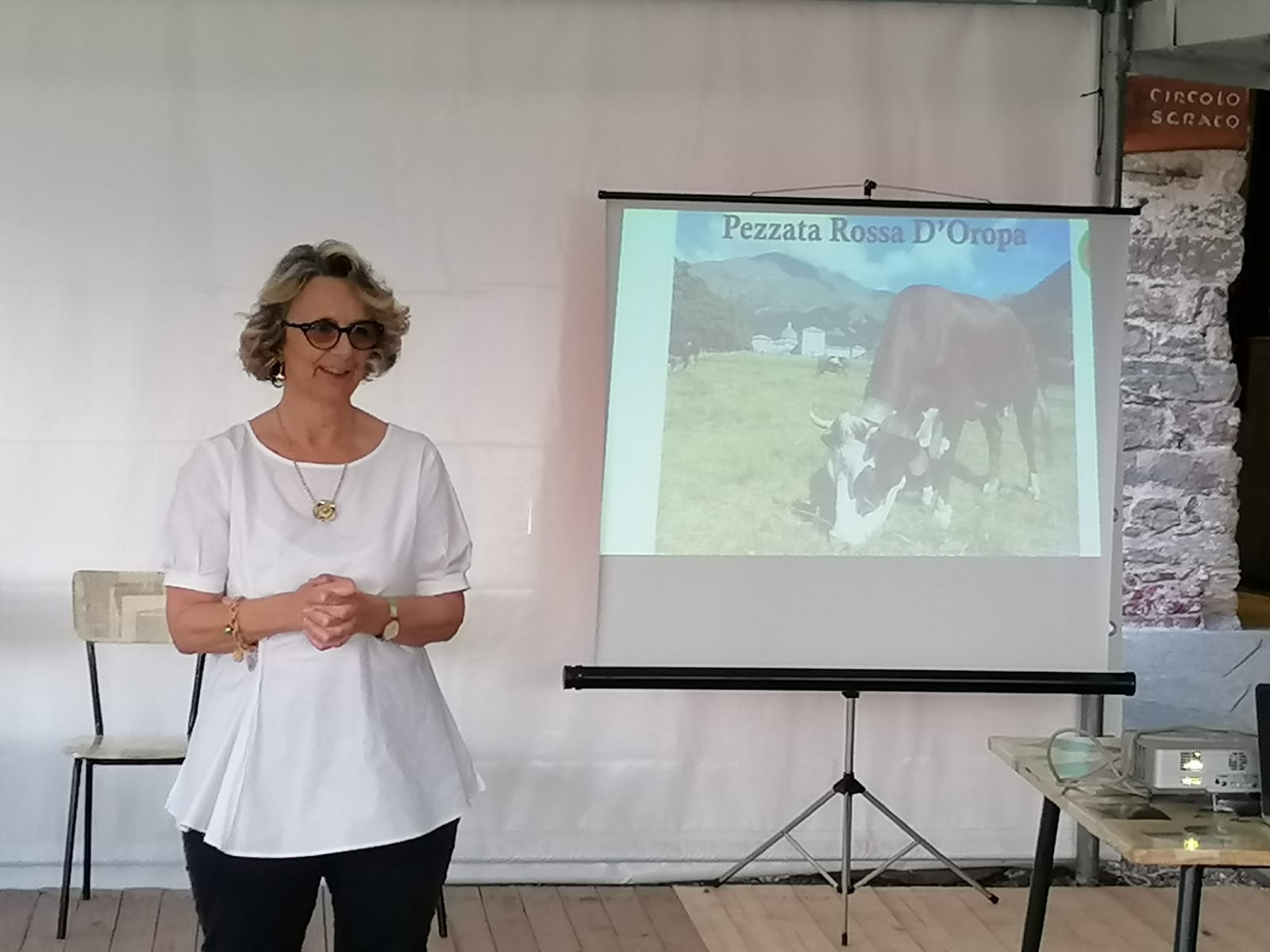 La Delegazione di Biella ha organizzato un convivio sulla razza autoctona di vacca locale, la Pezzata Rossa di Oropa, presente tra le valle dei torrenti Elvo e Oropa. La Pezzata Rossa d’Oropa è un animale in via di estinzione che si adatta bene agli ambienti scoscesi e impervi di alta montagna; ha il mantello pezzato bianco, rosso e nero. La sua carne è saporita e il suo latte viene utilizzato per produrre la tipica toma biellese ed il burro d’alpeggio. La serata presso il ristorante alpestre “Circolo San Grato“ di Sordevolo è stata introdotta dalle relazioni di due esperti: Francesca Ribaldone, neo laureanda in “Produzione e gestione degli animali in allevamento e selvatici”, che ha presentato la parte zootecnica, mentre la parte sulla valorizzazione della carne di Pezzata Rossa in campo alimentare è stata curata da Alberto Mosca, titolare di una macelleria. È seguita una degustazione sul tema. Foto 1. La Delegata Maria Luisa Bertotto mentre introduce la serata. Foto 2. I due relatori Ribaldone e Mosca. Foto 3. Da sinistra: lo chef Marco Botto, Francesca Ribaldone, la Delegata Bertotto e Alberto Mosca. Foto 4. Partecipanti.