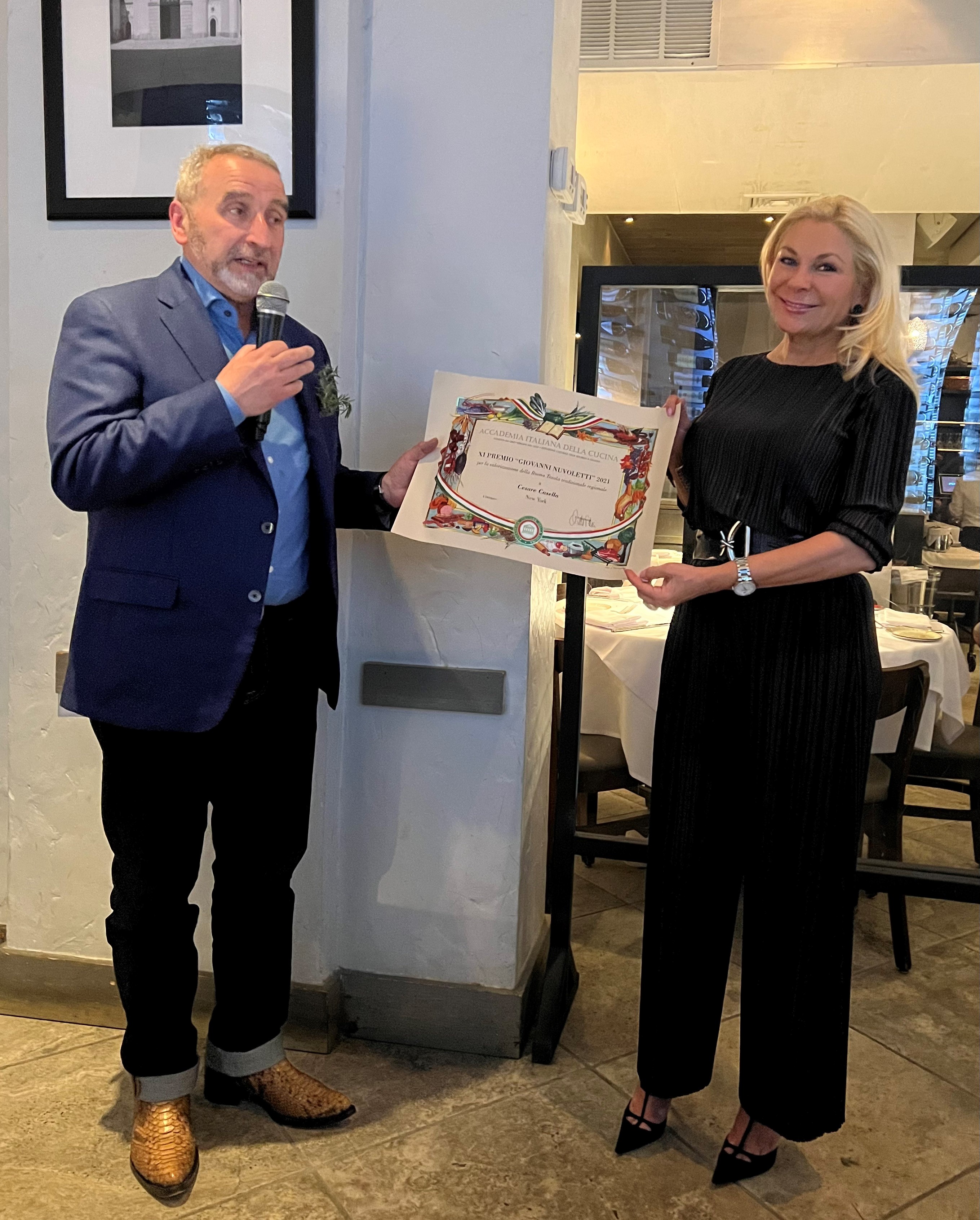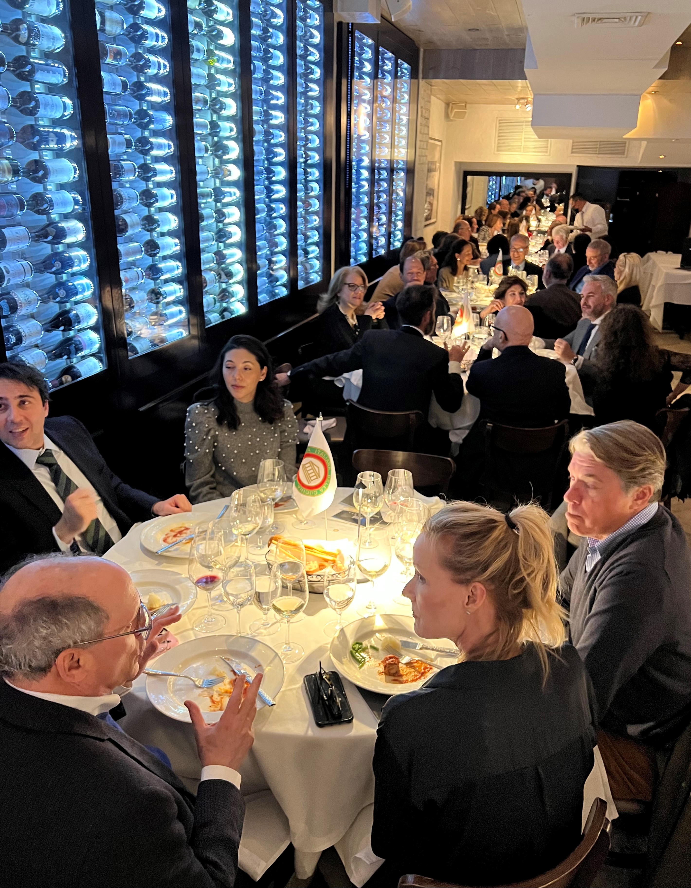 La riunione conviviale per celebrare l’arrivo della primavera è stata organizzata dalle Simposiarche Maria Palandra e Francesca Verga (in foto 1 con la Delegata Roberta Marini de Plano e il manager del ristorante Gianni Onofri) presso la “Masseria dei vini”, un ristorante dell’Upper West Side conosciuto per la cucina pugliese. Ad aprire la serata, il saluto del direttore dell’Istituto Italiano di Cultura a New York dott. Fabio Finotti. Un evento con ospiti numerosi (foto 2) in un locale caloroso e con un servizio attento. Molto apprezzato dagli Accademici il menu proposto, soprattutto l’assaggio di antipasti e la pasta di grano antico di Rutigliano con fagioli e frutti di mare, un piatto squisito e molto particolare. In questa occasione la Delegazione ha dato il benvenuto alla nuova Accademica Anissa Nouhi (foto 3 con Delegata) ed è avvenuta la consegna a Cesare Casella (foto 4) del Premio Giovanni Nuvoletti (2021). Durante la cena, un particolare ricordo all’amico e leggendario Tony May, recentemente scomparso, che ha contribuito alla diffusione della cucina italiana negli USA.