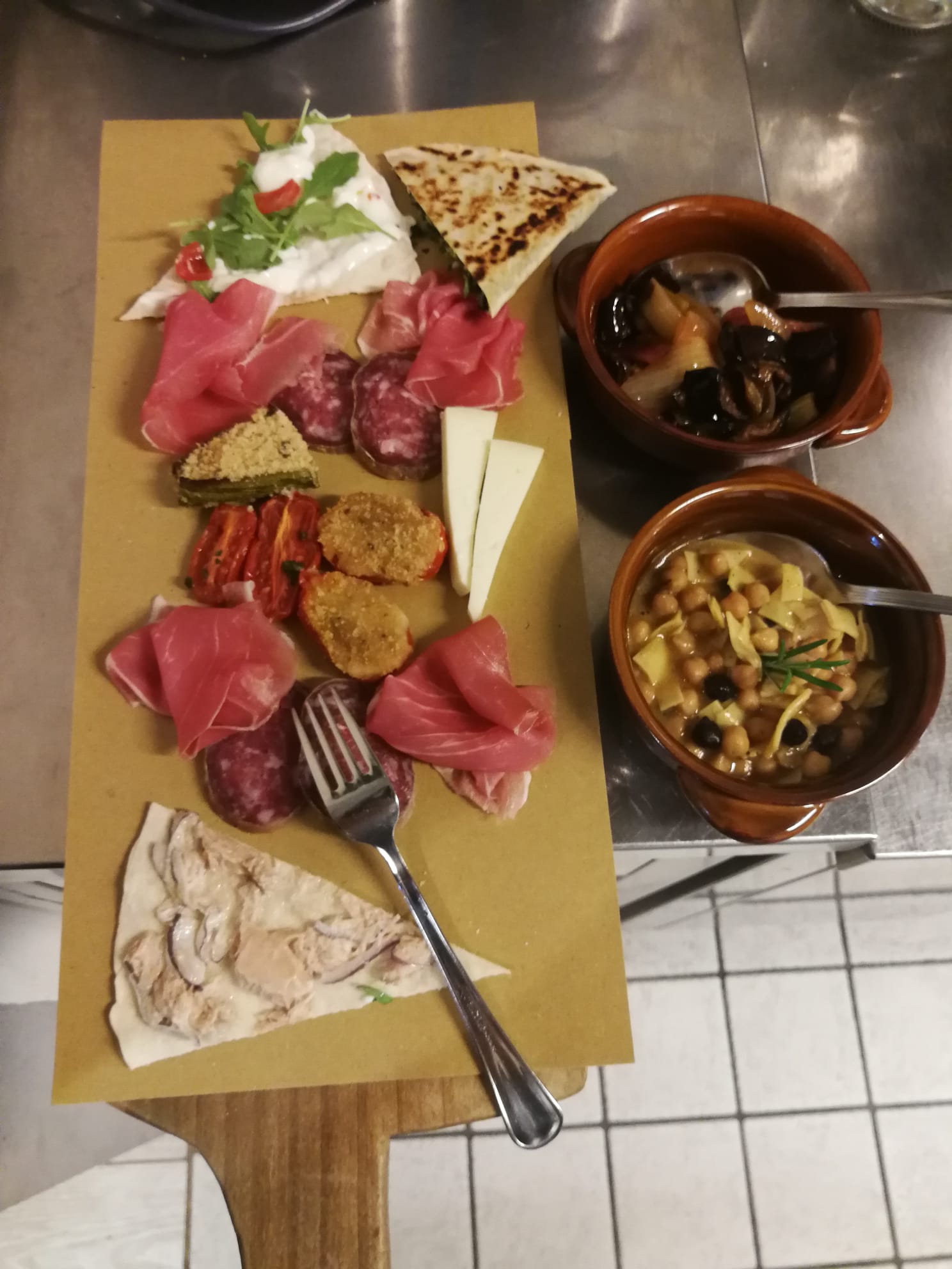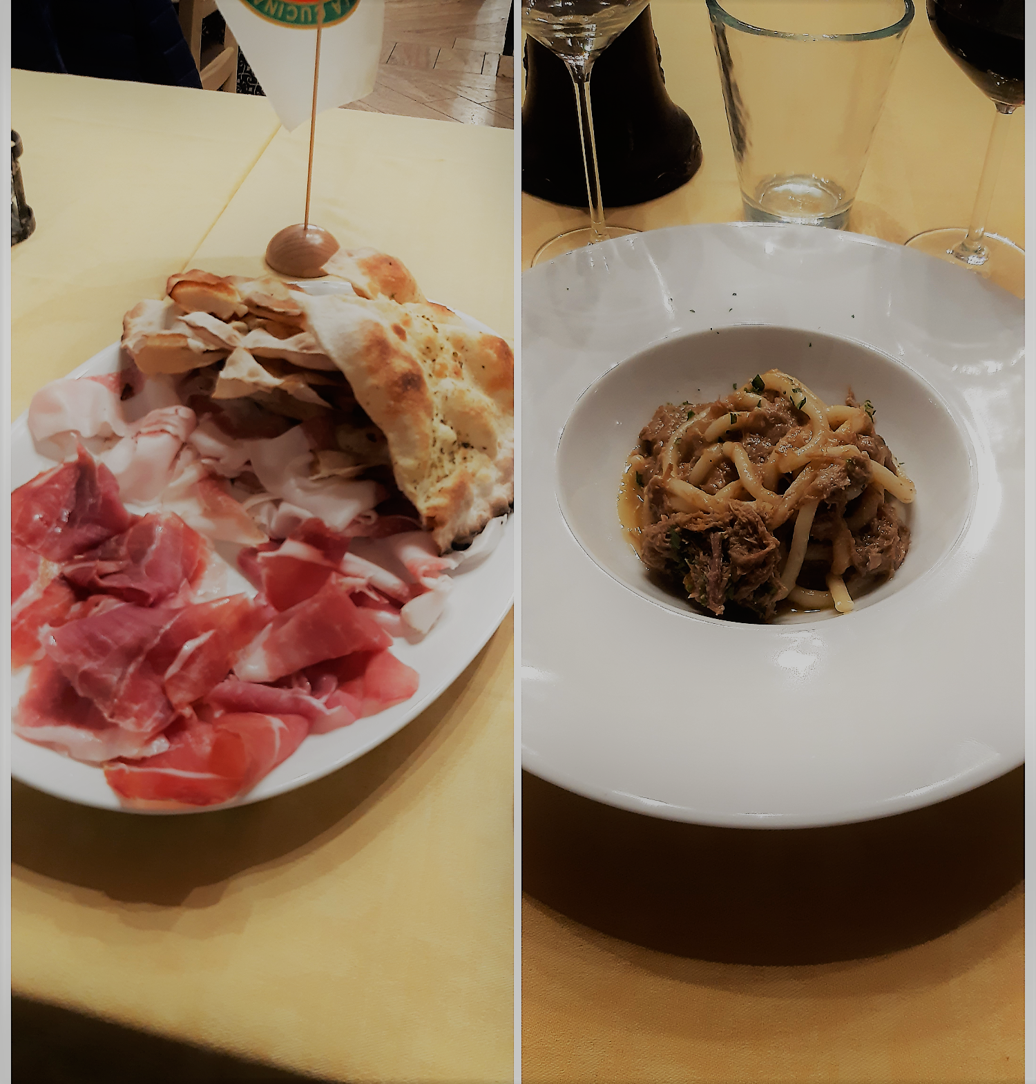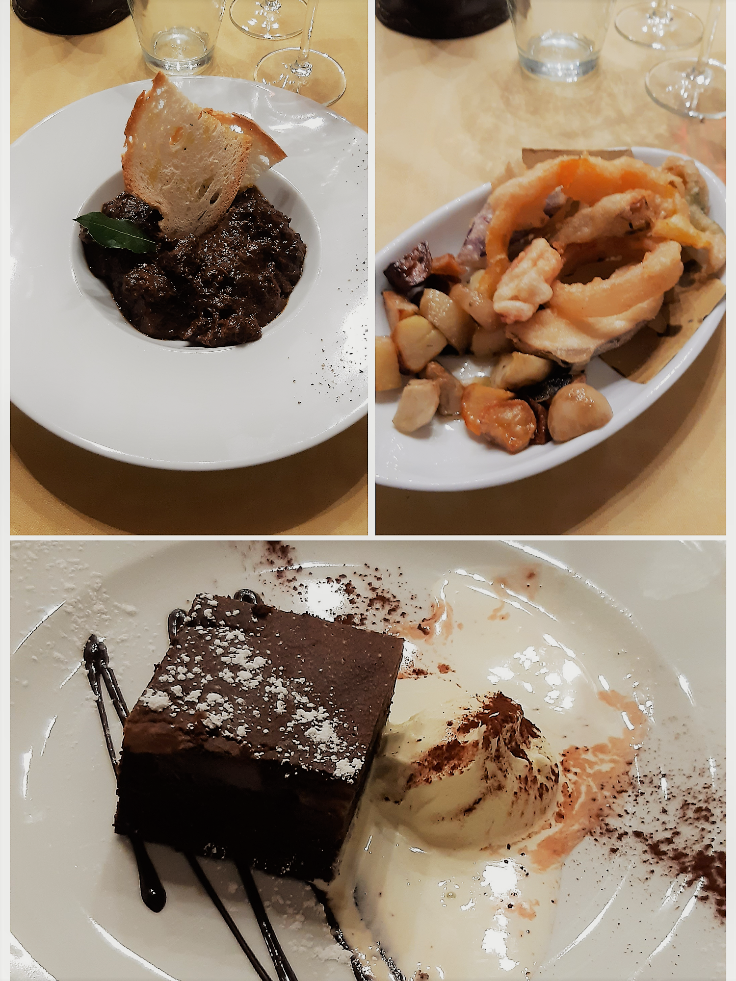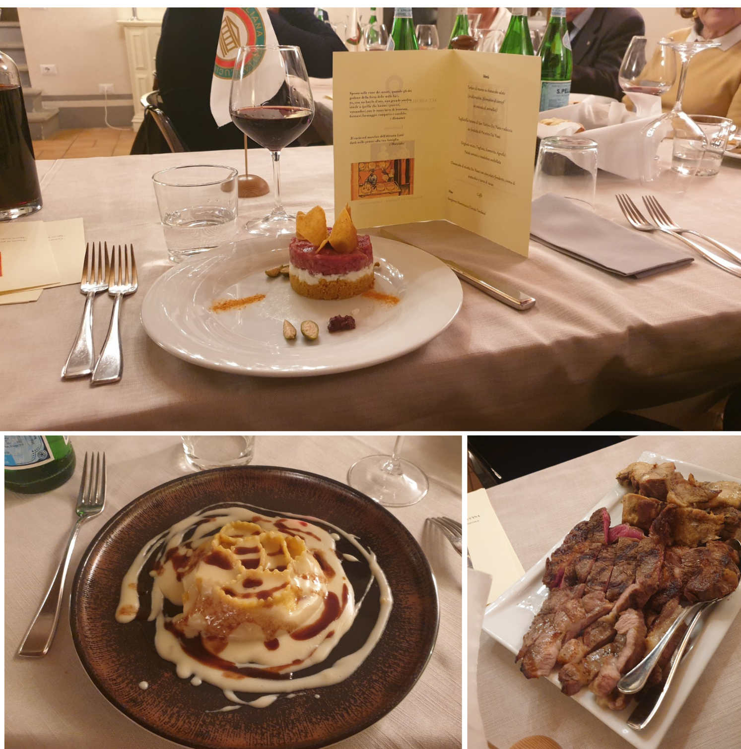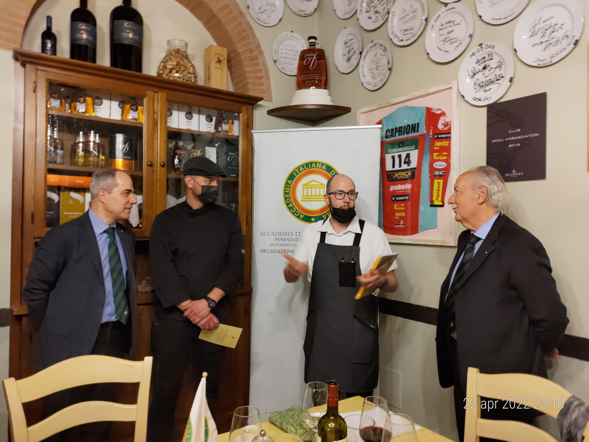 Per la riunione conviviale di aprile, la Delegazione del Valdarno Fiorentino si è riunita presso il ristorante "Osteria de' Giusti" in località Ciliegi - Reggello, famoso per il suo "Gran Fritto". Il Simposiarca Francesco Corsico ha voluto presentare per l'occasione un menu completamente nuovo, riscuotendo unanimi apprezzamenti. Lo chef Damiano Baloni ha cucinato per l'occasione: un antipasto a base di focaccia calda, lardo di Colonnata e prosciutto casalingo al coltello, pici al ragù bianco di anatra, spezzatino di cervo con verdure fritte, accompagnato con un buon Rosso di Montepulciano Poliziano, torta di pere e cioccolato con gelato alla crema. Particolarmente apprezzati il sapore dolce e delicato del ragù bianco di anatra e la morbidezza e la succosità dello spezzatino di cervo. Al termine della serata il Delegato Sandro Fusari ha voluto ringraziare la proprietà e lo chef consegnando loro un volume dell'Accademia (foto 1). Gli Accademici, particolarmente soddisfatti della serata, hanno posato tutti insieme per una foto ricordo (foto 2). Foto 3 e 4. Le portate.