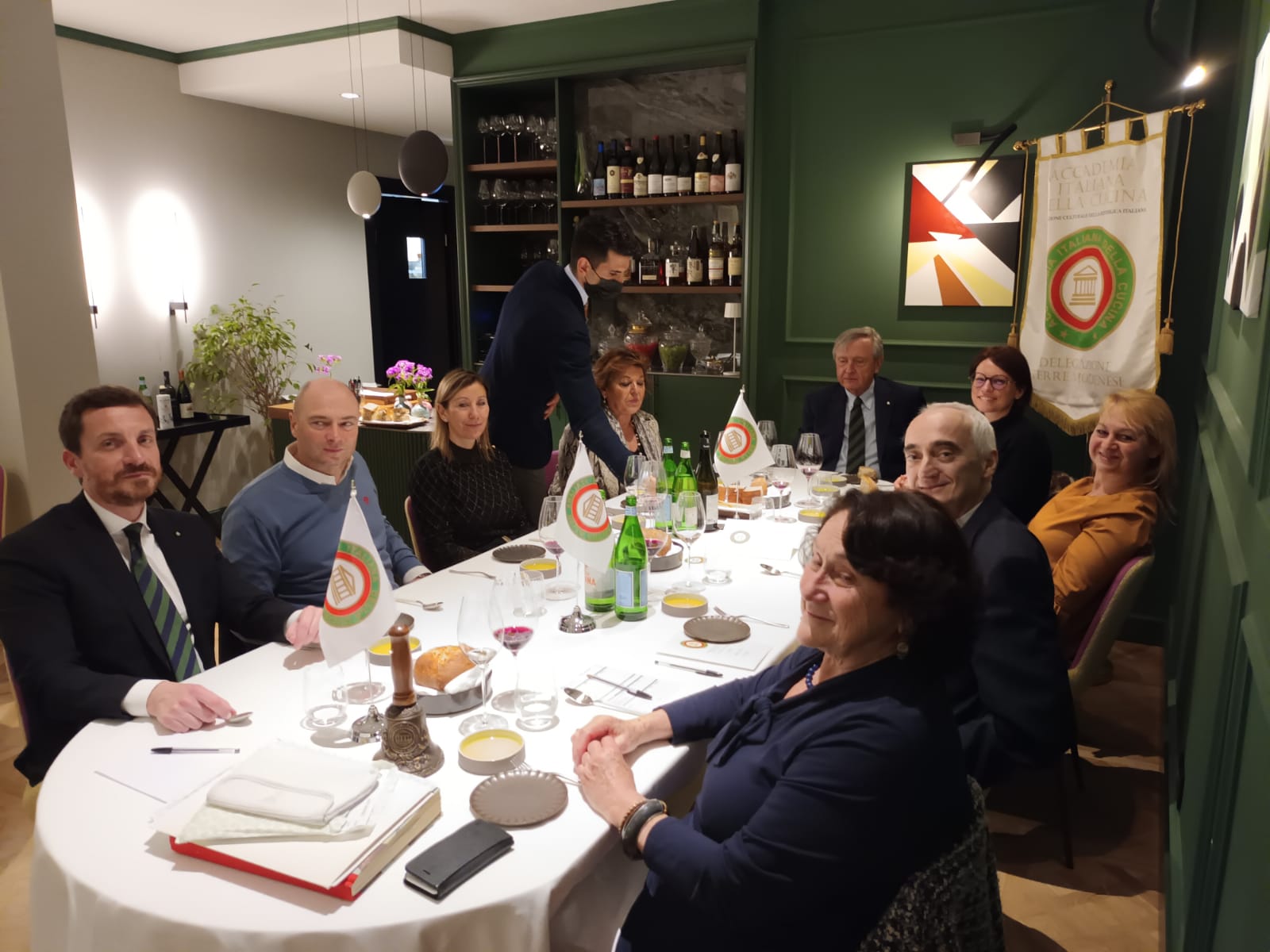 La riunione conviviale di aprile della Delegazione si è svolta presso il “Ristorante Del Lago” di Acquapartita, accogliente località dell’Appennino cesenate. Per l’occasione, il Simposiarca Stefano Valzania ha presentato un ricco e stuzzicante menu di degustazione, curato insieme a Simone e Andrea Bravaccini, chef e sommelier del locale. I piatti hanno riscosso il generale e convinto gradimento dei partecipanti che ne hanno apprezzato l’equilibrio dei sapori e la cura della presentazione; un giudizio particolarmente positivo è stata dato alla crema di cenere di porri e al cinghiale con spuma di patate. Molto apprezzato anche il servizio, puntualmente accompagnato da una esauriente spiegazione dei piatti e dei vini selezionati in abbinamento. Dopo la consegna del piatto d’argento e del guidoncino della delegazione a Catia Bartolini e Paolo Bravaccini, appassionati gestori del locale, e alla brigata di cucina, la serata si è conclusa con un festoso brindisi augurale per le festività pasquali.