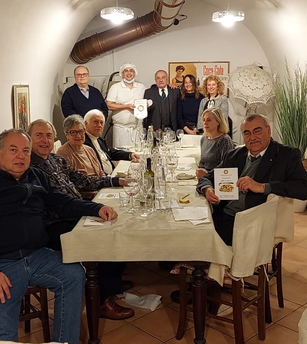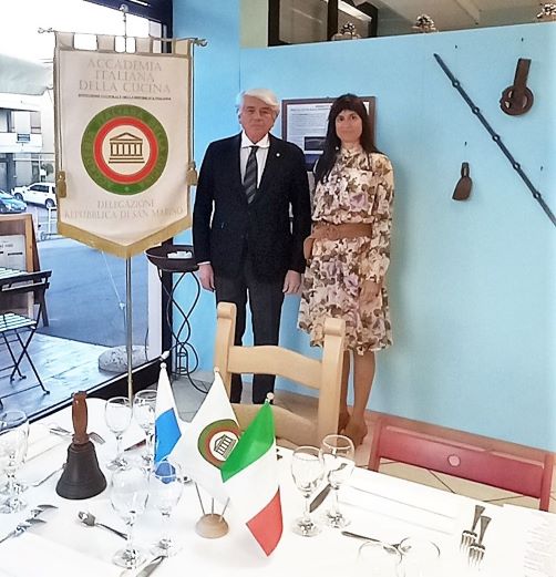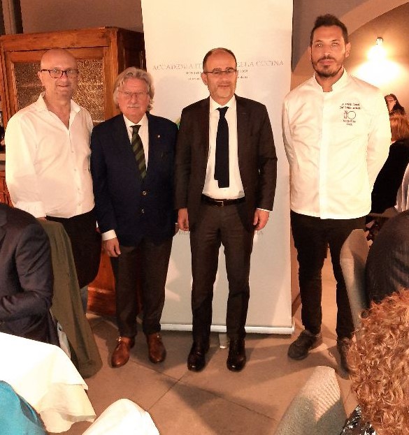 La Delegazione di Riccione-Cattolica si è riunita presso l’Osteria Urbini di Riccione. Il locale è aperto da pochi anni e ha una storia molto particolare: si tratta del trasferimento in riva al mare di un’osteria della campagna cesenate che, non potendo più continuare la sua attività di somministrazione di alimenti e musica agli amici che gravitavano attorno al “museo Urbini”, ha riprogrammato la sua attività gastronomica, rigorosamente di tradizione e modi contadini, a pochi metri dalla spiaggia di Riccione. I titolari (Maurizio Urbini e la moglie Carla Tognacci) hanno mantenuto i legami con i vecchi amici nonché produttori di quanto necessario per la conduzione della precedente Osteria a Masrola di Borghi (FC). La freschezza e la genuinità di quei prodotti sono la base della cucina anche della nuova Osteria e i sapori e i profumi sono quelli della più rigorosa tradizione di campagna. Ne è risultata una riunione conviviale sorprendente, di elevato gradimento da parte di tutti i presenti, con evocazionedi profumi e sapori di altri tempi e di emozioni da “pranzo di famiglia” domenicale. Elevato il livello della materia prima usata, di primissima qualità. Cappelletti in brodo come non se ne mangiavano da tempo, a giudizio di tutti. Coniglio alle olive impareggiabile. Ospite gradito della Delegazione, il Prefetto di Rimini dott. Giuseppe Forlenza (in foto 1 con il Delegato Giavolucci) che ha elogiato la meritoria e importante attività culturale dell’Accademia sul territorio.