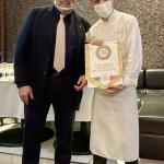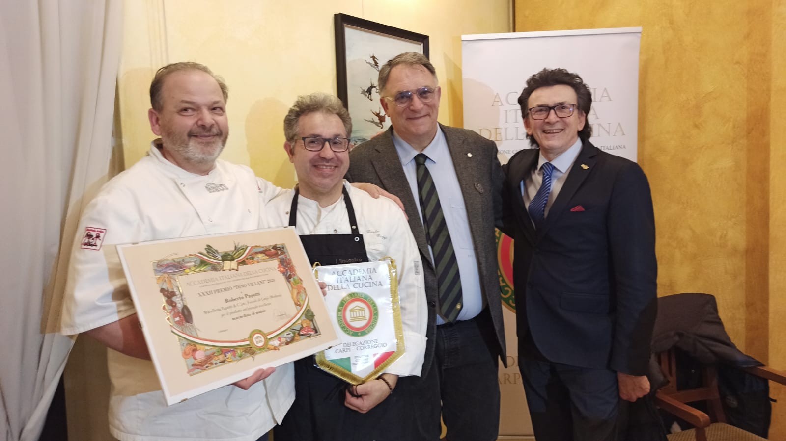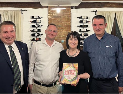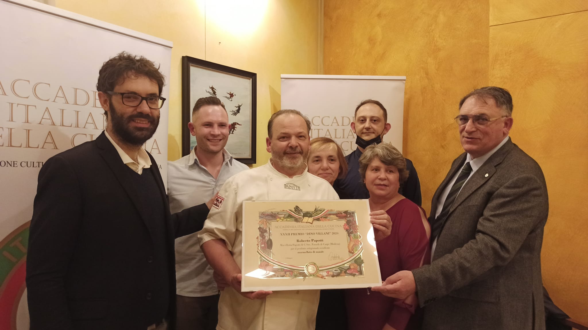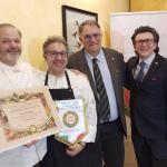 Dopo due anni resi difficili dalla difficoltà di riunirsi in tanti in un ristorante, la Delegazione ha consegnato ufficialmente il premio "Dino Villani 2020" alla macelleria Papotti di Roberto Papotti (Fossoli di Carpi - MO) per l'eccellenza dei suoi prodotti e in particolar modo per la "Marmellata di Maiale" prodotta in esclusiva dall'azienda carpigiana. A consegnare il premio in occasione della riunione conviviale al ristorante L'Incontro di Carpi è stato il Delegato e CT Emilia Pier Paolo Veroni insieme al dott. Dalle Ave, assessore all'Istruzione del Comune di Carpi. A festeggiare l'evento organizzato dalla Consulta - in particolare Giuseppe Calabria, Marco Catellani, Fabrizio Stermieri - anche Gianfranco Zinani, recentemente chiamato a far parte della commissione per l'assegnazione della certificazione Carpi Deco che riconosce la tipicità dei prodotti d'eccellenza carpigiani. Il menu proposto dalla chef Carlo Gozzi è stato realizzato con la collaborazione della macelleria Papotti. Foto 1. Da sinistra. Assessore dalle Ave, Papotti con famiglia e il suo staff, Veroni. Foto 2. Papotti, Gozzi, Veroni e Zinani. Foto 3. Un momento conviviale con gli Accademici Decaroli e Massari. Foto 4. Alcune portate: crostino di manzo; passatelli di carne in brodo; hamburger di manzo; cassata all'italiana.
