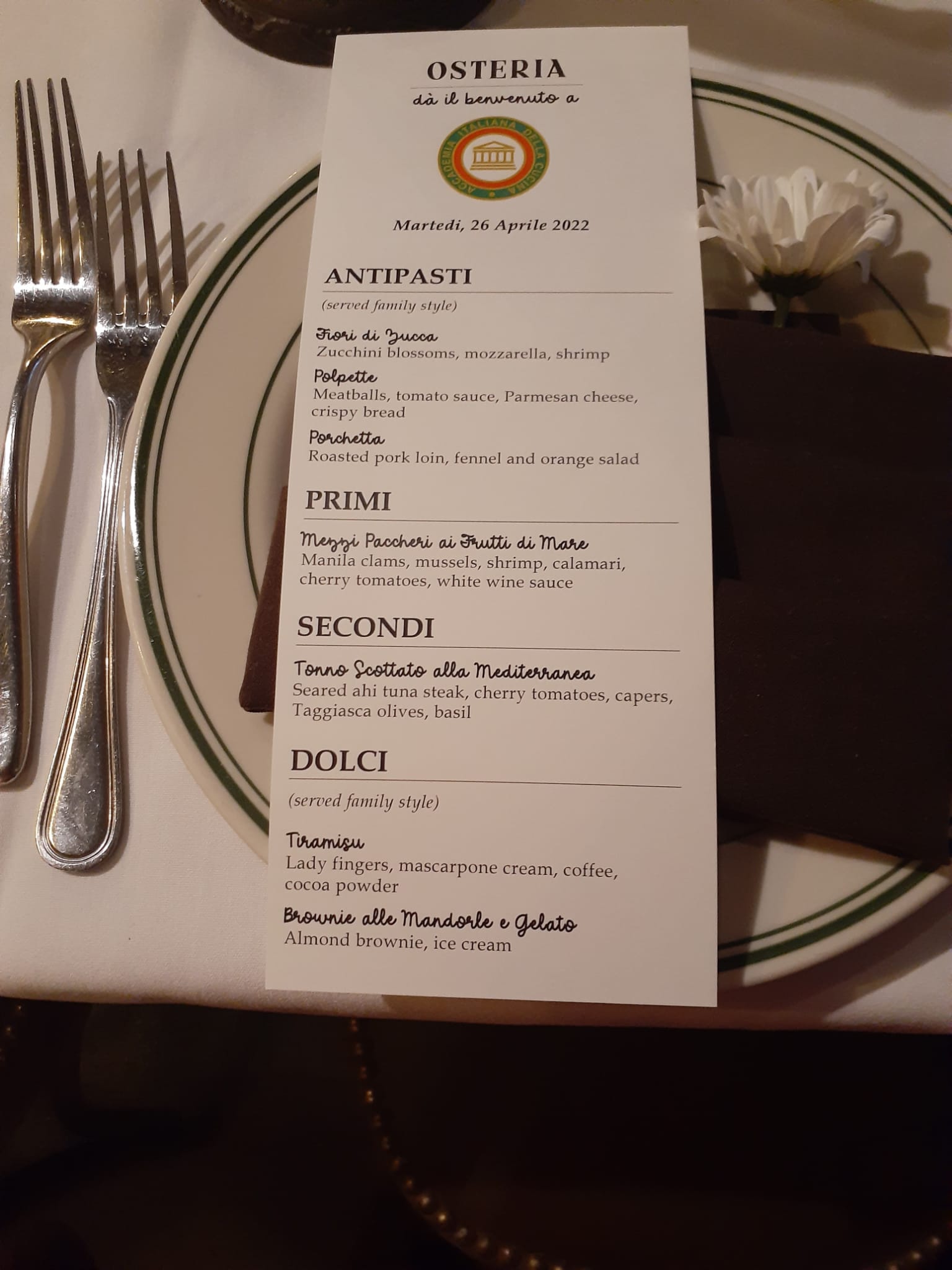 Riunione conviviale di aprile della Delegazione presso il ristorante Osteria, situato nel MiMo District di Miami. Il locale, recentemente rinnovato negli arredi, appartiene al gruppo Graspa, già presente da molti anni sul territorio con successo. Graditissima la presenza all'evento del Consigliere di Presidenza Alessandro Di Giovanni che nel suo discorso ha portato il saluto del Presidente Paolo Petroni. La cena ha visto la partecipazione di 60 commensali e si è svolta in un clima di grande cordialità. Molto apprezzati il menu dello chef Gianluca Calisi e la scenografica sistemazione dei tavoli creata dal manager co-owner Angelo Cometa.