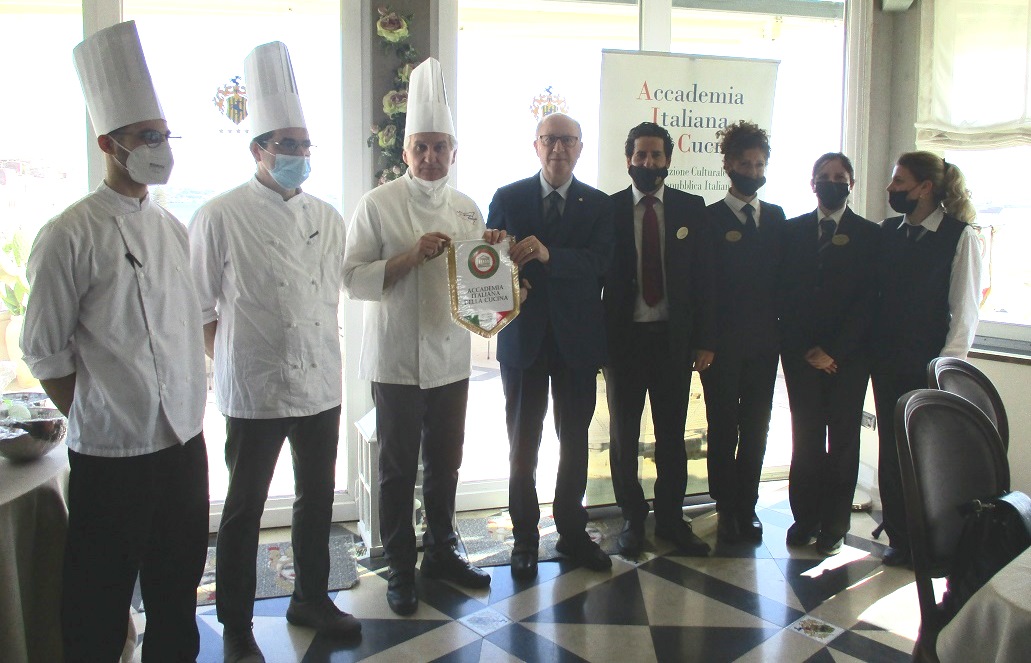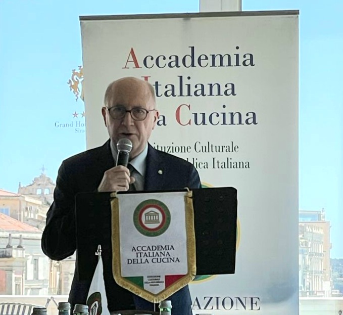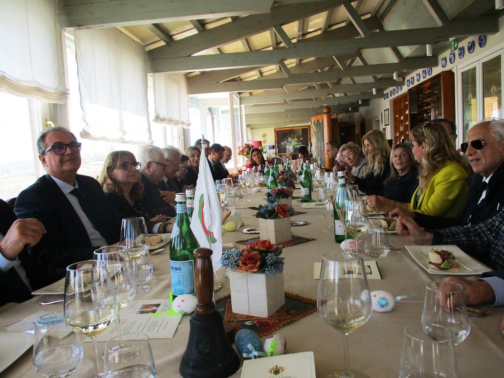 La Delegazione di Siracusa si è riunita presso il ristorante “La terrazza sul mare” del Grand Hotel Ortigia (foto 1). Simposiarca il Delegato Angelo Tamburini che ha presentato le tradizioni pasquali nel Siracusano, riscuotendo attenzione e apprezzamento (foto 2). La sequenza delle pietanze in tavola è stata molto curata sia nella preparazione realizzata dallo staff di cucina guidato dall' executive chef Giorgio Rimmaudo sia nel servizio attento e sollecito con la regia del maestro di sala e dei vini, Lorenzo Bramante. Il menu (foto 4): turbante di branzino al pane perduto; mezze maniche al pesto di pistacchi di Bronte, dentice e limone di Siracusa; ricciola in salsa d'arancia e finocchi con caponatina; sorbetto di agrumi; semifreddo di mandorla siciliana con colatura di cioccolato modicano e terroso di vaniglia; in buon abbinamento con i vini. Infine la consegna del guidoncino e della vetrofania 2022 alle brigate di cucina e di sala con l'applauso degli Accademici (foto 3).