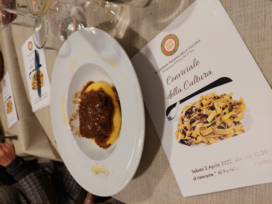 La Delegazione di Borgo Val di Taro, nel novero delle attività programmate sul territorio, ha celebrato la riunione conviviale della cultura riportando il tema dell'anno "La tavola del contadino: il campo, il cortile, la stalla, nella cucina della tradizione regionale". L'intervento culturale dell'Accademico Giuseppe Conti, membro del CST dell'Emilia, ha posto l'accento su tre importanti aspetti che contraddistinguono il territorio emiliano che, ben diversificato in pianura, collina e montagna, presenta piatti e pietanze con prodotti altrettanto diversificati nelle fonti alimentari e vegetali. Il menu proposto dallo chef Simone del ristorante "Al Portello" di Borgotaro, ha rispecchiato, in considerazione degli argomenti esposti, una cucina d'impronta casalinga che si esprime e valorizza con originalità. Presente il Sindaco di Borgotaro che ha salutato e ringraziato gli Accademici per l'impegno nel promuovere iniziative tese a salvaguardare i valori della tradizione locale in traguardo dei 60 anni che saranno raggiunti nel prossimo anno. Foto 1. Accademici, ospiti, titolari e chef. Foto 2. Torta d'erbe, patate e riso; tagliatelle ai porcini. Foto 3. Risotto con asparagi; budino di ricotta. Foto 4. Brasato con polenta.