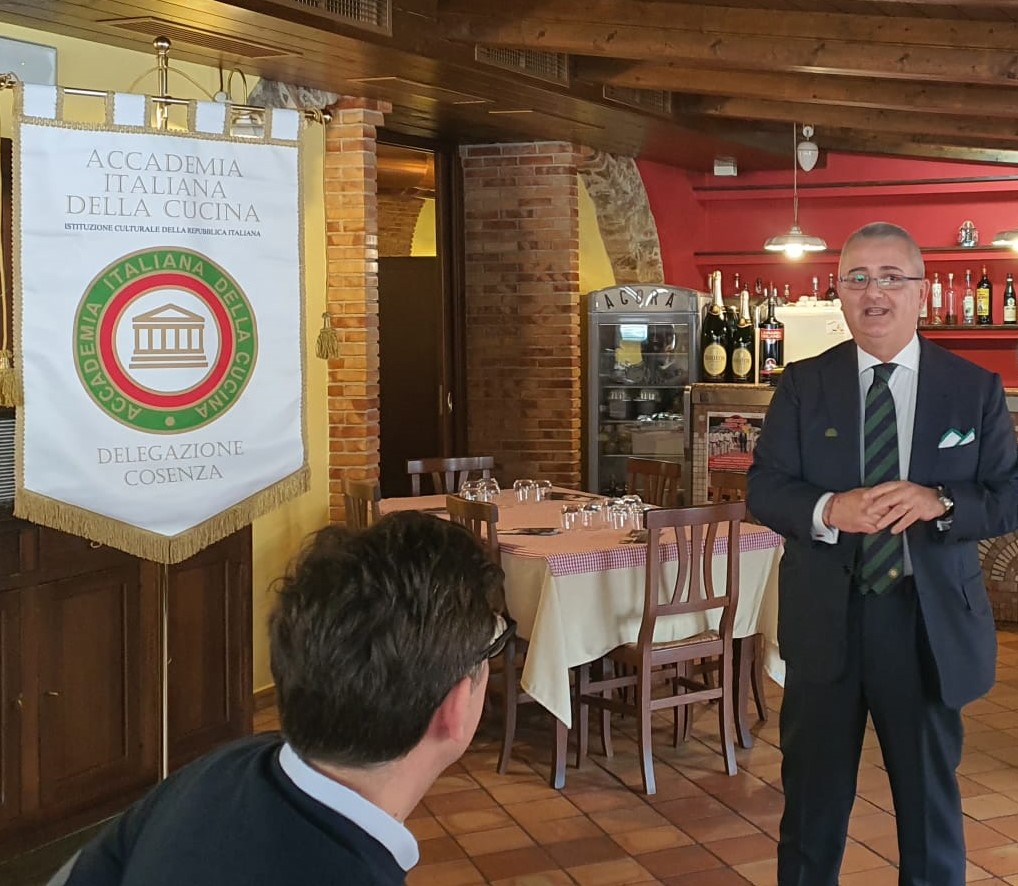Simposiarca l’Accademico Roberto Chiodo (foto 1), è stato finalmente possibile tornare a tenere la tradizionale riunione conviviale per lo scambio degli auguri pasquali questa volta organizzata presso il ristorante Agorà di Civita (CS), ristorante tipico calabrese con cucina arbreshe. Nella simbologia cristiana, così come è stata fatta propria dalla tradizione popolare, passata la quaresima, Pasqua diventa il segno del rinnovamento, l'aspirazione alla gioia e alla rinascita, complice la natura con la sua luce e i suoi colori. Ed è stato questo l’augurio della Delegazione in questo periodo particolare. Nel corso del tempo, leggende e miti fioriti intorno alla ricorrenza pasquale hanno finito per confondersi con i riti religiosi e con i tanti simboli presi a riferimento. In primis, le preparazioni di dolci e pietanze entrati a pieno titolo nelle tradizioni di ogni territorio. Con un po' di sana leggerezza si è scelto di ripercorrere qualche tratto di quelle arbereshe grazie alla felice accoglienza della famiglia Nicoletti, dello staff del loro ristorante Agorà e dello chef Antonio Carbone (foto 2) che ha realizzato in estemporanea le “Shtridhle”, una delle loro paste iconiche.