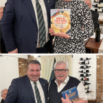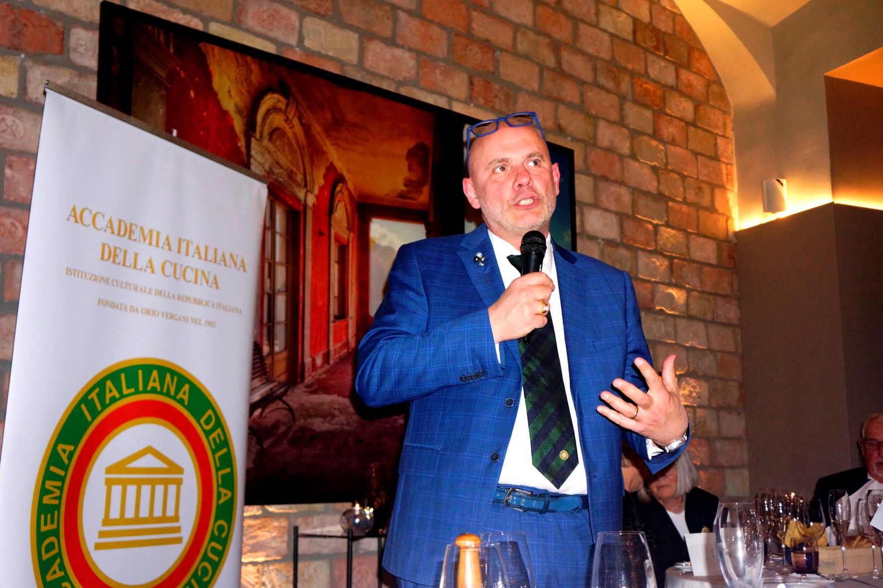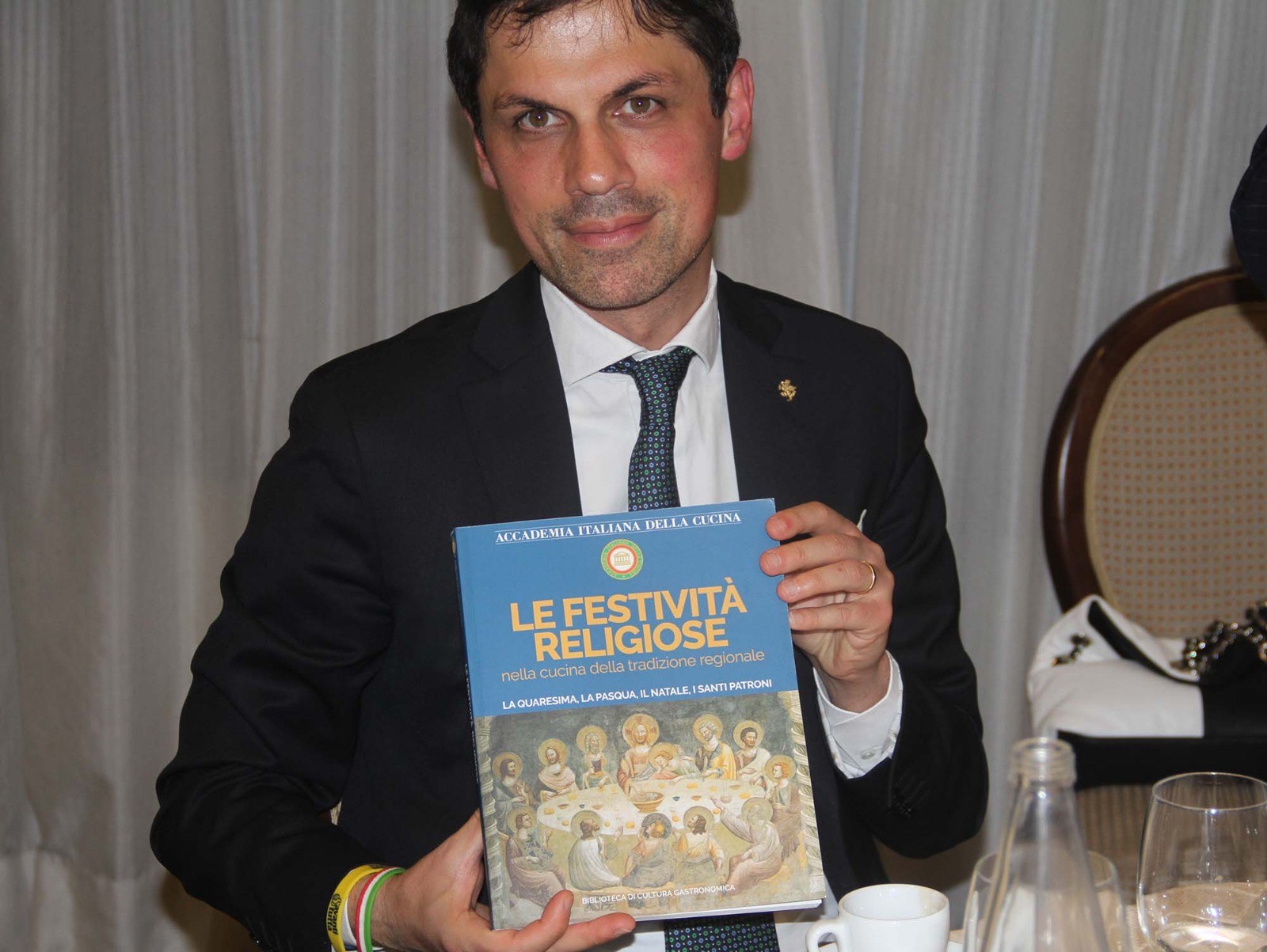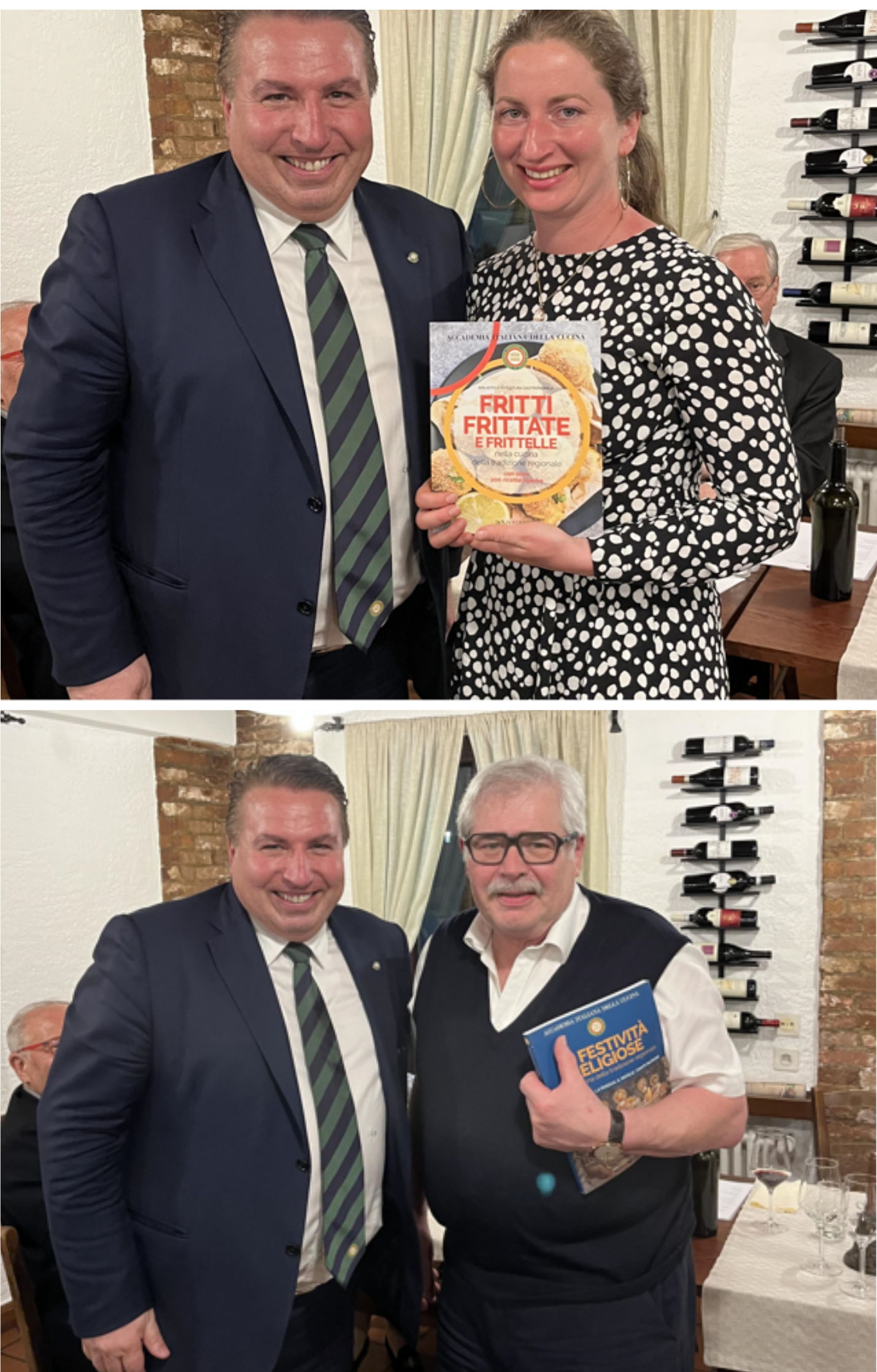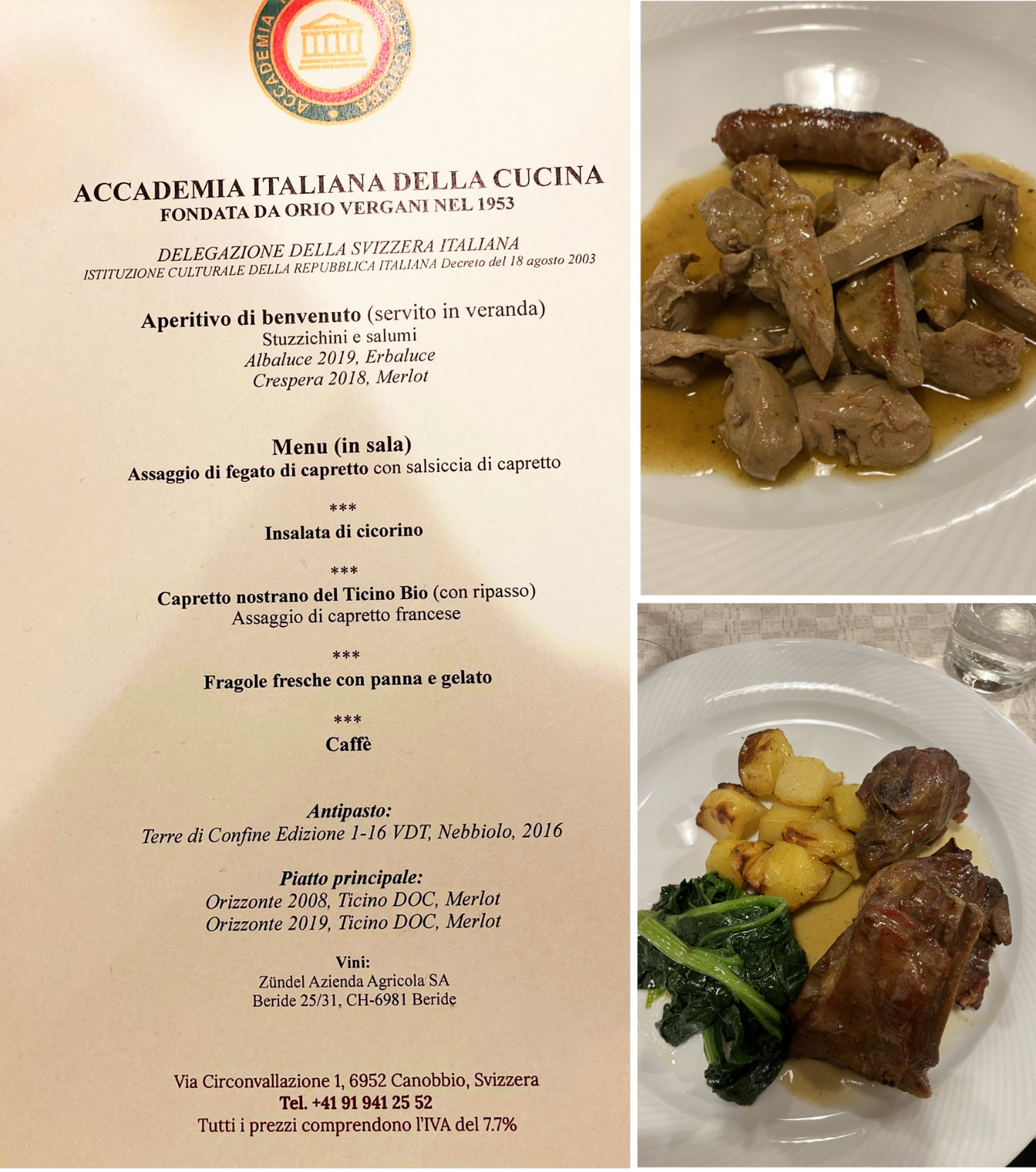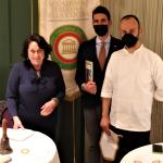 La Delegazione della Svizzera Italiana si è ritrovata presso il Canvetto Federale a Canobbio per una serata conviviale pre-pasquale dedicata al capretto arrosto, un piatto della tradizione ticinese. Ospiti della serata sono stati: Mauro Prada, uno degli ultimi mastri macellai rimasti in Ticino, grandissimo conoscitore e consulente sia della materia prima sia dei migliori fornitori del settore che ha disquisito sul tema. Mentre Myra Zündel, viticoltrice e proprietaria dell’Azienda di famiglia ha commentato tutti i vini in abbinamento. Durante la serata è stato festeggiato l’Accademico onorario Salvatore Maria Fares per i suoi 35 anni di appartenenza al sodalizio. Tutti felici e soddisfatti i 39 partecipanti alla seconda riunione conviviale dell’anno. Foto 1. Da sinistra, Accademico onorario Salvatore Maria Fares e Delegato Emilio Casati. Foto 2. (da sinistra in alto) Myra Zündel; Mauro Prada. Foto 3. La brigata di sala. Foto 4. Piatti e menu.