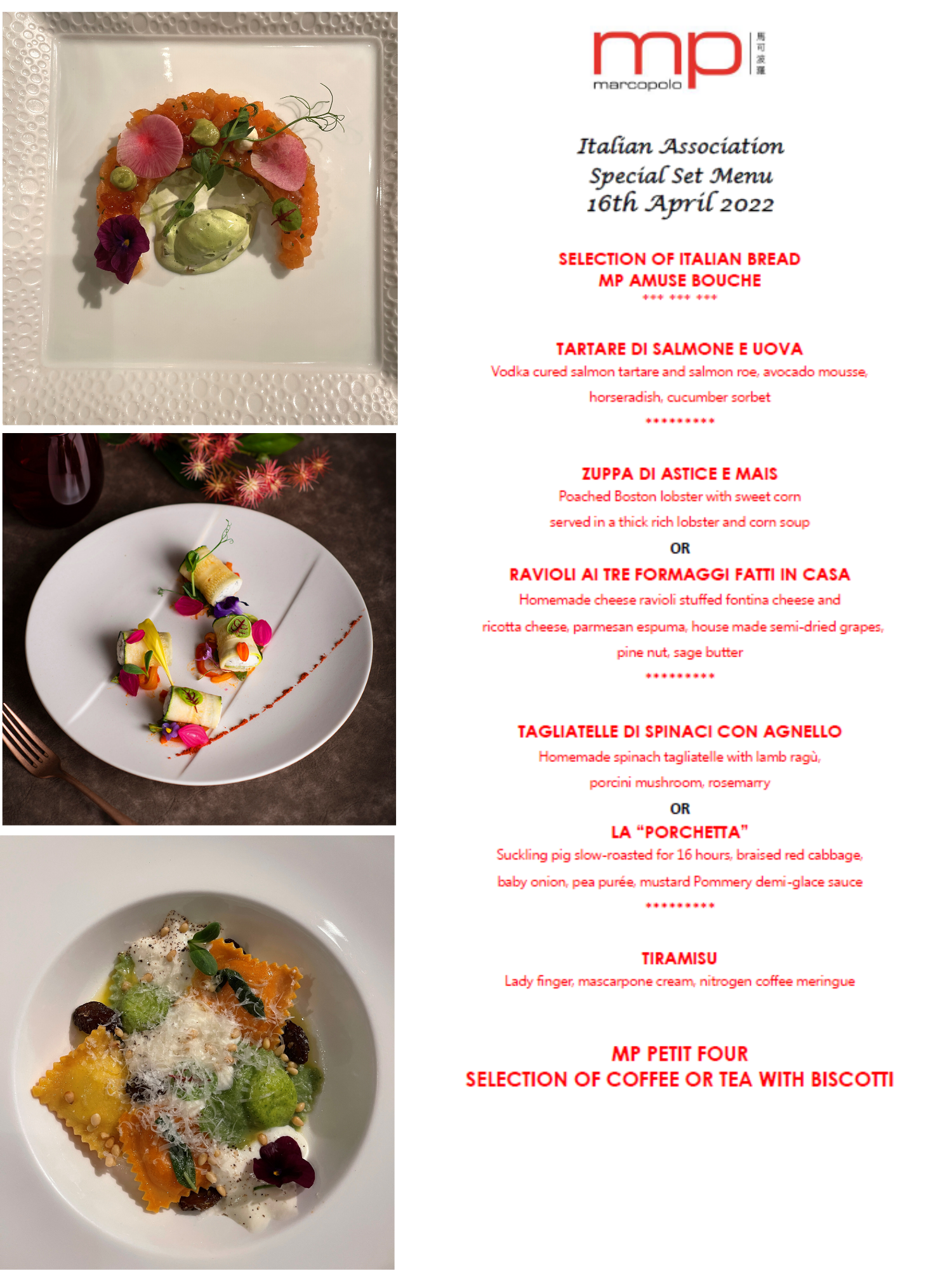 Gli Accademici di Taiwan e loro ospiti hanno festeggiato la ricorrenza pasquale il 16 aprile in uno dei ristorante piu famosi di Taipei, "Marco Polo" (all’interno dell’albergo Shangri-La), con un evento splendidamente realizzato dal General Manager Marco Vazzoler. Il menu preparato dallo chef David Hsu è stato apprezzato da tutti i commensali e servito in un esclusivo privé del ristorante. David Hsu, Chef de Cuisine nel ristorante Italiano Marco Polo, ha oltre un decennio di esperienza culinaria in alcuni dei migliori ristoranti di Taipei insieme a famosi chef italiani pluripremiati. Non solo si tiene aggiornato sulle tecniche di cottura più innovative, ma utilizza questi metodi per trasformare la cucina tradizionale italiana in un moderno viaggio gastronomico. Una delle sue pratiche preferite è come integrare gli ingredienti di provenienza locale nei suoi piatti stagionali che sono ben accolti dagli ospiti. Entusiasta e modesto, lo chef David presenta con cura gli autentici sapori italiani con un tocco taiwanese e si prepara a stupire i commensali con le sue nuove creazioni. Nelle foto: un momento della serata; lo chef David Hsu; il menu e i piatti serviti.