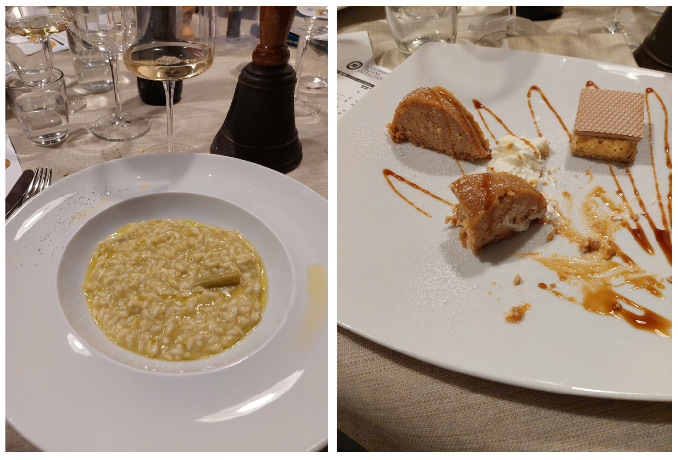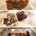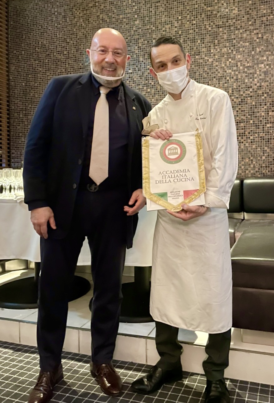 Secondo appuntamento del 2022 dedicato alla cucina del territorio in occasione del quale sono stati consegnati i riconoscimenti di anzianità ultra quarantennali alla presenza e per mano del Prefetto di Novara, dott. Francesco Garsia, ospite della Delegazione. Hanno ricevuto le onorificenze rispettivamente per i 40, 50 e 54 anni di appartenenza accademica: il Delegato Piero Spaini (foto 1 con il Prefetto Garsia); l'Accademico Franco Ceffa, il Consultore Cesare Varalli (entrambi in foto 2 con Delegato e Prefetto). La riunione conviviale si è tenuta presso “La Locanda a Cameri”, poco distante dal centro città e qui la Delegazione ha ritrovato lo chef Corrado Lombardo, tornato a casa dopo numerose e importanti esperienze in rinomati ristoranti all’estero. Serata molto piacevole e interessante vissuta nelle eleganti sale della Locanda recentemente ristrutturata e valorizzata dai titolari Alberto Corbellini e Marina Zanotti Fragonara (in foto 3 da sinistra: il titolare Corbellini, il Delegato Spaini, il Prefetto Garsia e lo chef Lombardo). Piatti mai banali, concreti, con gusti ben distinti e cotture appropriate che hanno messo in risalto i prodotti del territorio e le capacità dello chef. Pane, grissini e focacce fatte in casa hanno stuzzicato subito l’appetito degli ospiti insieme ad un paio di amuse-bouche accompagnati da un sorso di Vermouth Americano. Due antipasti, poi lingotti di riso al forno con ragù di coniglio, guancia di maialino a lunga cottura e cheesecake fretta al cioccolato al latte (foto 4).
