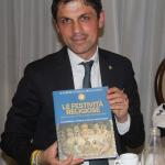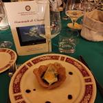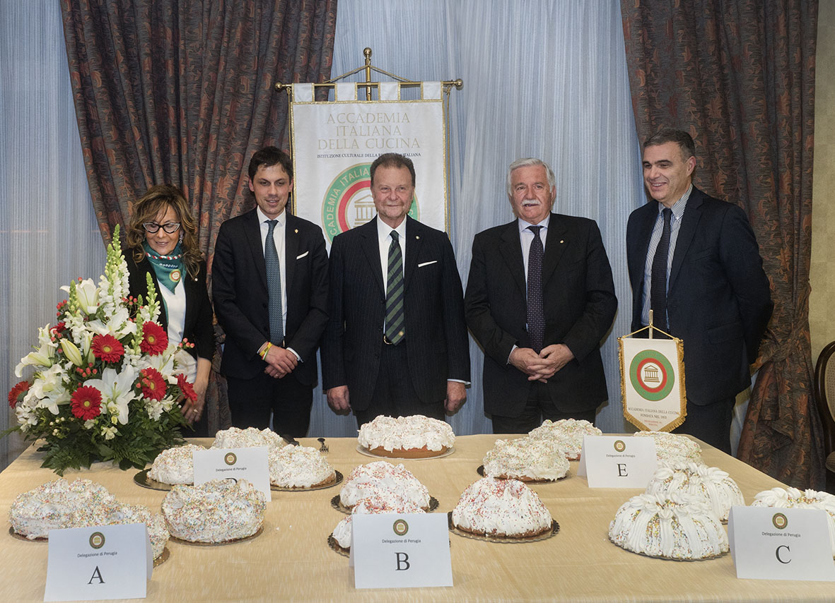 La ciaramicola protagonista della riunione conviviale organizzata dalla Delegazione di Perugia. In onore del dolce identitario della città, insieme al Torcolo di San Costanzo, la Delegazione ha organizzato una serata presso il ristorante Fortebraccio del Perugia Plaza Hotel nel corso della quale ben cinque realtà pasticcere della città si sono cimentate nella gara su quale fosse la più buona, la più bella e la più rispondente alla tradizione. I maggiori consensi sono andati a quella realizzata da "Faffa il Fornaio dal 1851", storica attività con sede a Ponte Valleceppi. L'Ottava di Pasqua è stata celebrata dallo chef Marco Andrea Urbanelli che ha concordato con il Simposiarca Marilena Moretti Badolato un menu con gli elementi tipici del periodo. Dalla coratella di agnello alla marchigiana frittata con la mentuccia, piatto forte un tenerissimo e succoso cosciotto d'agnello. Unica eccezione una "futurista" lasagna, novità dello chef. E poi la degustazione delle ciaramicole, tradizionale e plurisecolare preparazione illustrata dalla Simposiarca. Foto 1. Il tavolo delle ciaramicole. Foto 2. Simposiarca Marilena Moretti Badolato; Sindaco di Perugia Andrea Romizi; Delegato Massimo Moscatelli; Giorgio Mencaroni e Federico Sisti, rispettivamente Presidente e Segretario Generale dela Camera di Commercio dell'Umbria; Foto 3. Il Sindaco di Perugia al quale è stato fatto omaggio della pubblicazione accademica. Foto 4. Lasagnetta croccante.