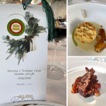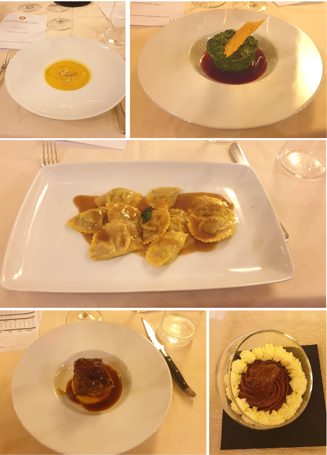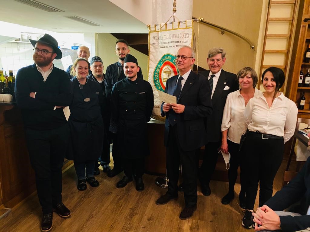 Ottimo risultato della cena degli auguri, grazie anche alla rinnovata, folta partecipazione degli Accademici all’appuntamento ormai tradizionale al ristorante Pecora Nera di Montecatini Terme, che non conosce routine, proponendo sempre piacevoli novità. Organizzatori della serata gli Accademici Gemma Puccini e Andrea Giovannini, che hanno curato l’elegante decorazione dei tavoli, oltre alla definizione del menu, interessante e centrato su ingredienti tradizionali, lavorati con accostamenti originali e stimolanti. Lodevole la scelta dei vini, molto buoni tutti i piatti, presentati con eleganza, serviti con sollecitudine e alla giusta temperatura. Particolarmente apprezzati sia i tortelli di carne con jus di vitello sia la guancia di vitello cotta a bassa temperatura con polenta al mascarpone e castagne al Porto; lodatissima la presentazione del tradizionale Mont Blanc. All’elogio per la cucina va affiancato quello per il servizio, che ha mostrato ottima professionalità, sicché entrambe le brigate hanno avuto complimenti e applausi, che hanno coinvolto anche la titolare Luciana Cenni. Con brevi parole il Delegato Alessandro Giovannini ha infine espresso il compiacimento per la bella serata, augurando ai numerosi Accademici ed ai loro cari delle serene festività.