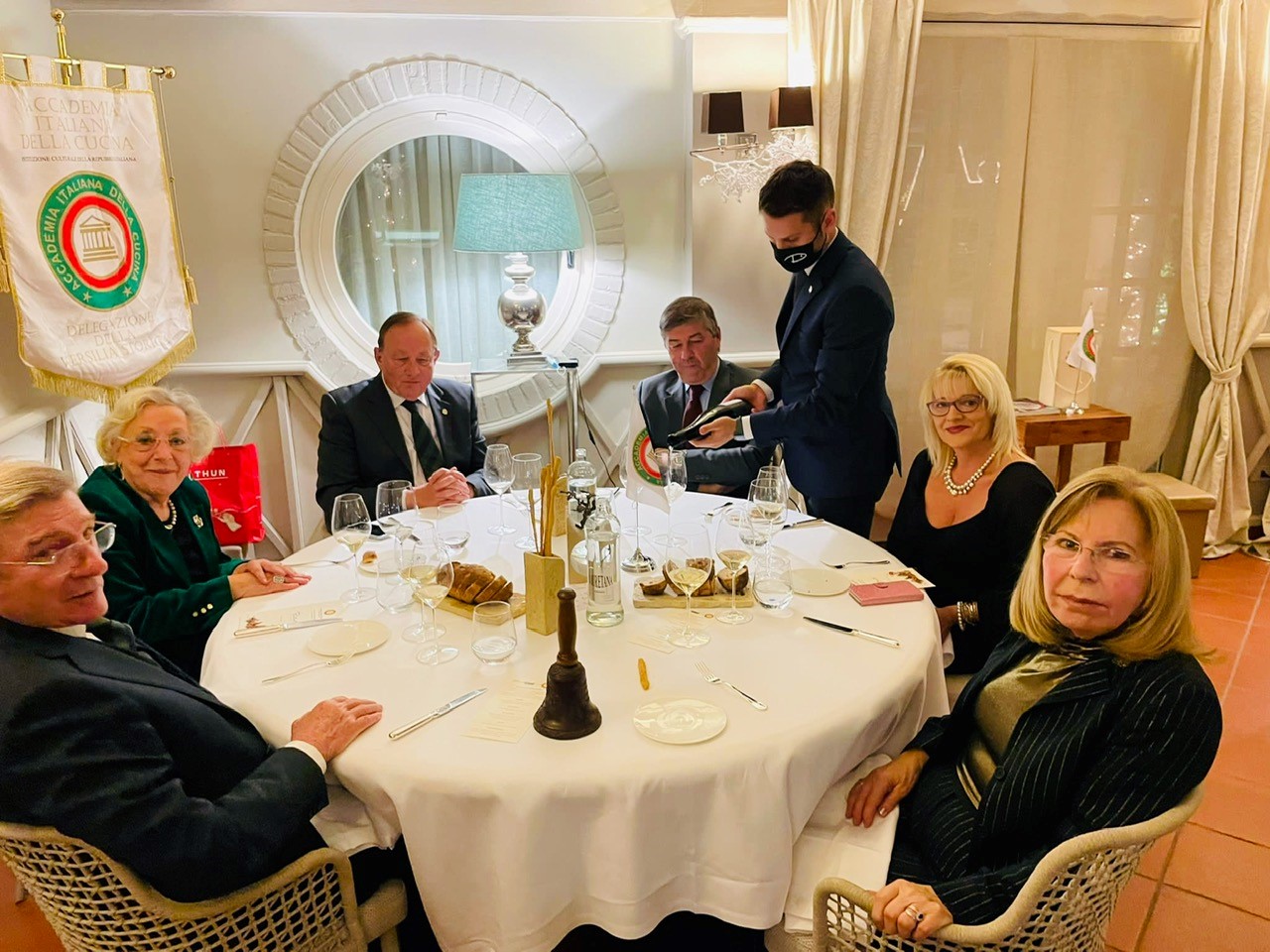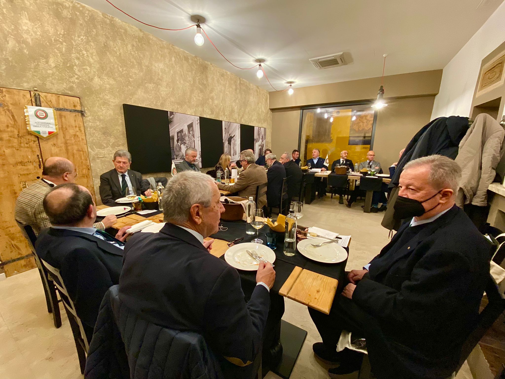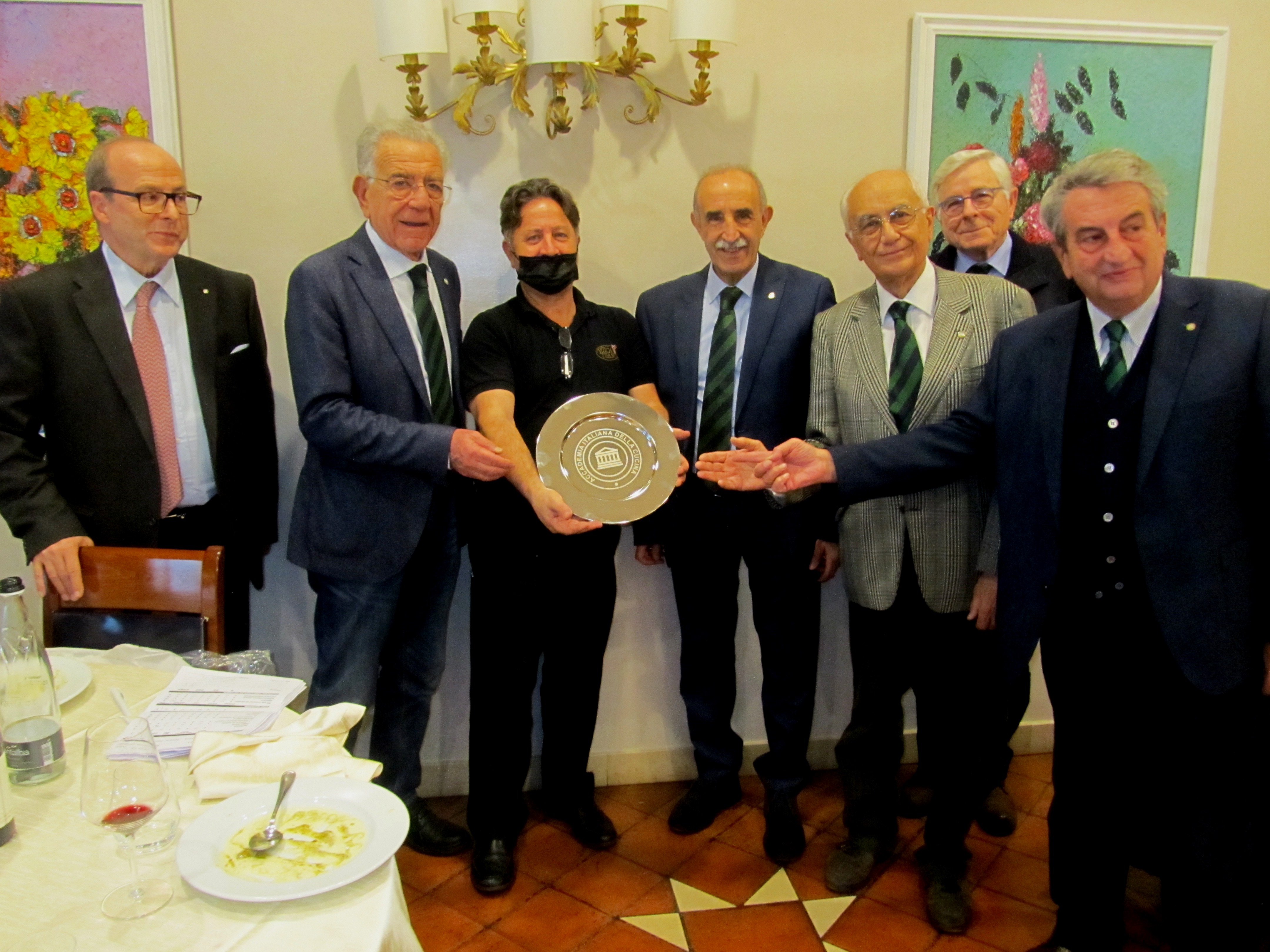 Le Delegazione di Messina si è incontrata, per lo scambio degli auguri, presso l’ultratrentennale ristorante Antica Filanda di Capri Leone a un centinaio di chilometri da Messina. Anche per quest’anno il regalo per gli Accademici sarà l’offerta del pranzo di Natale a più di cinquanta persone meno fortunate. Vastissima è stata la partecipazione di Accademici (Foto 1) ospitati in tutta sicurezza nella vasta e accogliente sala riservata alla Delegazione. La riunione conviviale è stata onorata dall’intervento del Consigliere di Presidenza Ugo Serra (Foto 2) accompagnato dalla sua gentile consorte e ha riscosso un gradimento unanime che ha toccato, specie per gli innovativi antipasti - quali il cannolo di tartare, il flan di porcini e l’uovo panato al tartufo nero dei Nebrodi - valutazioni unanimi di assoluta eccellenza. Il tartufo nero (foto 4) ha profumato ed esaltato le accurate preparazioni cucinarie, tutte unanimemente apprezzate e costruttivamente discusse da molti degli Accademici. L’Antica Filanda riesce a mantenere costante nei decenni la sua altissima qualità, sancita dalla consegna del piatto d’argento a Nunzio Campisi da parte della Consulta (Giovanni Rossi, Trimarchi, Ragusa, Faranda, Borda Bossana) e di Ugo Serra (foto 3).