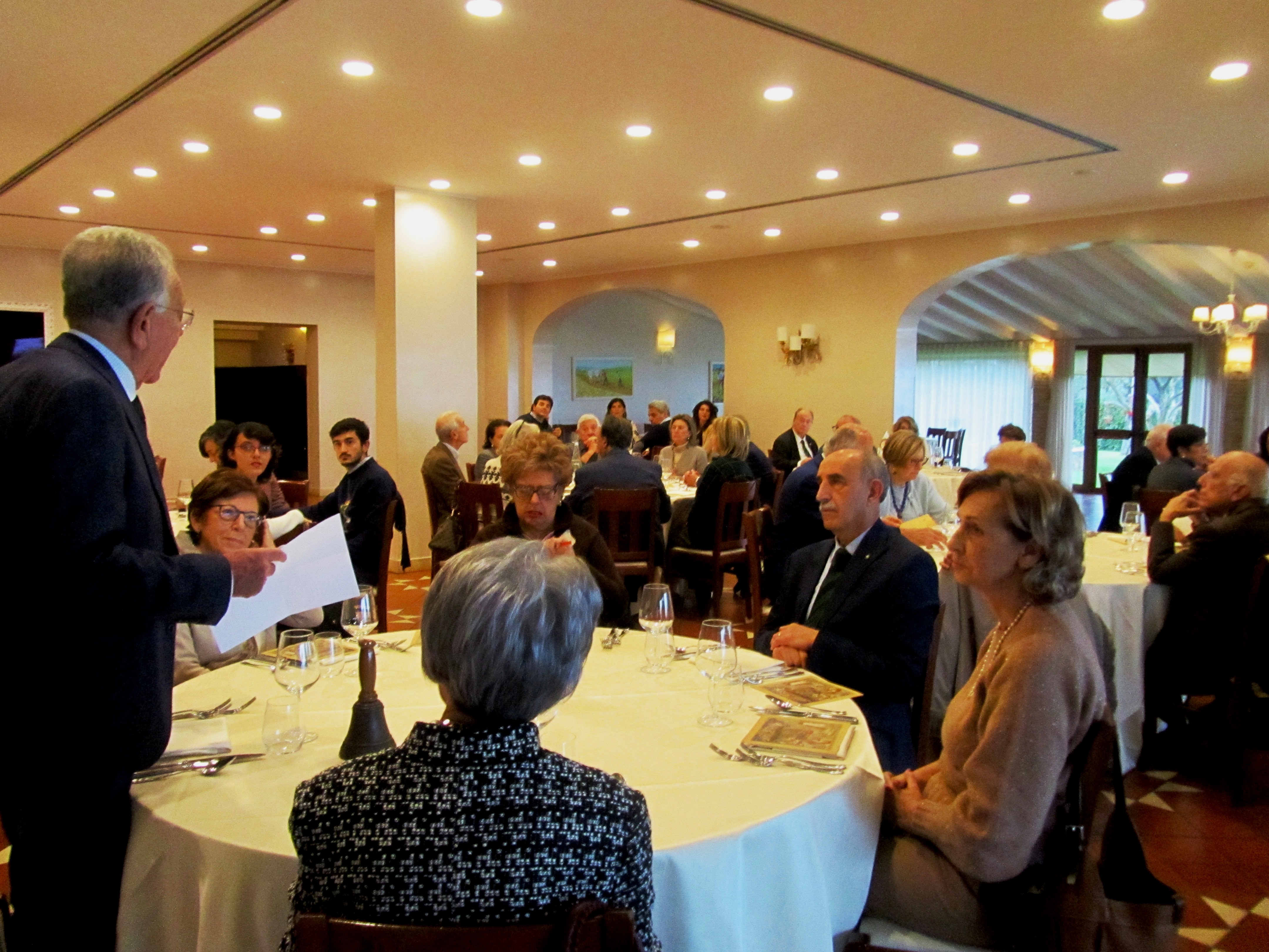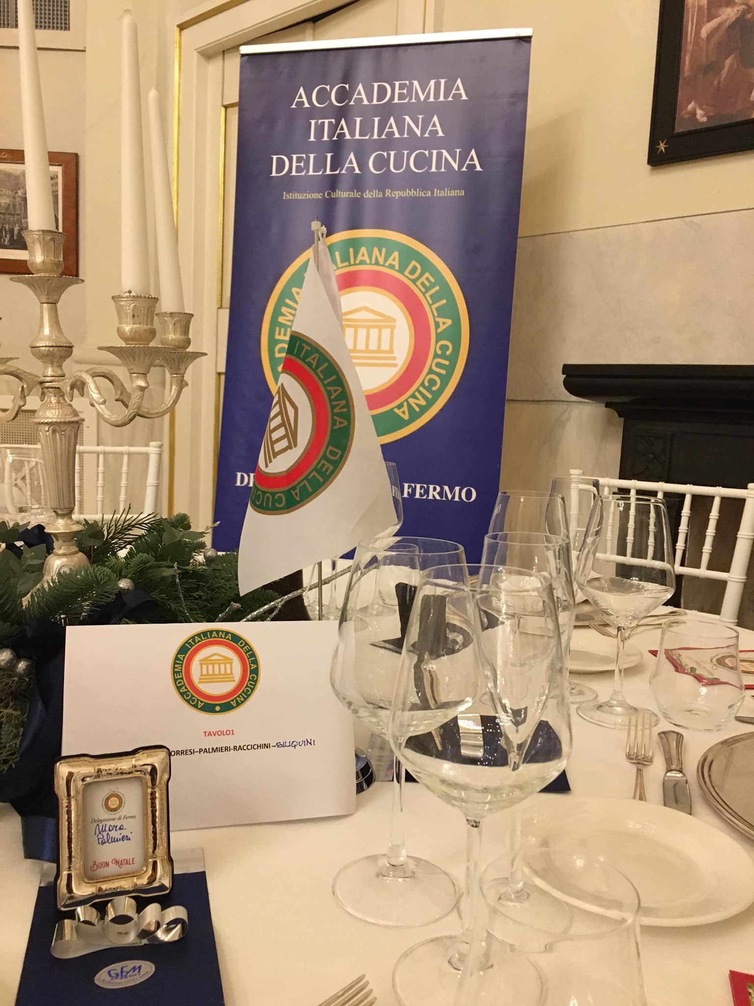 L'occasione dello scambio degli auguri di Natale rappresenta uno dei momenti più sentiti per la Delegazione fermana. Per celebrare l'evento è stata scelta una location di grande fascino e prestigio, VIlla Bonaparte, che Gerolamo Bonaparte fece edificare per il proprio soggiorno a Porto San Giorgio. Al calar della sera Accademici e amici si sono dati appuntamento presso il salone delle feste finemente adorno degli addobbi natalizi per un aperitivo e un primo brindisi beneaugurante in attesa di comporsi tutti a tavola. Menu di pesce coordinato e studiato dal Simposiarca Cristofaro La Corte e ottimamente eseguito dallo staff di Gianni Lamponi titolare della Top Catering e ristorante Minonda. Gradimento dei convenuti per le crudità servite cui sono seguite triglie marinate, carpaccio di polipo e mazzancolle al vapore. Dopo i maccheroncini di Campofilone al ragù bianco di pesce e i ravioloni al sugo di canocchie, grandissimo apprezzamento dei commensali per l'ottima spigola al sale. Amandovulo, dolce della tradizione sangiorgese, per finire, e brindisi con l'ottimo Mont'illì, offerto dal Simposiarca insieme a dolcetti siciliani a tradire le sue origini. La buona tavola, la bellezza dell'ambiente e la finezza dell'apparecchiatura e degli addobbi sono stati solo degni complementi del caldo clima di convivialità e di amicizia che ha pervaso la serata rendendola speciale e, come nelle aspettative, perfettamente interprete dello spirito del Natale.