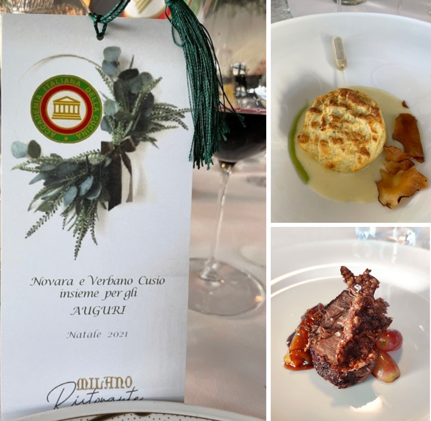 Le Delegazioni di Novara e di Verbano-Cusio si sono riunite al ristorante Milano di Pallanza per la riunione conviviale di Natale. Una bella giornata di sole ha accolto, nella elegante veranda sul Lago Maggiore, i numerosi partecipanti. Il Ristorante Milano è gestito dal 1935 dalla medesima famiglia e oggi lo conduce lo chef-patron Agostino Sala (in foto 2 con i Delegati Piero Spaini ed Eros Barantani). Un convivio che ha avuto lo scopo di far incontrare, in un luogo incantato, amici di Delegazioni diverse. Foto 2. Veduta sul Lago Maggiore. Foto 3. Dal menu, curato dal Delegato di Verbano-Cusio Eros Barantani: flan di cardi con fonduta di Bettelmatt dell’Alpe Forno; Fassone al mosto d’uva americana con cialda alla fava di cacao.