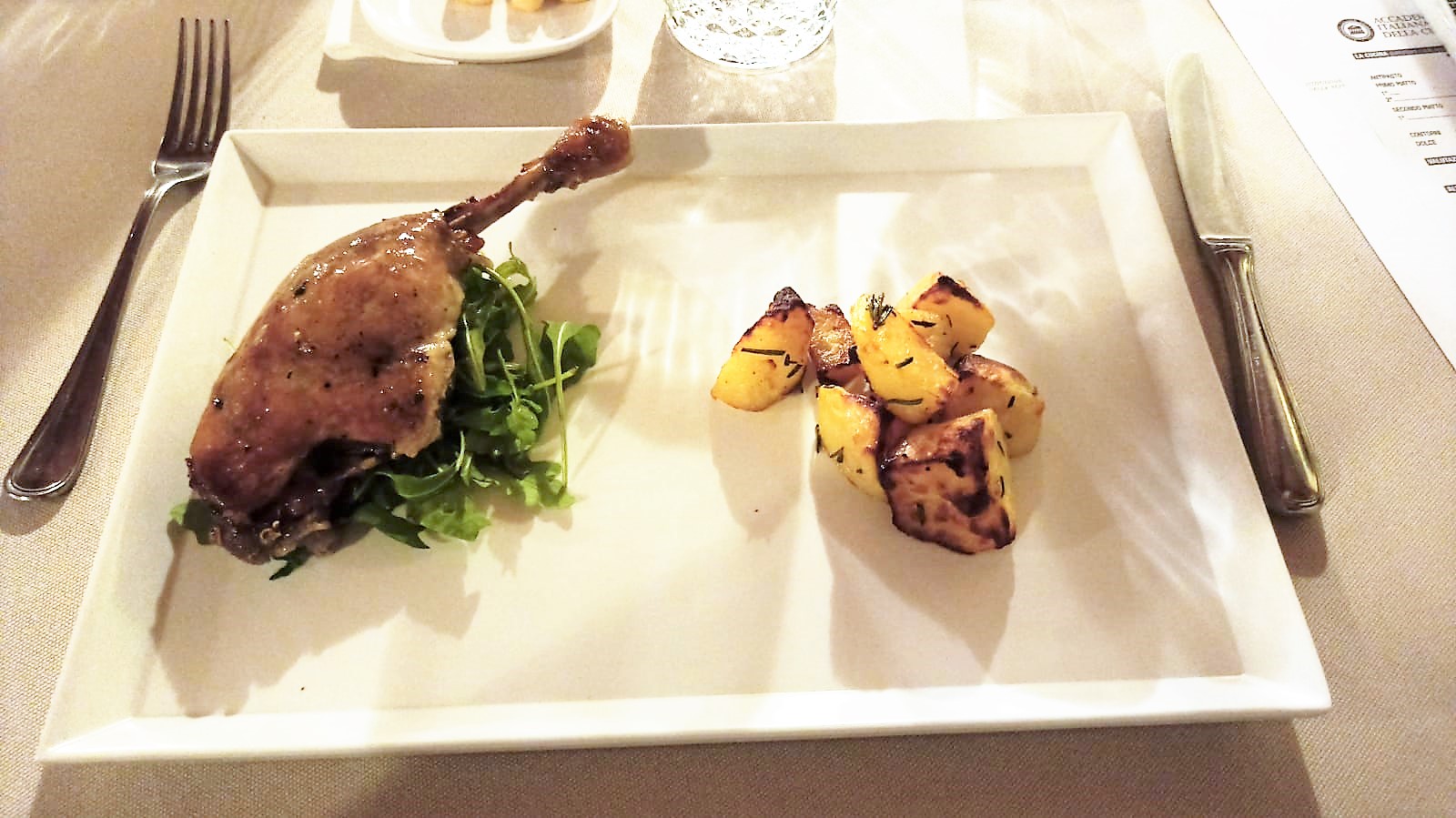 La Delegazione di Carpi-Correggio ha consegnato il Diploma di Buona Cucina (2021) al ristorante “L'anatra di cortile” di Carpi gestito da Susanna Guidetti e da Luigi Musmeci, come riconoscimento per il lavoro svolto nel tramandare le tradizioni culinarie della zona senza rinunciare all’innovazione e alla sperimentazione. La sobria cerimonia di premiazione ha avuto luogo nel corso del tradizionale convivio di fine anno che la Delegazione di Carpi-Correggio ha naturalmente voluto tenere presso il ristorante premiato (foto 1). Nel consegnare la targa del premio ai ristoratori, il Delegato Pier Paolo Veroni (foto 2), ha sottolineato la qualità dei piatti offerti e la passione profusa in cucina dai titolari e da tutto lo staff del ristorante che si è conquistato negli anni uno spazio di rilievo nel mondo della ristorazione locale. La riunione conviviale degli auguri si è conclusa con la consegna ai presenti di alcuni doni, tra cui i preziosi volumi donati dal Direttore del Centro Studi territoriale Elisabetta Barbolini e dal Consultore Fabrizio Stermieri. Foto 3. Maccheroni al pettine con ragù di anatra in bianco. Foto 4. Coscia di anatra in confit con patate arrosto.