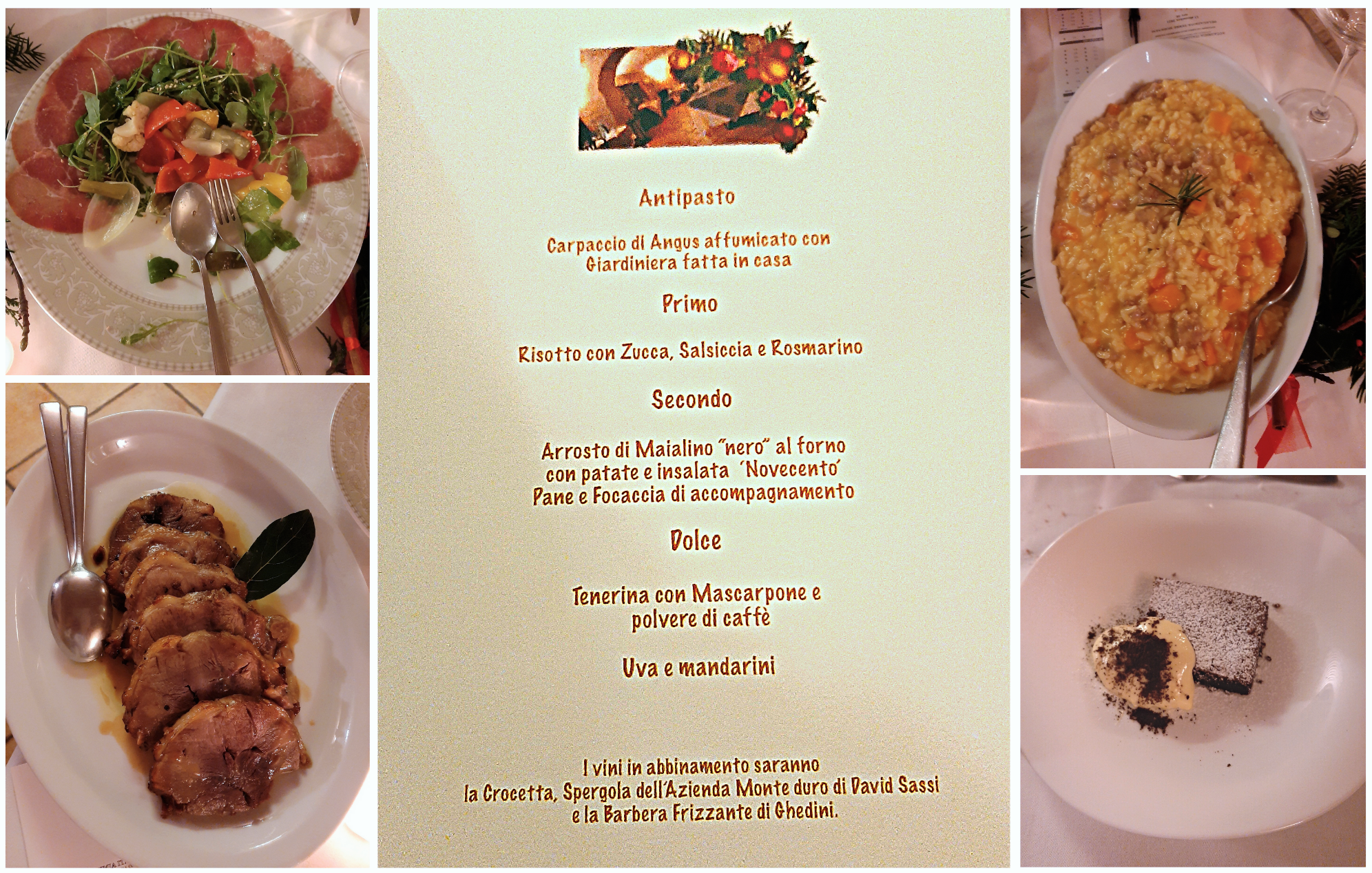 13 dicembre, Santa Lucia, Osteria Novecento: luogo scelto dalla Delegazione di Terre Modenesi per il convivio augurale, proprio nel centro di Marano sul Panaro. Luci e fiammelle per trascorrere la serata felici di stare insieme con ricca semplicità, in un luogo che passa dall’essere l’importante Mulino Montecuccoli risalente al 1600, a Centrale Idroelettrica, dall’inizio del ‘900, per produrre magicamente luce per la sua particolare posizione di confine tra pianura e prima montagna. Ora è un bell’edificio dall’elegante porticato di recente ristrutturazione che ospita negozi e residenze. Qui si trovano anche il Museo di ecologia e storia naturale di Marano e il Centro di Documentazione "Energie di un Territorio”. Laura Farina, Consultrice della Delegazione, ha ripercorso le origini storiche del comune di Marano sul Panaro, scandendo il menu concordato dal Simposiarca Fabrizio Corradini con l’oste, che propone piatti tradizionali con inserimenti innovativi e suggerimenti di cucina italiana provenienti da fuori regione. Foto 1. Apertura serata. Foto 2. L’intervento di Laura Farina. Foto 3. La Consegna del guidoncino al ristoratore. Foto 4. Piatti e menu.