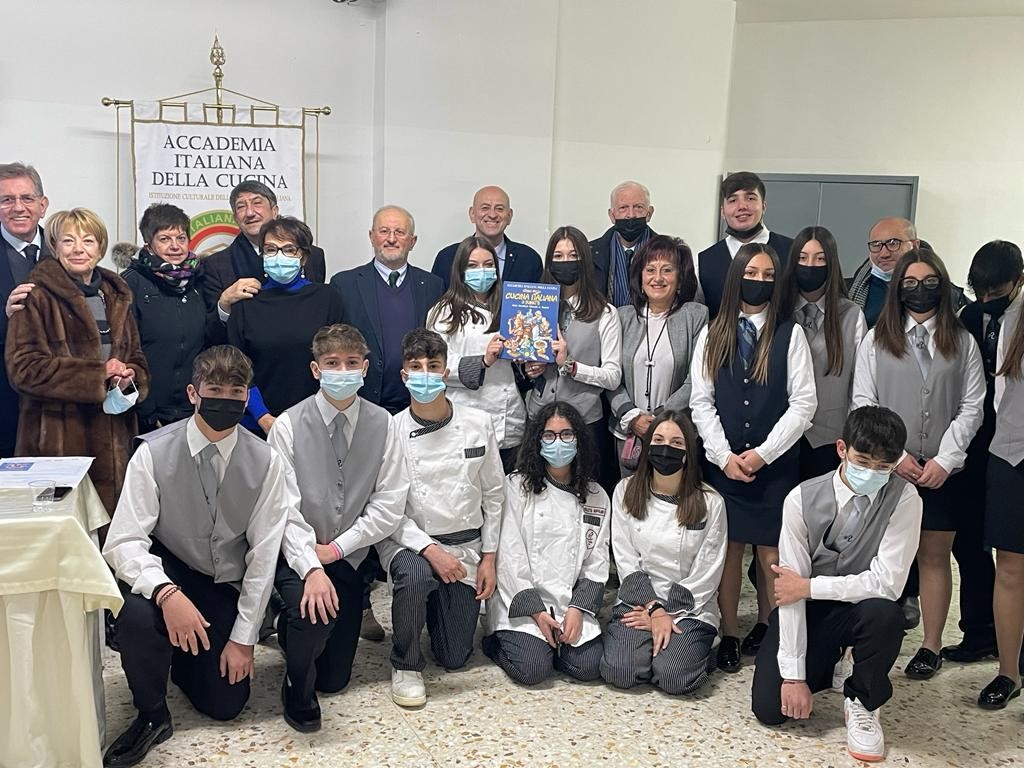 Sono otto i premi nazionali che l’Accademia Italiana della Cucina ha assegnato negli anni 2020 e 2021 a ristoratori, produttori ed esercizi commerciali della provincia di Cosenza su proposta della Delegazione locale. I premi sono stati consegnati nel corso dell’evento organizzato dalla Delegazione presso il Palazzo della Provincia di Cosenza (foto 1), promosso in occasione della VI Settimana della Cucina Italiana nel Mondo, sul tema "La cucina di territorio tra tipicità, tradizione e sostenibilità”. Al tavolo dei relatori il Delegato Rosario Branda, il Sindaco di Cosenza Franz Caruso, il Presidente della Provincia Franco Iacucci, Paolo Marchi, ideatore e conduttore di Identità Golose, il Direttore del Centro Studi territoriale dell’Accademia Ottavio Cavalcanti, l’Assessore regionale all’Agricoltura Gianluca Gallo (foto 2). In particolare sono stati consegnati (foto 3) il premio “Dino Villani" all’azienda salumificio San Vincenzo per la “Sopressata di suino nero di Calabria dop” e all’azienda Ruffolo per il “Caciocavallo silano dop”; il Premio "Massimo Alberini" all’azienda Amarelli Fabbrica di Liquirizia e all’Agricola Campoverde; il Premio “Giovanni Nuvoletti” agli chef Gaetano Alia de La Locanda di Alia di Castrovillari ed Emanuele Lecce de La Tavernetta di Camigliatello Silano ed, infine, il Diploma di Buona Cucina agli chef Michele Rizzo del ristorante Agorà di Rende e Palmino Raffo del Sabbia d’Oro di Belvedere Marittimo. Impegnati nel progetto gli studenti e i docenti dell'Istituto Alberghiero “Mancini-Tommasi” di Cosenza guidati dalla dirigente Graziella Cammalleri (Foto 4).