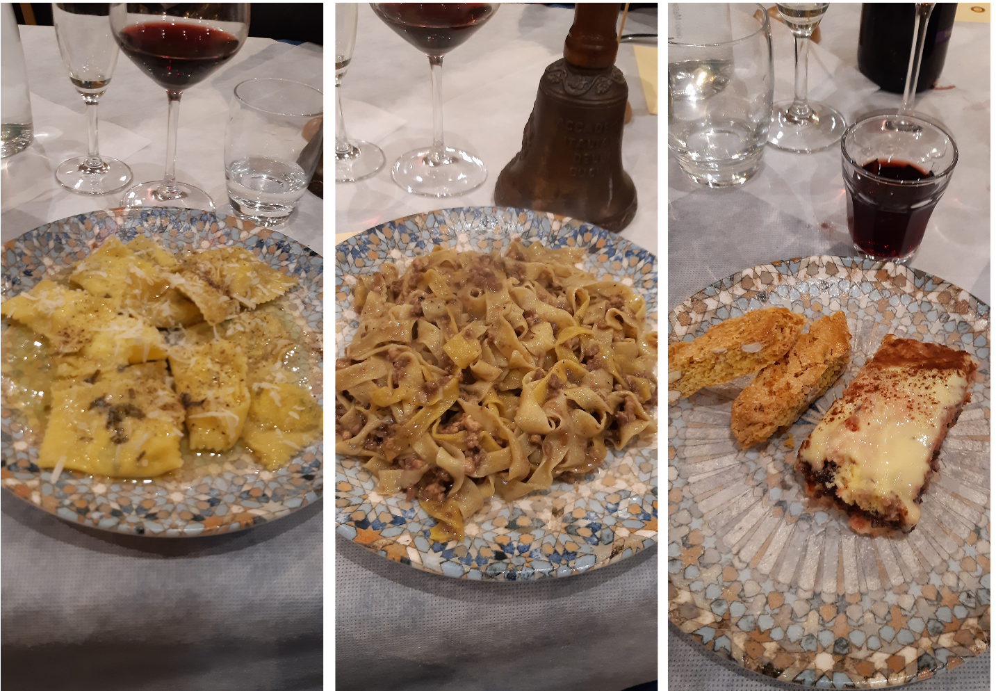 Per l'atteso scambio degli auguri la Delegazione del Mugello si è ritrovata presso l’Antica Osteria di Montecarelli, in località Montecarelli a Barberino di Mugello (FI), dove un tempo si trovava una vecchia stazione di posta. Gli Accademici hanno potuto degustare piatti della tradizione preparati con passione e grande abilità da Paola Giovannardi insieme al figlio Samuele. Il menu è stato accuratamente selezionato dal Simposiarca Renzo Bartoloni che durante il convivio, in qualità di membro del Centro Studi della Toscana Est, ha presentato il tema del nuovo anno. Una serata molto piacevole che gli Accademici in compagnia dei coniugi e di alcuni ospiti hanno potuto trascorrere nelle accoglienti salette con i camini accesi dell’Antica Osteria, immersi nell’atmosfera di una volta. Foto 1. Un momento della serata. Foto 2. Il Simposiarca Bartoloni illustra il menu. Foto 3. La consegna della vetrofania e del volume "Storia della cucina italiana a fumetti" ai ristoratori. Da sinistra la Delegata Monica Sforzini, Paola Giovannardi e il figlio Samuele. Foto 4. Alcuni dei piatti serviti (zuppa di ceci, tortellini fatti in casa in brodo di gallina; baldanzoni con salsa di porri e caprino; brasato con purea di patate).
