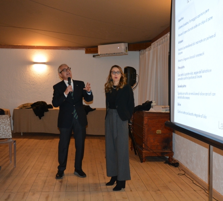 “La cucina dei cibi intelligenti e le ricette della salute” è stato il tema della riunione conviviale svolta dalla Delegazione di Pescara al ristorante “La Corte” di Spoltore. Relatrice Maria Tieri, dietista nutrizionista, ricercatrice nell’ambito del programma di ricerca di scienza della nutrizione “Smart Food” presso l’Istituto Europeo di Oncologia di Milano. Foto 1. La relatrice Maria Tieri con il Delegato Giuseppe Fioritoni. Foto 2. La sala della conferenza. Foto 3. Il Simposiarca Guido Cerolini Forlini illustra il menu insieme alla dottoressa Maria Tieri. Foto 4. La sala della riunione conviviale.
