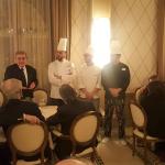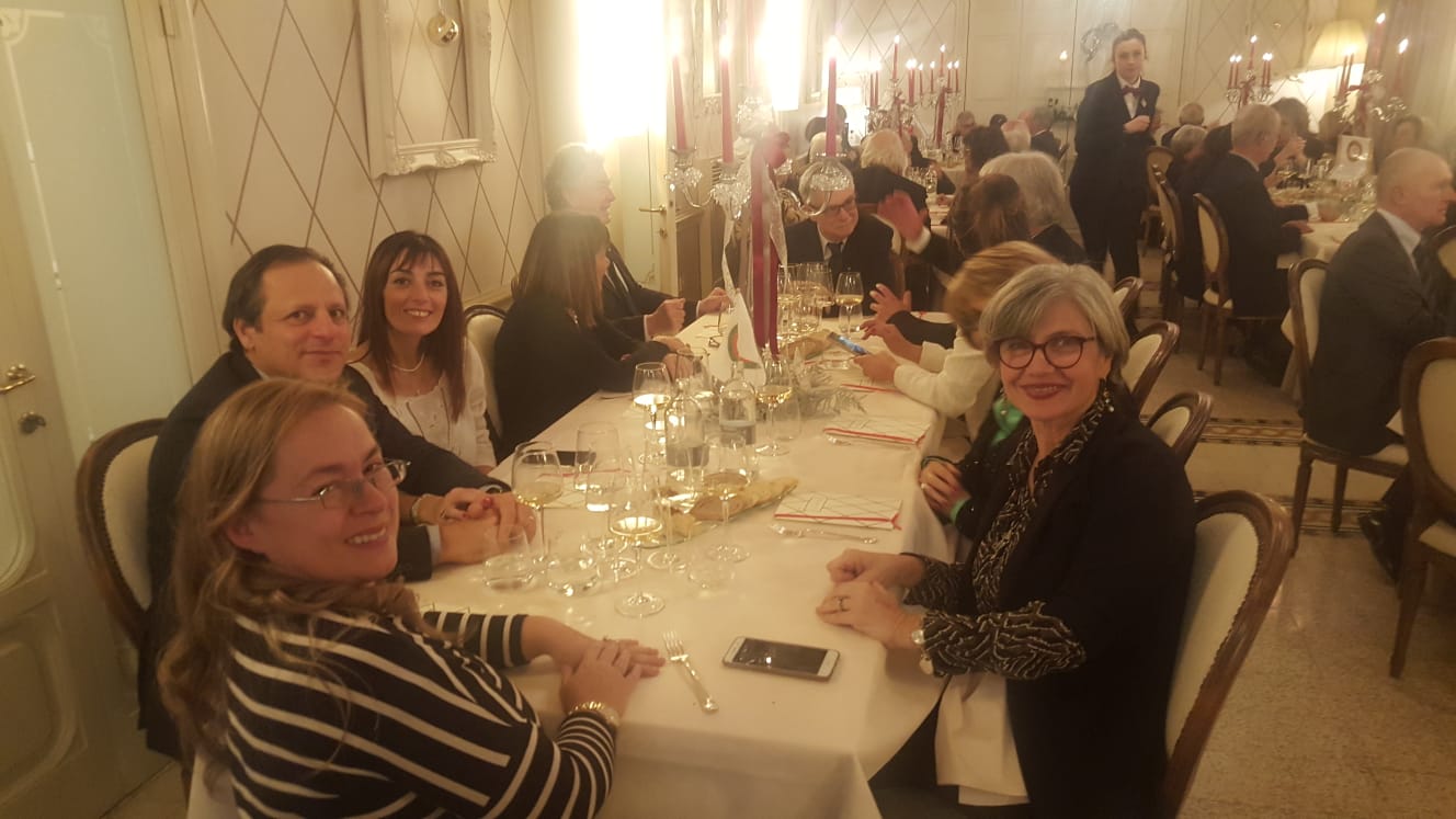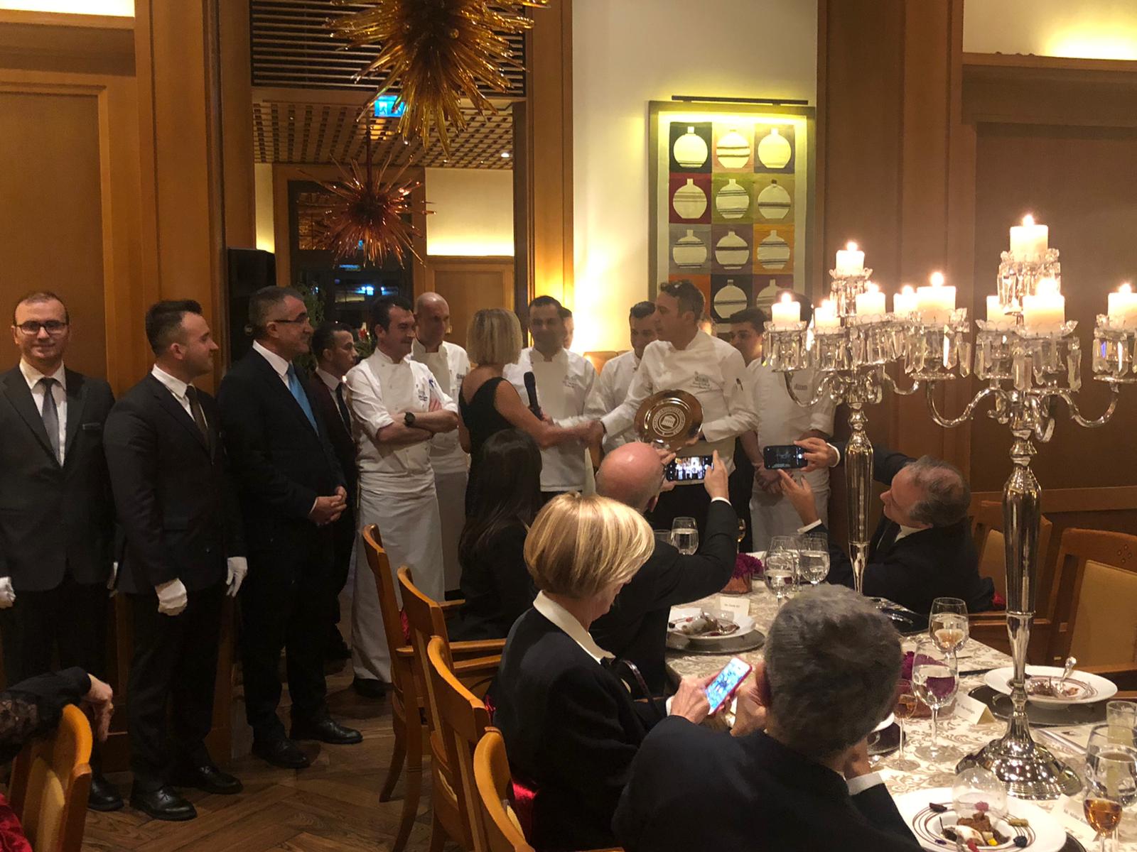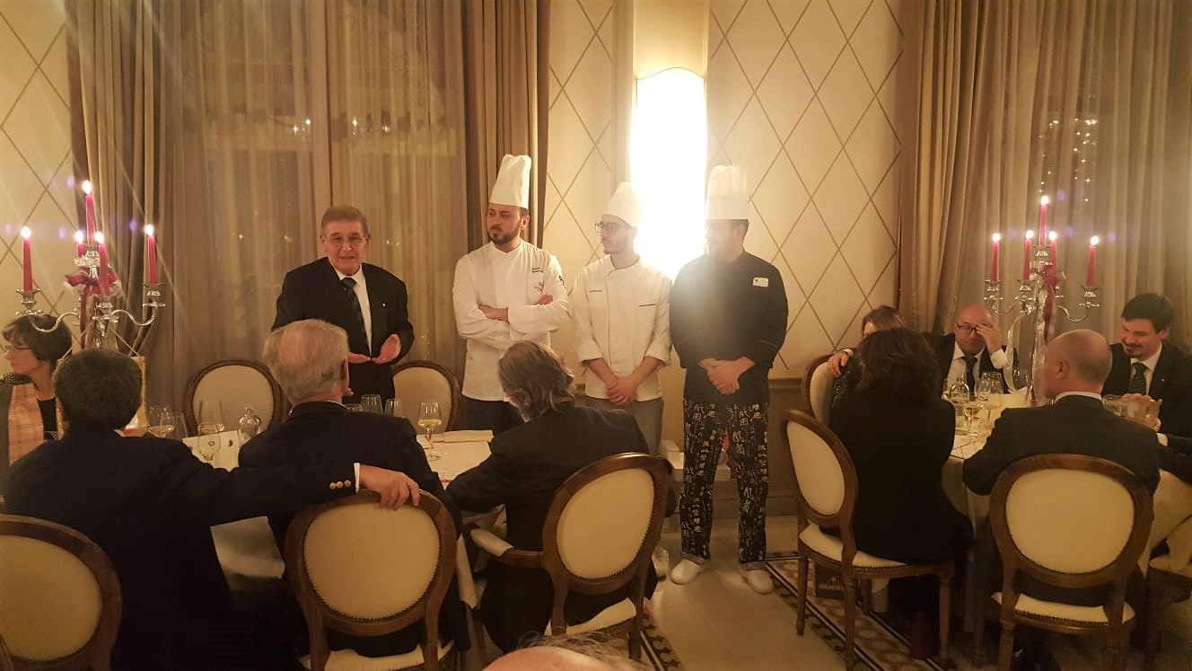 La Delegazione di Istanbul si è riunita per la prima cena dell’anno presso il ristorante "Divan Lokanta" all’interno del Divan Hotel. Il tema della serata è stato lo “slow food”, cioè il buon mangiare servito con ingredienti prettamente locali e freschi di stagione. Lo chef Giancarlo Gottardo, assegnatario del Premio "Giovanni Nuvoletti"(2019) dell'Accademia, ha elaborato un menu con prodotti esclusivamente di stagione. La Delegazione ha avuto il piacere di gustare, tra gli altri piatti, plin piemontesi ripieni d’anatra (foto 3) e per dessert l’ultima creazione dello chef “il valzer di cioccolato” (foto 4). Foto 1. La Delegata Dilek Bil consegna il piatto silver dell'Accademia allo chef Giancarlo Gottardo e alla brigata di cucina e sala. Foto 2. Accademici e ospiti a tavola.