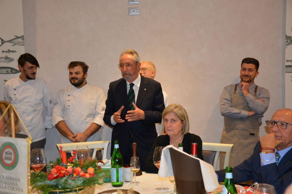 La Delegazione di Pescara si è riunita al ristorante “Margazzill – Idee dal mare” di Città Sant’Angelo per la riunione conviviale degli Auguri di Natale. In apertura, una interessante e coinvolgente relazione sulle tradizioni culinarie natalizie nel mondo svolta dall’Accademico Louis Godart. La Simposiarca Patrizia Accorsi ha scelto un menu ispirato alle usanze abruzzesi che, per il cenone della Vigilia di Natale, prevedono piatti preparati con il pescato delle marinerie locali e con il tradizionale baccalà, accompagnati da ortaggi e verdure di stagione. Foto 1. Il tavolo del Delegato Giuseppe Fioritoni. Foto 2. Un momento della relazione dell'Accademico Godart. Foto 3. La Simposiarca Patrizia Accorsi illustra il menu. Foto 4. Il Delegato presenta la brigata di cucina.
