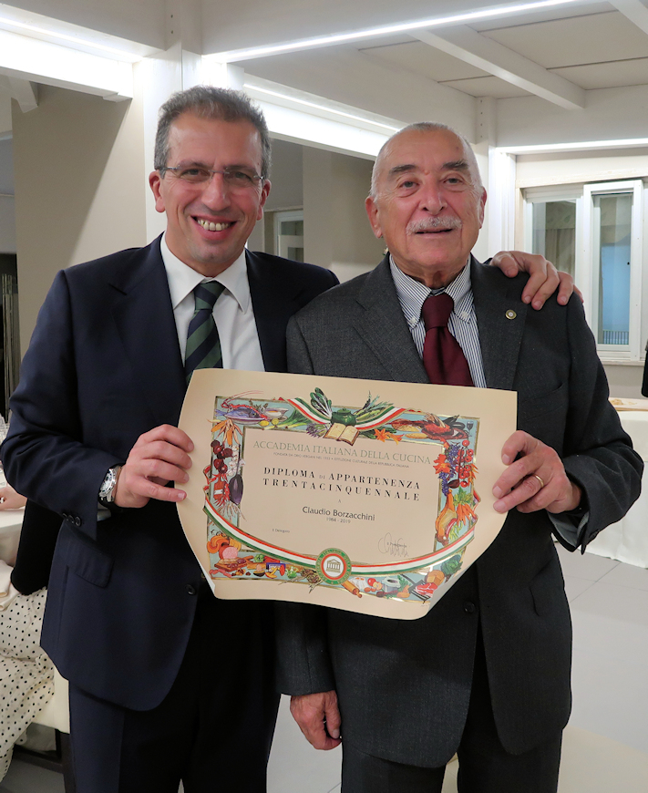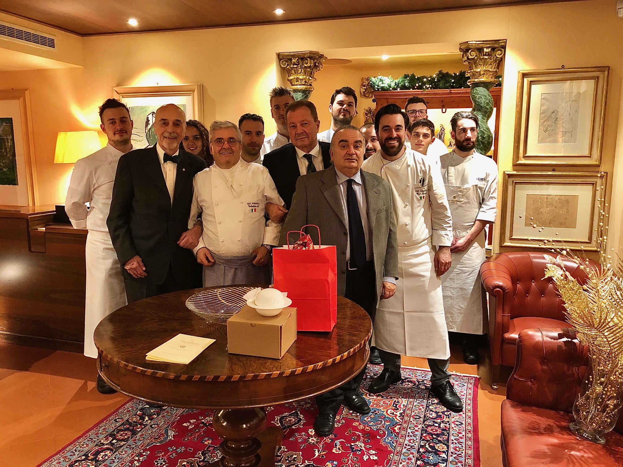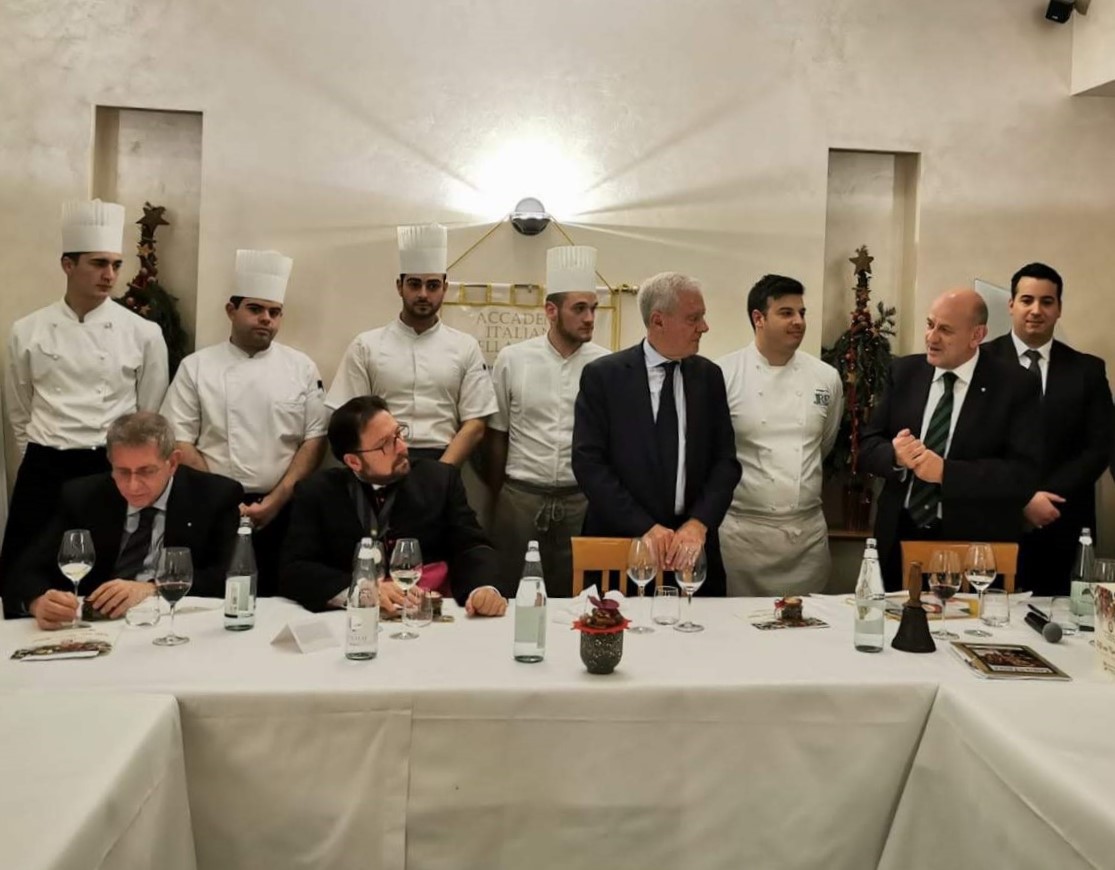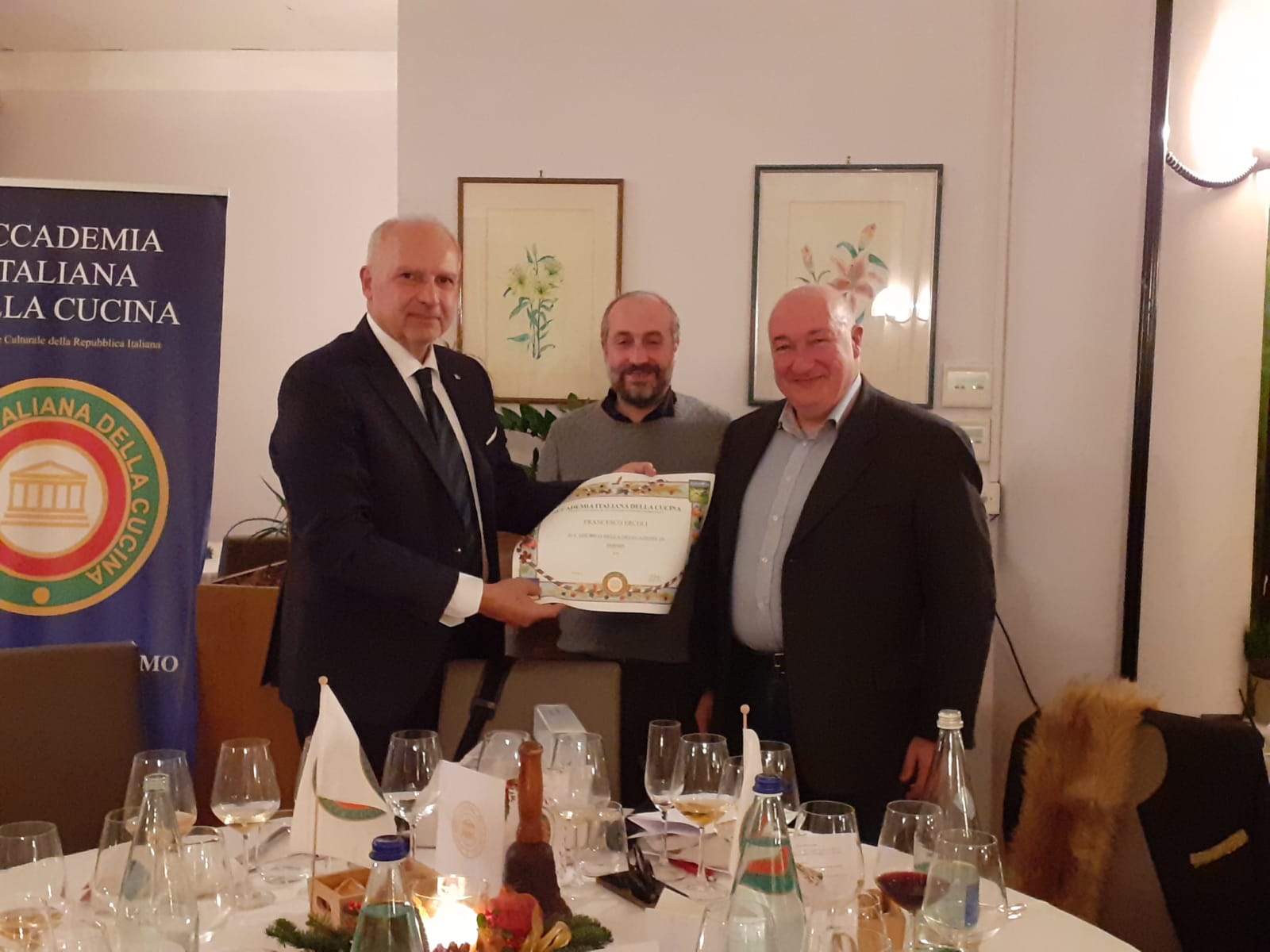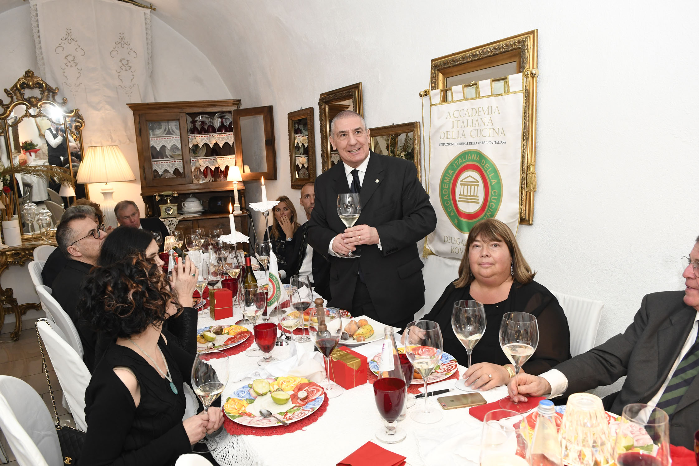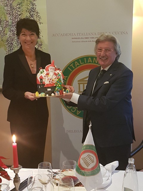 Per la riunione conviviale dedicata agli auguri di Natale, il Delegato e Simposiarca Fabrizio Farinati ha convocato l’intera Delegazione presso la Locanda Castelvecchio a Verona. Tutti i presenti hanno accolto con immenso entusiasmo l’Accademico onorario Morello Pecchioli (in foto 1 a destra con il Delegato), giornalista gastronomo, appassionato di cucina, vino e storia, membro del prestigioso Centro Studi "Franco Marenghi" dell'Accademia. Presenti alla celebrazione, il Consultore nazionale Germano Berteotti e il dott. Roberto Fostini. Durante la serata sono state servite le specialità della cucina veronese tra cui il carrello dei bolliti con salsa pearà. Il pandoro di Verona, donato dall’Accademico Michele Bauli, ha accompagnato splendidamente, il brindisi finale.
