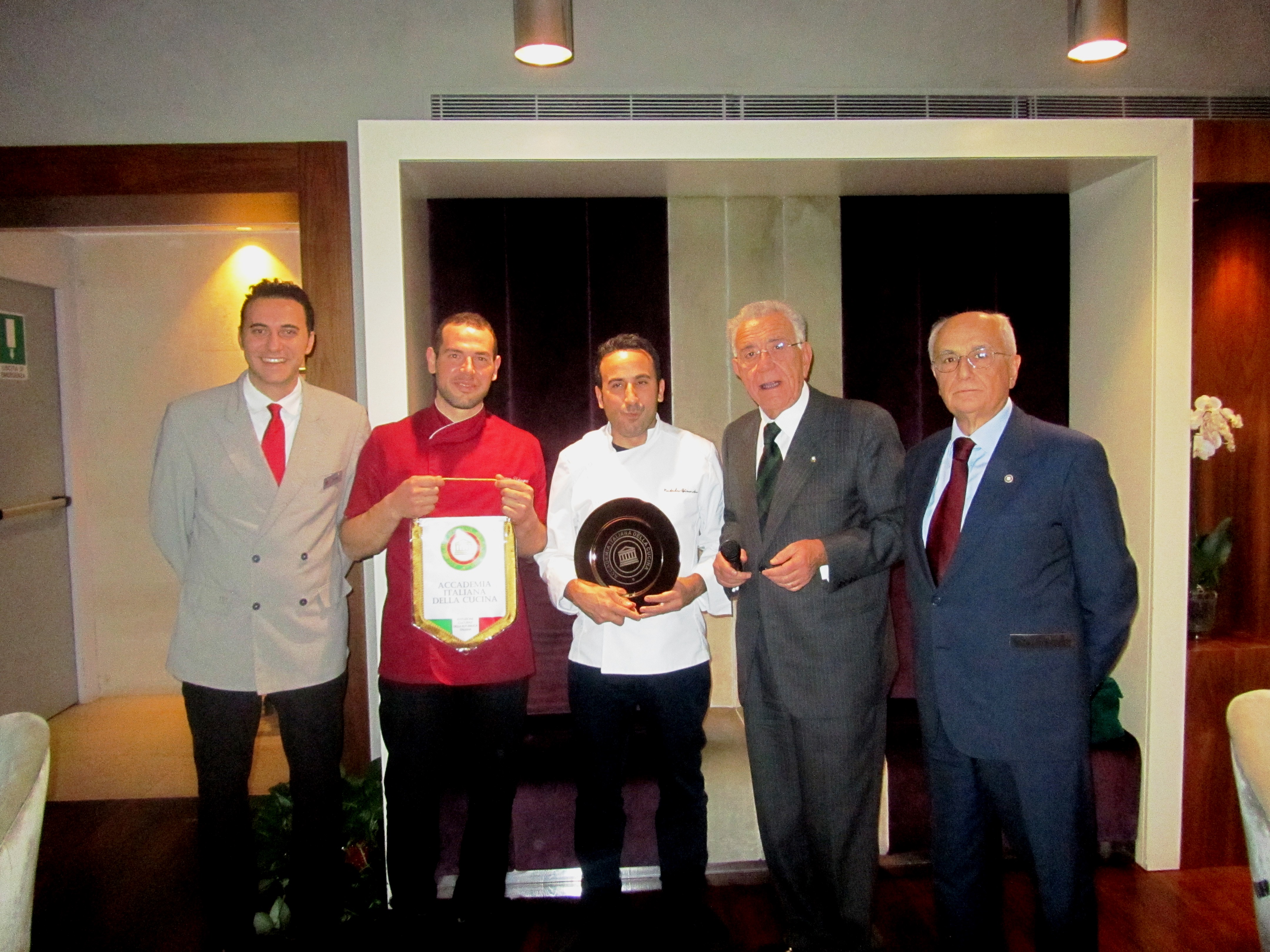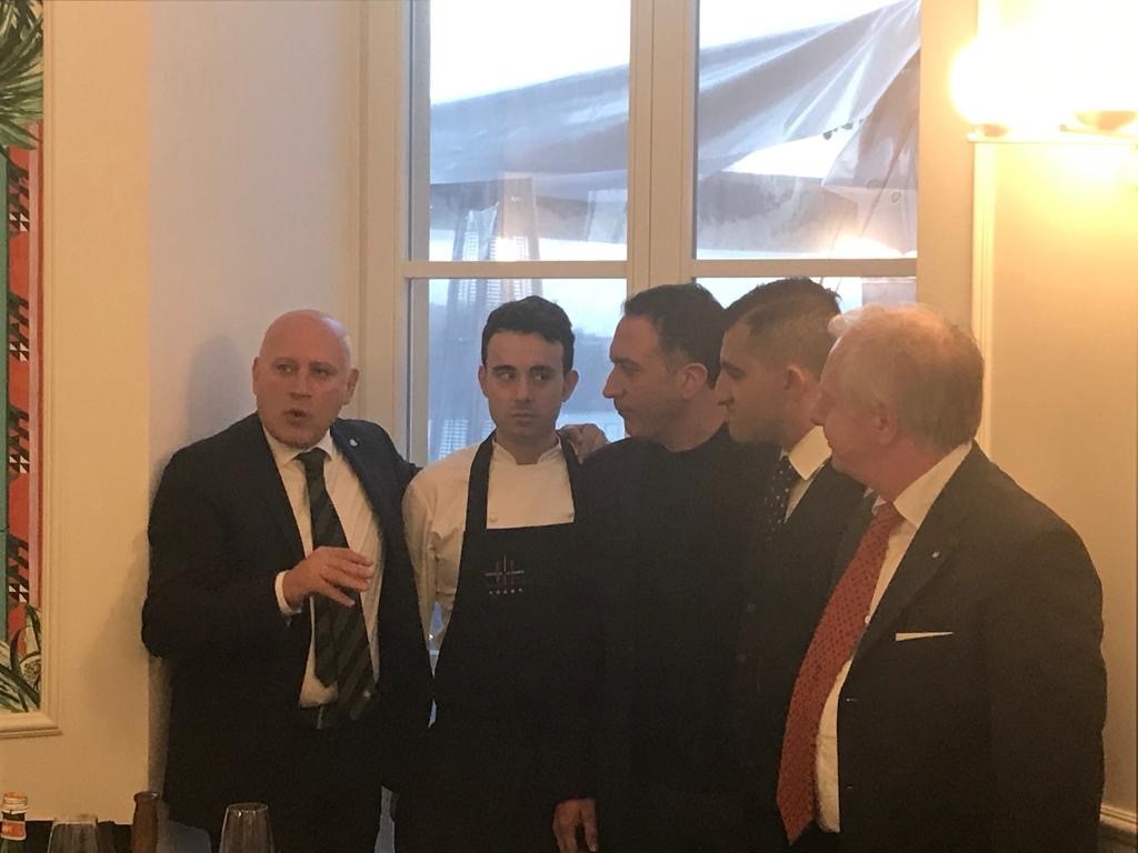 La Delegazione della Penisola Sorrentina ha organizzato il pranzo conviviale degli auguri di Natale presso il ristorante "Lorelei" dell'omonimo hotel a Sorrento. In foto 1. Il Delegato Giuseppe De Simone con il Simposiarca (Segretario della Delegazione) Raffaele Gargiulo presenta agli Accademici l'avv. Angelo Apuzzo, titolare dell'Hotel Lorelei, il giovane chef Ciro Sicignano e il maître Sascha Fausto. Foto 2. Spaghetto di Gragnano al ragù di cernia bianca, frutti di mare, datterino e salicornia. Foto 3. Baccalà in variazione, insalatina di rinforzo e gel di papaccelle. Foto 4. Mousse al cioccolato fondente, crema alla nocciola e gelato al ginseng.