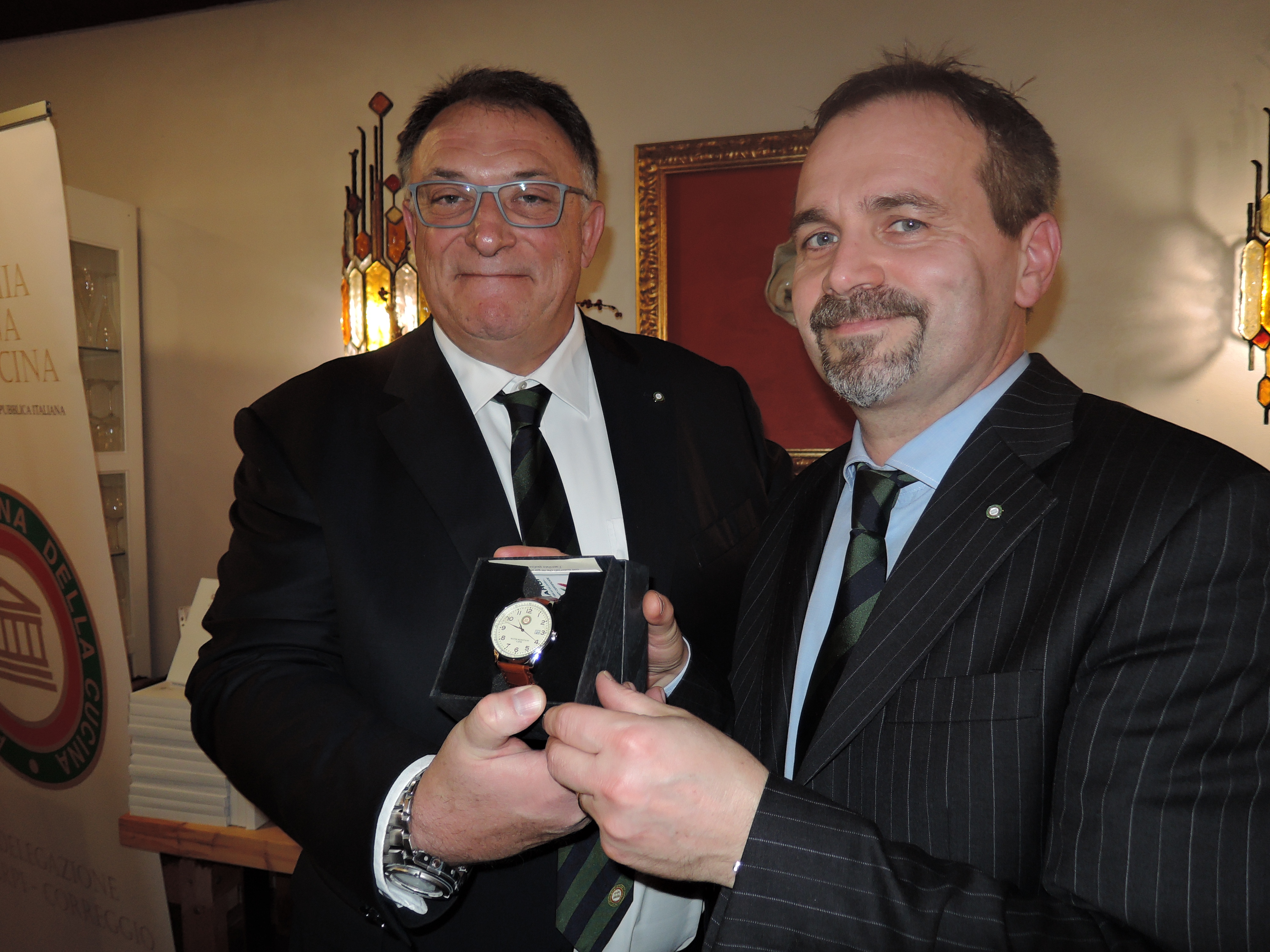 La Delegazione di Carpi-Correggio si è ritrovata per la riunione conviviale degli auguri all'Osteria Emilia a Campogalliano (MO). Presenti alla cena, il Delegato di Bologna-San Luca Atos Cavazza, la Delegata di Terre Modenesi Rosalba Caffo Dallari, la Direttrice del Centro Studi Territoriale Emilia Elisabetta Barbolini Ferrari (Accademica di Carpi-Correggio) e numerosi Accademici e ospiti ai quali sono stati consegnati graditi doni natalizi. Foto 1. Il Delegato Pier Paolo Veroni consegna al Consultore Giuseppe Calabria il piatto silver dell'Accademia. Foto 2. Il Segretario Marco Catellani riceve l'orologio dell'Accademia. Foto 3. Consegna del piatto a Benedetta Montanini dell'Osteria Emilia. Foto 4. Tortellini in brodo.