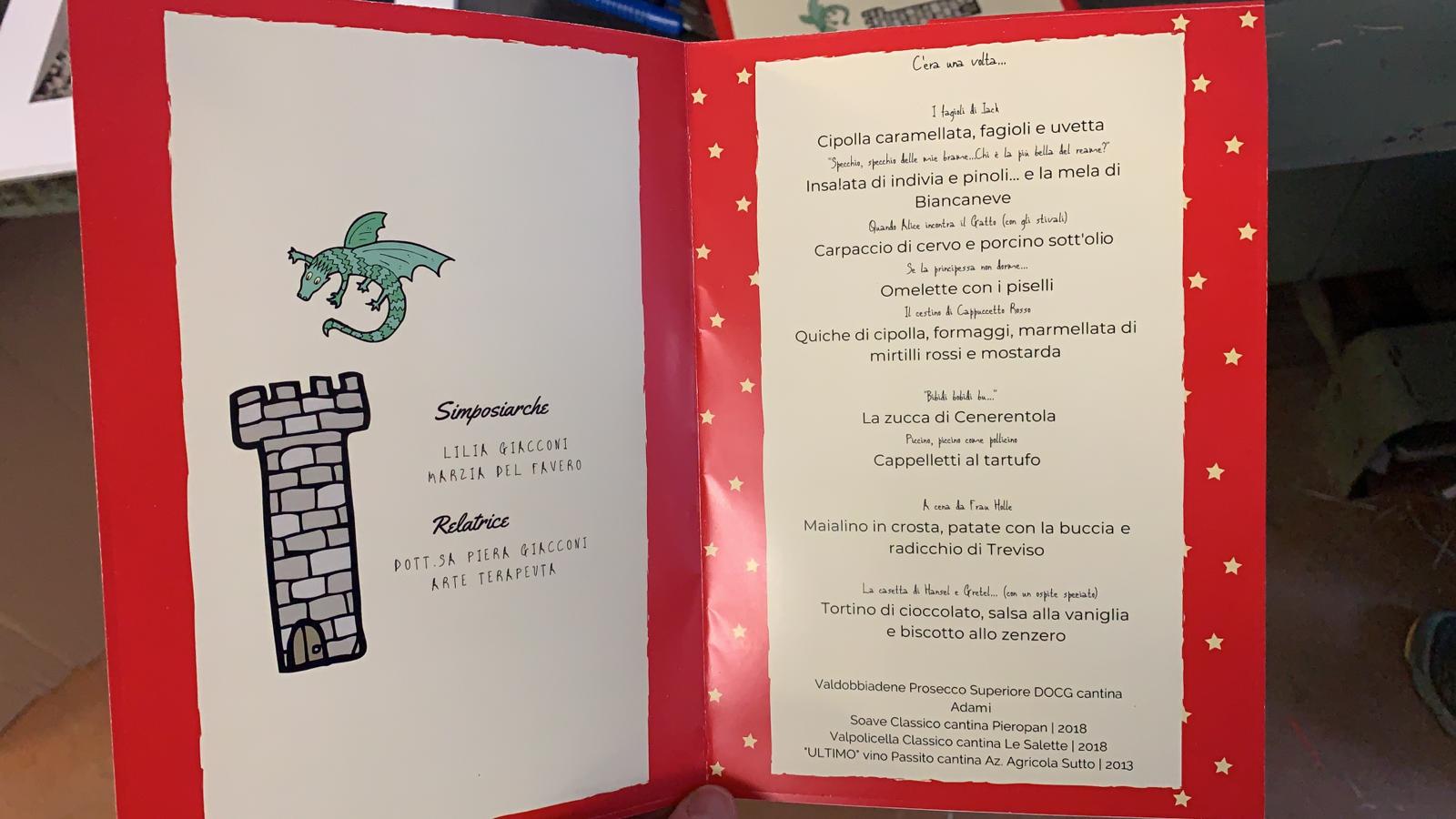 La Delegazione di Cortina d’Ampezzo si è riunita per gli auguri di Natale presso il Dolomiti Lodge Alverà: tema della serata “C’era una volta… la tavola delle fiabe – la metafora del cibo nelle fiabe”, presentato in una interessante relazione dalla professoressa Piera Giacconi. L’atmosfera natalizia è la più adatta per tornare bambini anche solo per un momento rivivendo, grazie alle fiabe della nostra infanzia reinterpretate attraverso i piatti in tavola, l’emozione e la magia di questa festa: un’occasione particolare per scambiarsi gli auguri in serenità ed allegria. Foto 1. La Delegata Monica De Mattia e il Sindaco di Cortina Giampiero Ghedina tra la Simposiarca Marzia Del Favero e il Vice Delegato di Trieste Enrico Pobega. Foto 2. La Simposiarca Lilia Giacconi, il Sindaco Giampiero Ghedina e la Delegata Monica De Mattia. Foto 3. Il menu a tema. Foto 4. La casetta in marzapane di Hansel e Gretel.