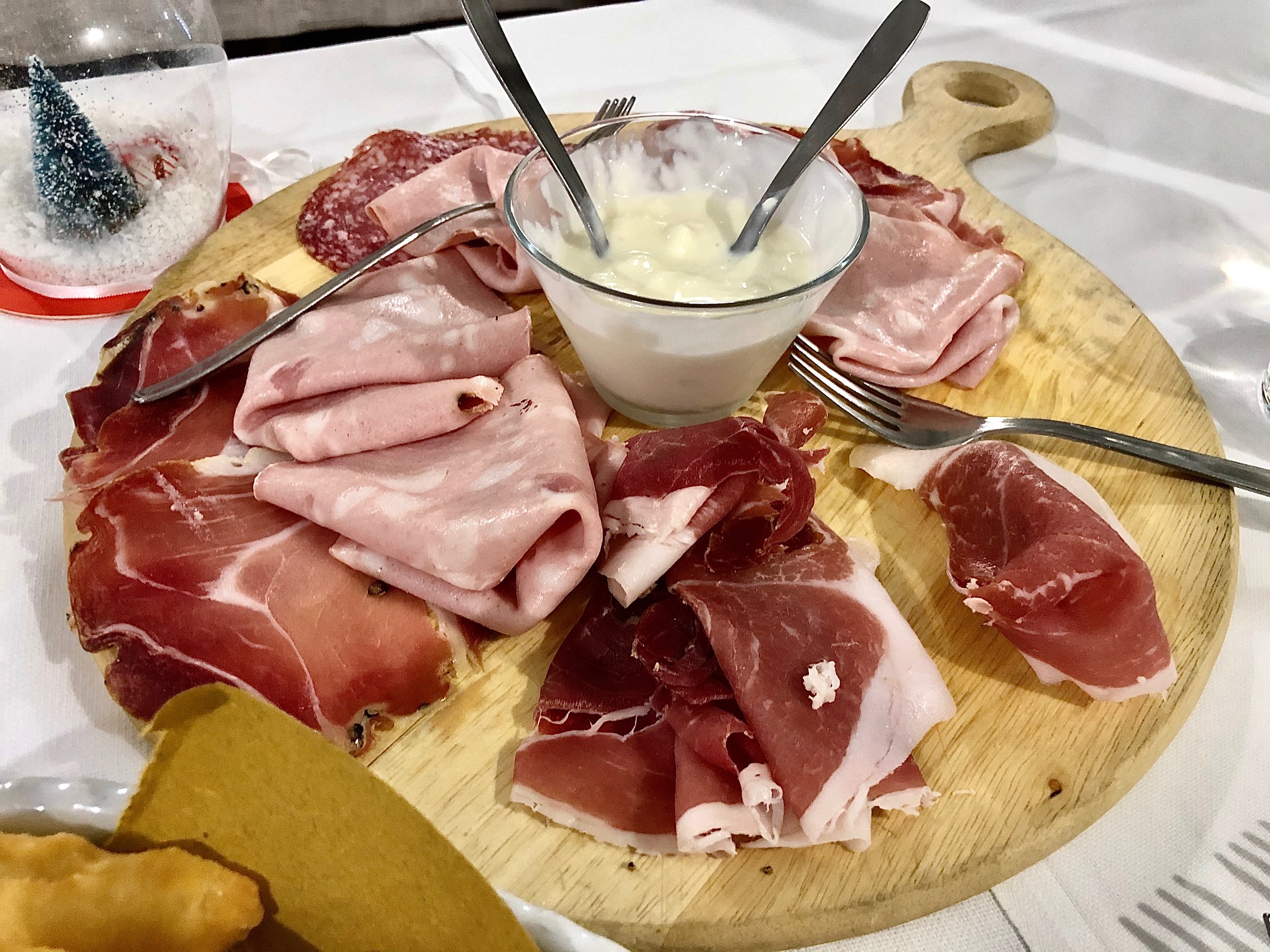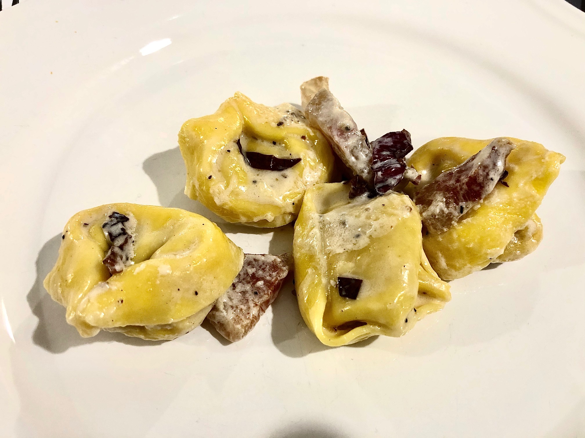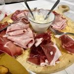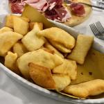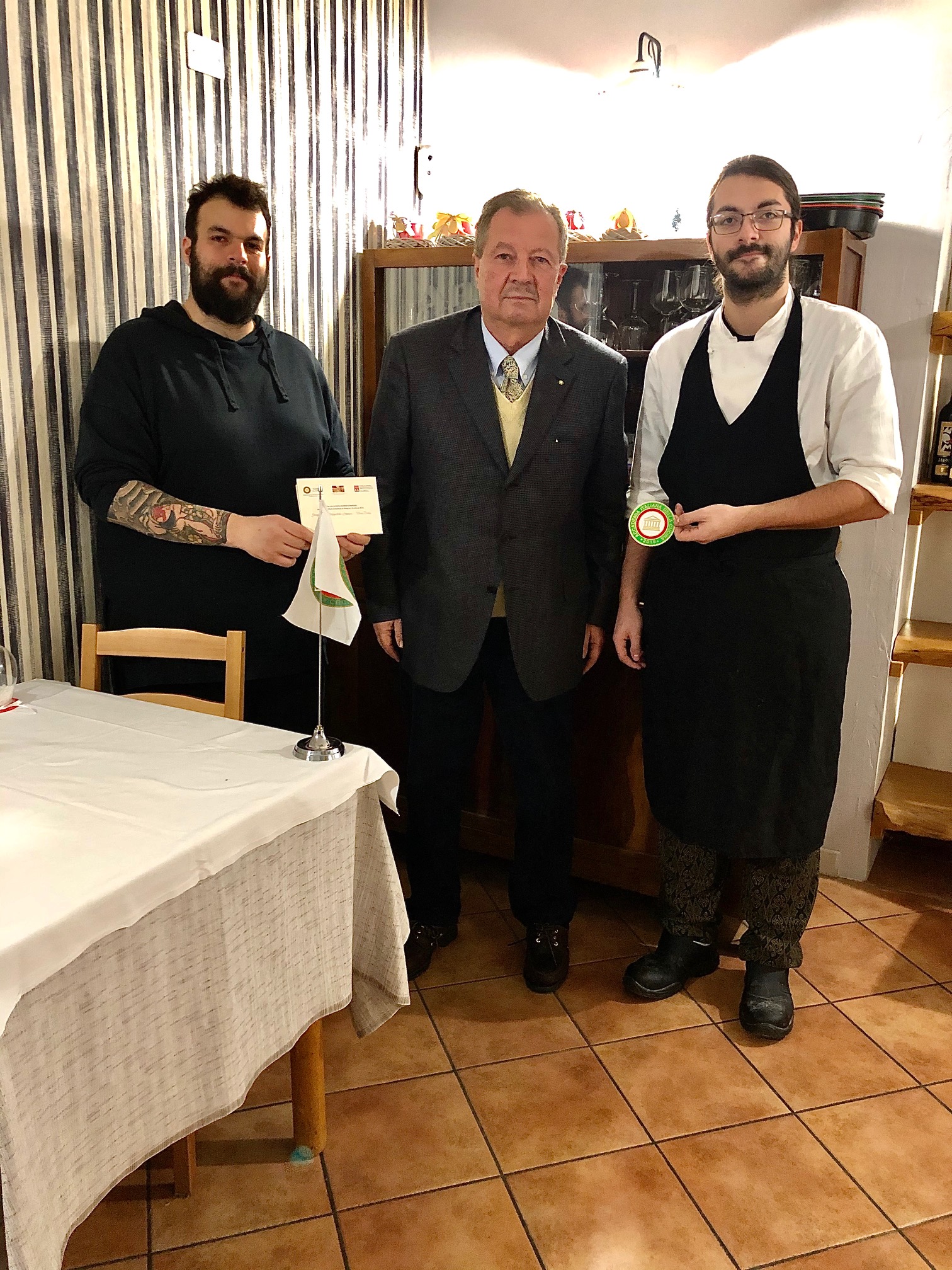 La Delegazione di Imola ha visitato l'Osteria da Pompeo (Località Codrignano), punto di riferimento per molte decine d'anni per la gita fuoriporta degli Imolesi che, dopo un periodo di difficoltà, è ritornata ora in auge grazie all'impegno di due giovani fratelli, Luca in sala ed Enrico Assiria in cucina, con la passione della cucina e della cura dei prodotti tipicamente del territorio. Il loro lavoro è stato apprezzato dagli Accademici di Imola che li hanno incorraggiati a proseguire e a crescere. Foto 1. Luca Assiria, il Delegato Antonio Gaddoni, Enrico Assiria. Foto 2. Gnocco fritto. Foto 3. Tagliere di salumi. Foto 4. Tortelli di zucca con guanciale e radicchio.