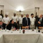 I locali del ristorante "San Domenico" finemente addobbati hanno accolto gli Accademici imolesi per il tradizionale scambio degli auguri natalizi. I piatti presentati da Valentino Mercattilii e da Massimiliano Mascia hanno pienamente soddisfatto le alte aspettative degli Accademici imolesi con il magnifico suggello finale di un raffinato dolce frutto (foto 4). Foto 1. Il Delegato Antonio Gaddoni illustra il menu. Foto 2. La sala del camino. Foto 3. Plauso finale alla brigata di cucina e sala col Vice Presidente Severino Sani e il Delegato Gaddoni.