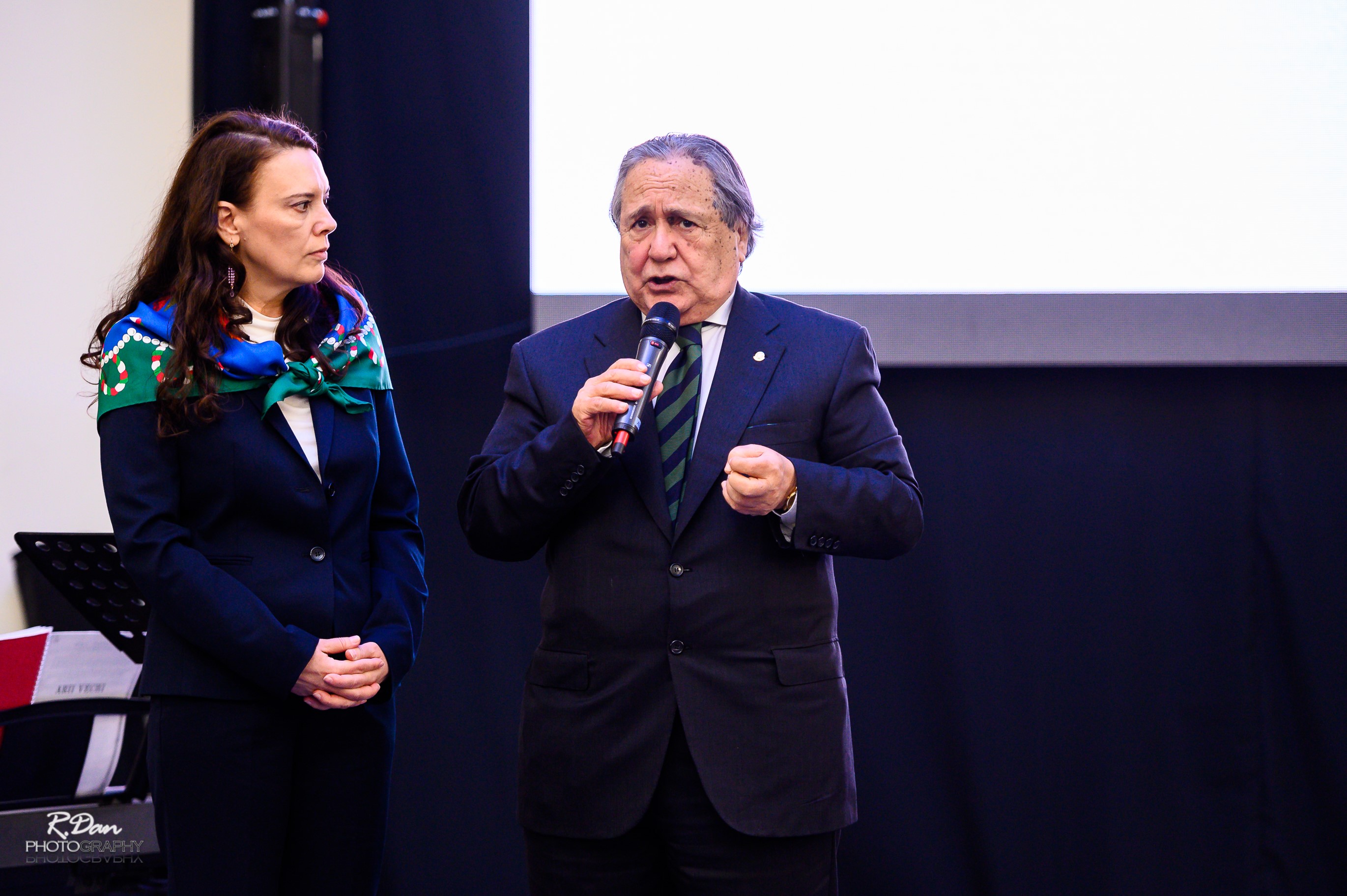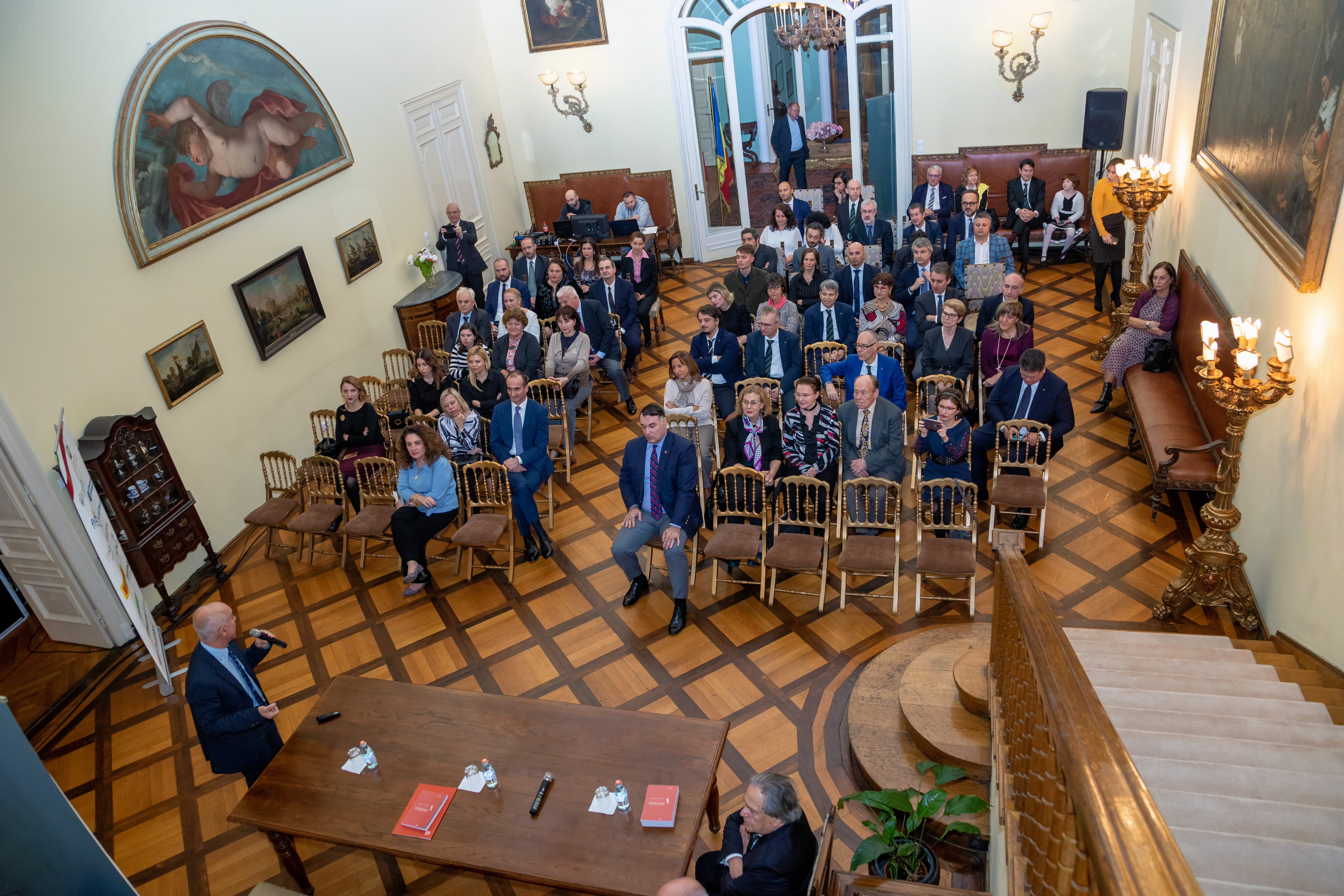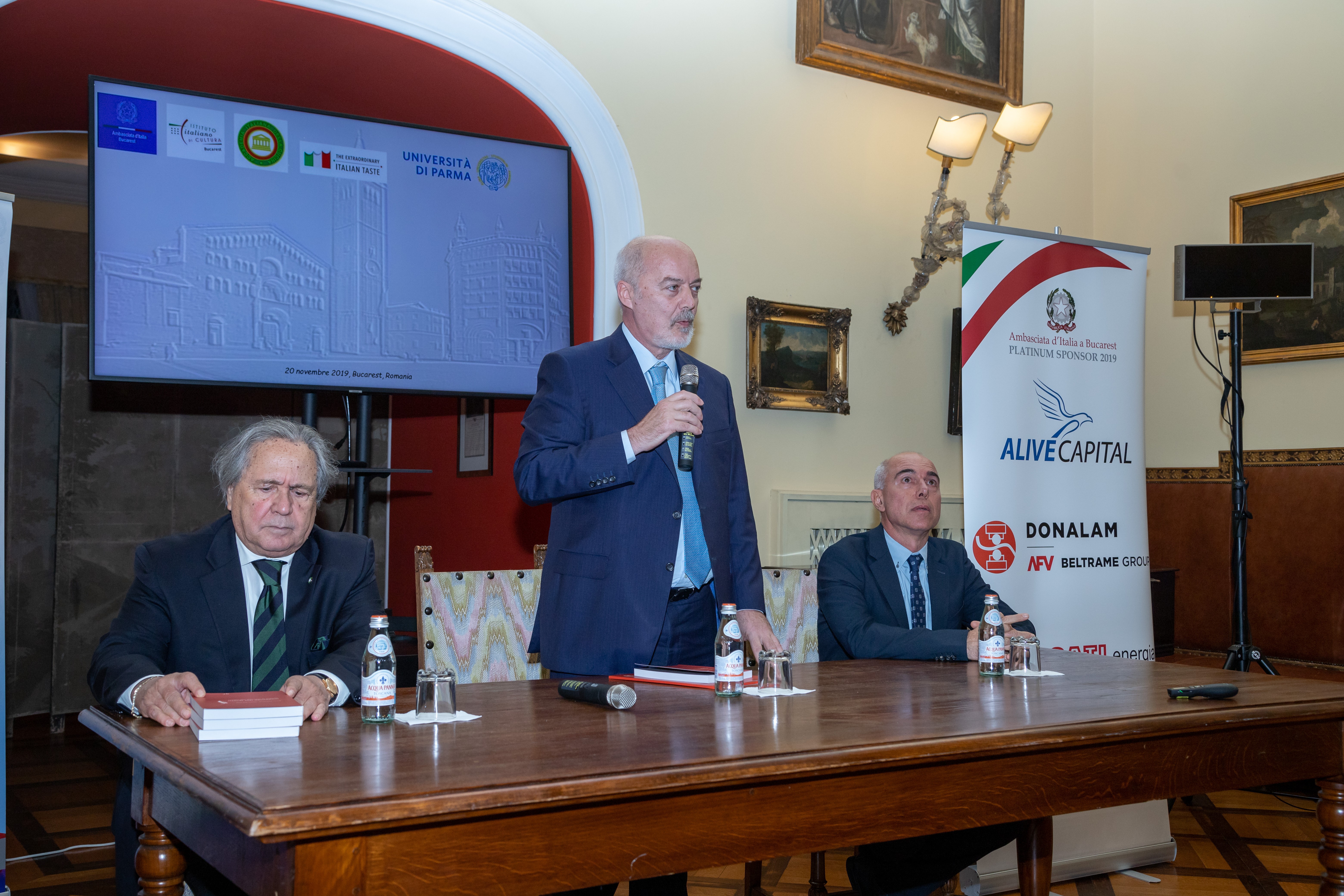 Anche in Romania, grande successo delle iniziative per la IV Settimana della Cucina organizzate organizzati dall’’Ambasciata d’Italia in Romania e l’Istituto Italiano di Cultura, in collaborazione con la Delegazione di Bucarest e la neo Legazione di Cluj. Il 19 novembre si è tenuta l'inaugurazione della mostra di grafica “Caffè” di Paolo Dalponte presso l’IIC, il 20 novembre la conferenza del prof. Gianni Galavena dal tema “Il gusto questione di chimica” con a seguire una cena buffet preparata dallo Chef Marco Favino. L’Ambasciata d’Italia, il Consolato di Cluj-Napoca, la Delegazione di Bucarest e la Legazione hanno organizzato un evento presso il Grand Hotel d’Italia di Cluj con una cena buffet preprata da molti ristoratori locali. Foto 1. In piedi, S.E. l'Ambasciatore d'Italia in Romania Marco Giungi, Accademico onorario di Bucarest. Alla sua destra il Delegato di Bucarest Luigi Zaccagnini e alla sua sinistra il prof. Gianni Galaverna. Foto 2. La Legata di Cluj Sanda Mihail e il Delegato Zaccagnini. Foto 3. Partecipanti al convegno. Foto 4. un momento della cena con l'Ambasciatore, il Console Onorario Massimo Novali (secondo da sinistra), il Delegato e la Legata e Accademici.