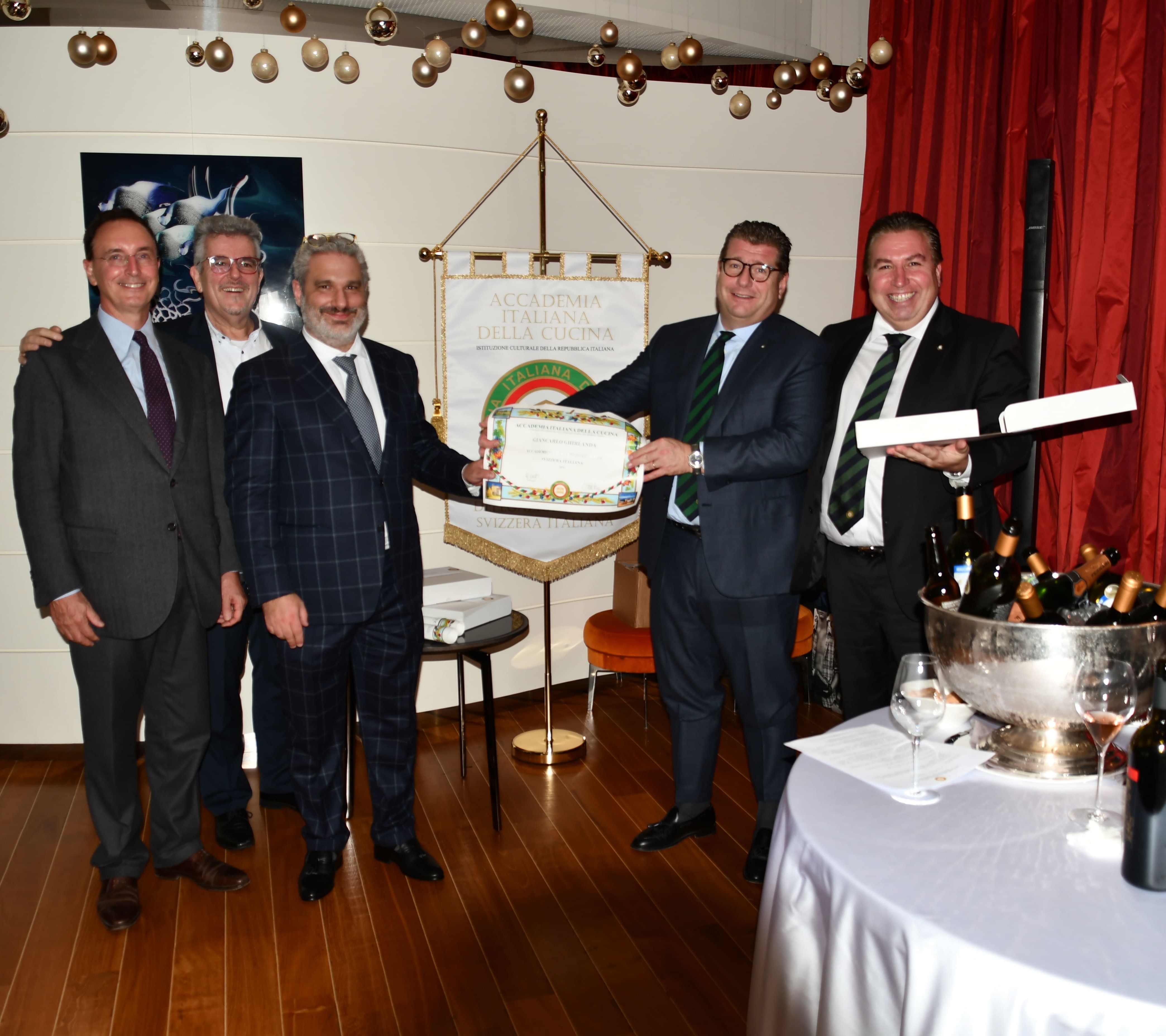 La Delegazione della Svizzera Italiana si è ritrovata presso il ristorante dell’Hotel The View a Paradiso per l’ultima riunione conviviale del 2019. Ospite della serata Ivo Monti, designato "Icona del vino svizzero" 2019 da Gault & Millau, che ha svelato alcuni segreti del suo successo. Foto 1(da sinistra). Nuovi Accademici Antonio Monti, Luca Soldati, Giancarlo Ghirlanda, il Vice Delegato Massimo Ciocco e il Delegato Emilio Casati. Foto 2(da sinistra). Ospite Ivo Monti, la Consultrice Marta Lenzi Repetto, lo chef Grandi e il Consultore Giovanni Frey. Foto 4. Il Delegato Emilio Casati e il Delegato onorario Paolo Grandi. Foto 4. Carpaccio di tonno al lemongras e zenzero con tartare di gambero rosso, avocado, germogli novelli.